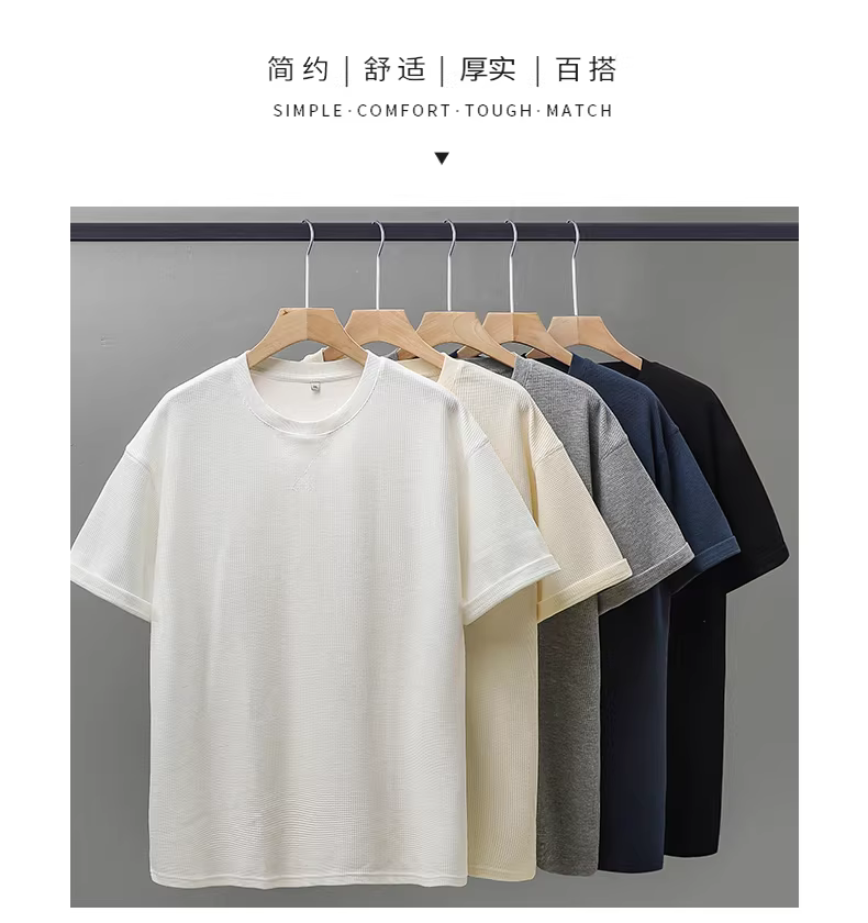 Áo thun nam tay ngắn kiểu waffle dày dặn, dáng tam giác ngược, phong cách retro Mỹ, mới, mùa hè, chất liệu thun trơn, kiểu dáng rộng rãi, thoải mái.