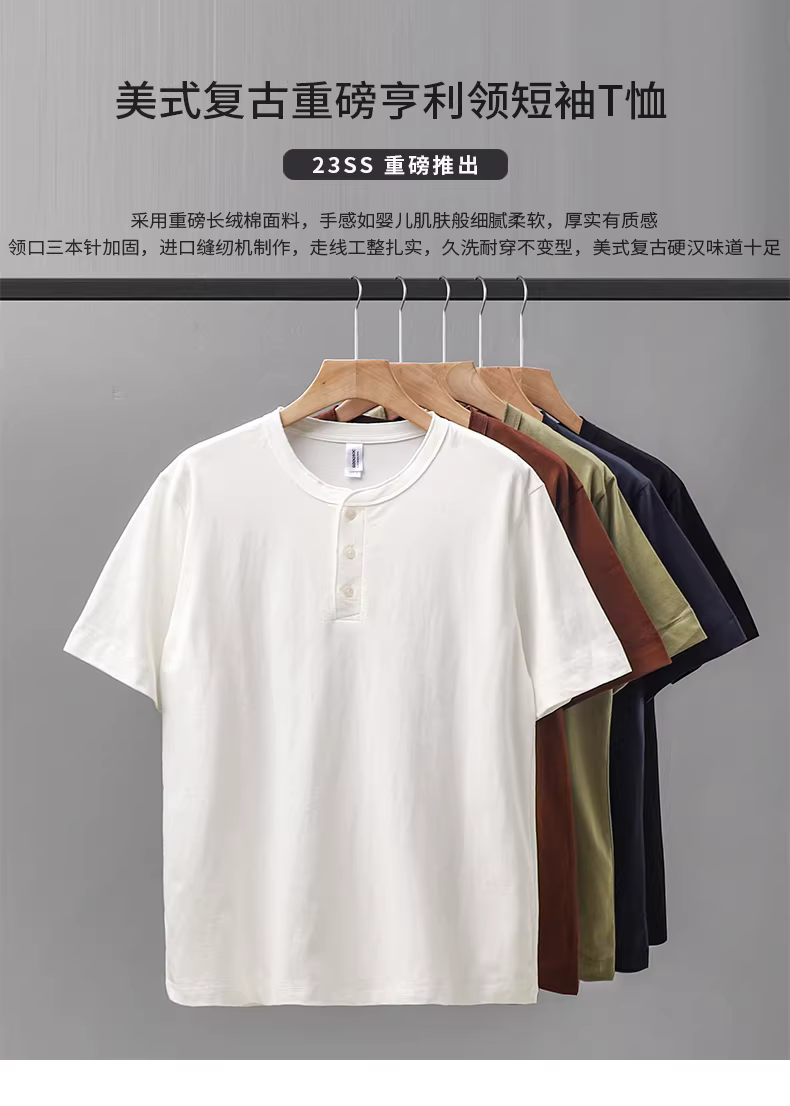 Áo thun ngắn tay cổ henley hạng nặng kiểu Mỹ dành cho nam, áo thun cổ tròn cổ tròn nửa tay cổ điển mùa hè Amekaji bằng cotton nguyên chất