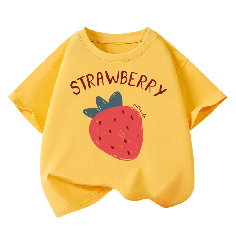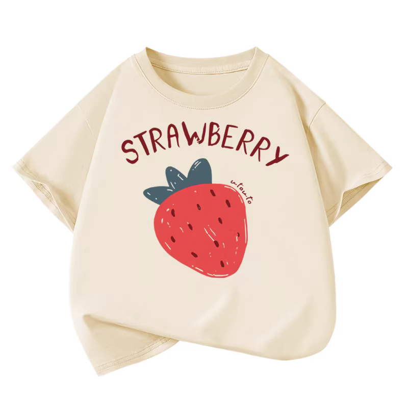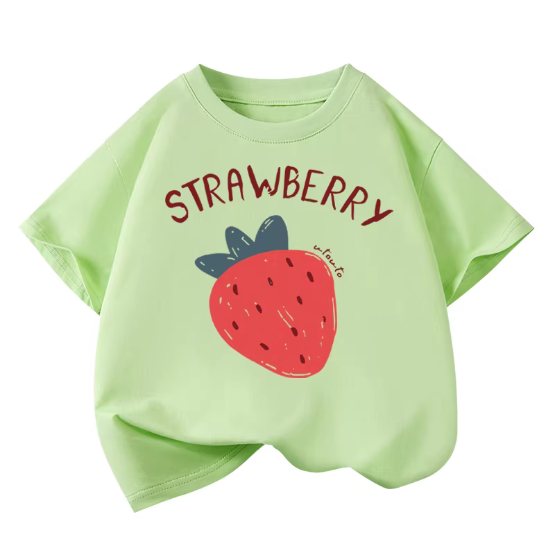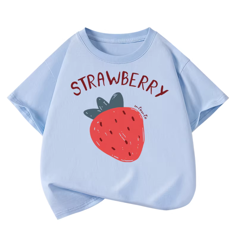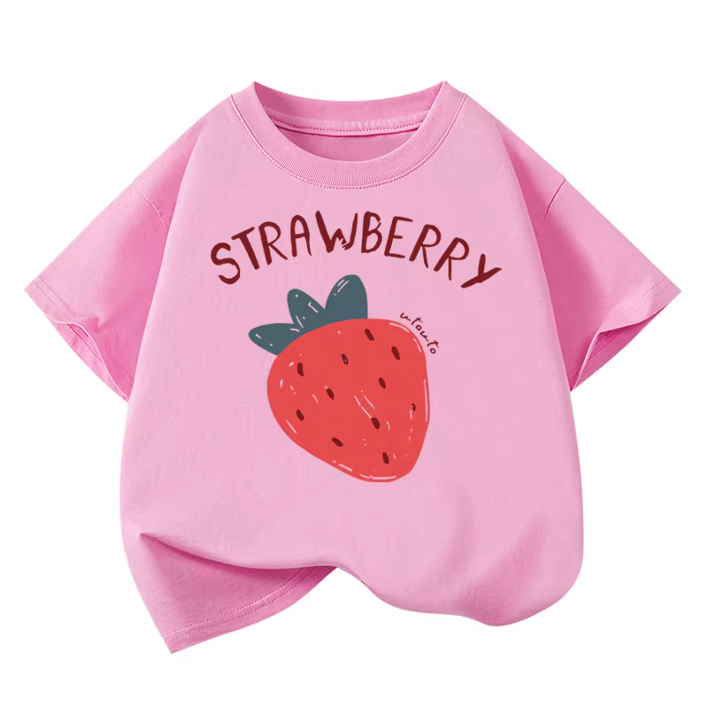 Áo thun ngắn tay cotton nguyên chất Little Hope dành cho bé gái, mùa hè, kiểu dáng xu hướng, cổ tròn, tay lửng, rộng rãi, họa tiết dâu tây