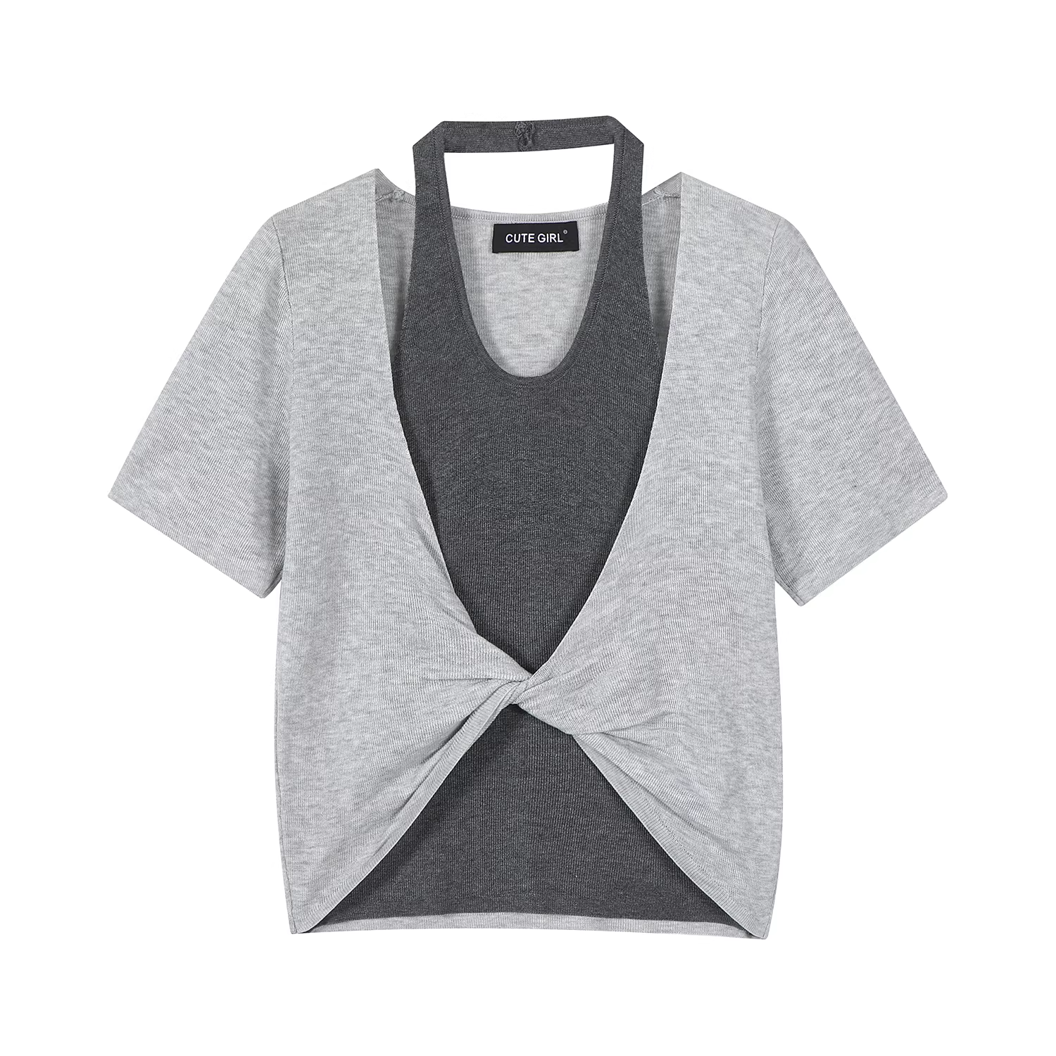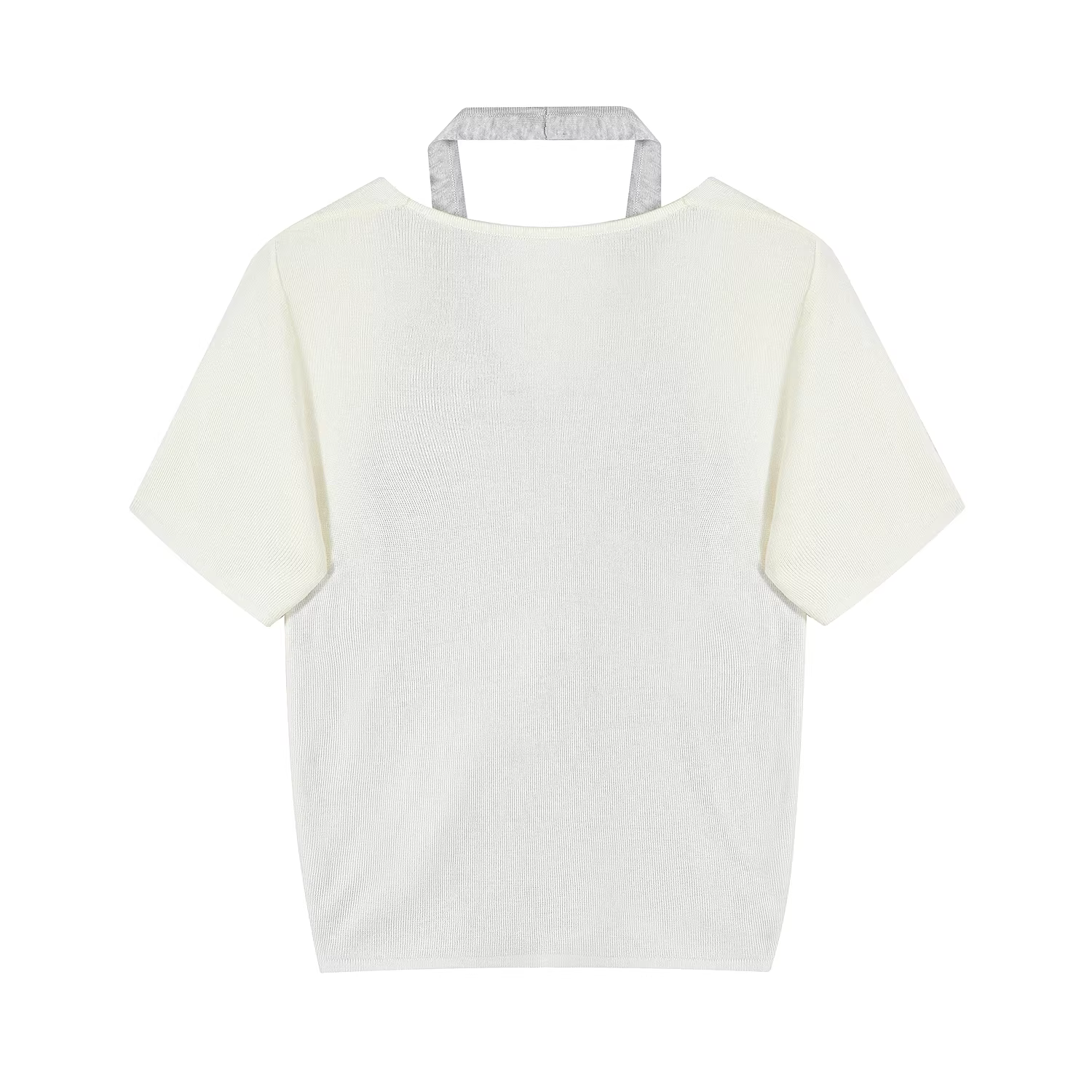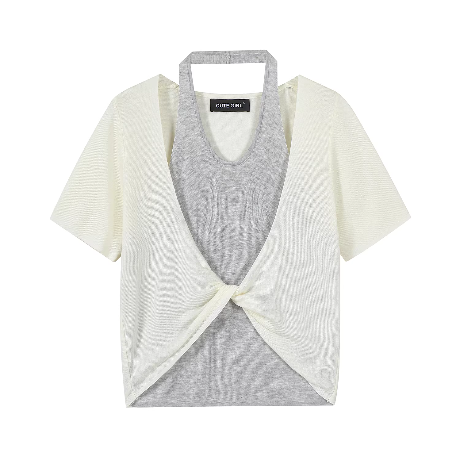 Áo thun ngắn tay dệt kim cổ yếm xoắn độc đáo theo phong cách Hàn Quốc dành cho nữ, áo hai mảnh giả phối màu mùa hè