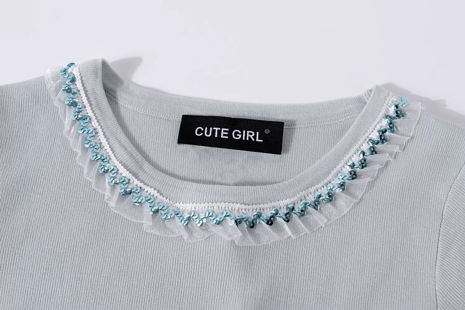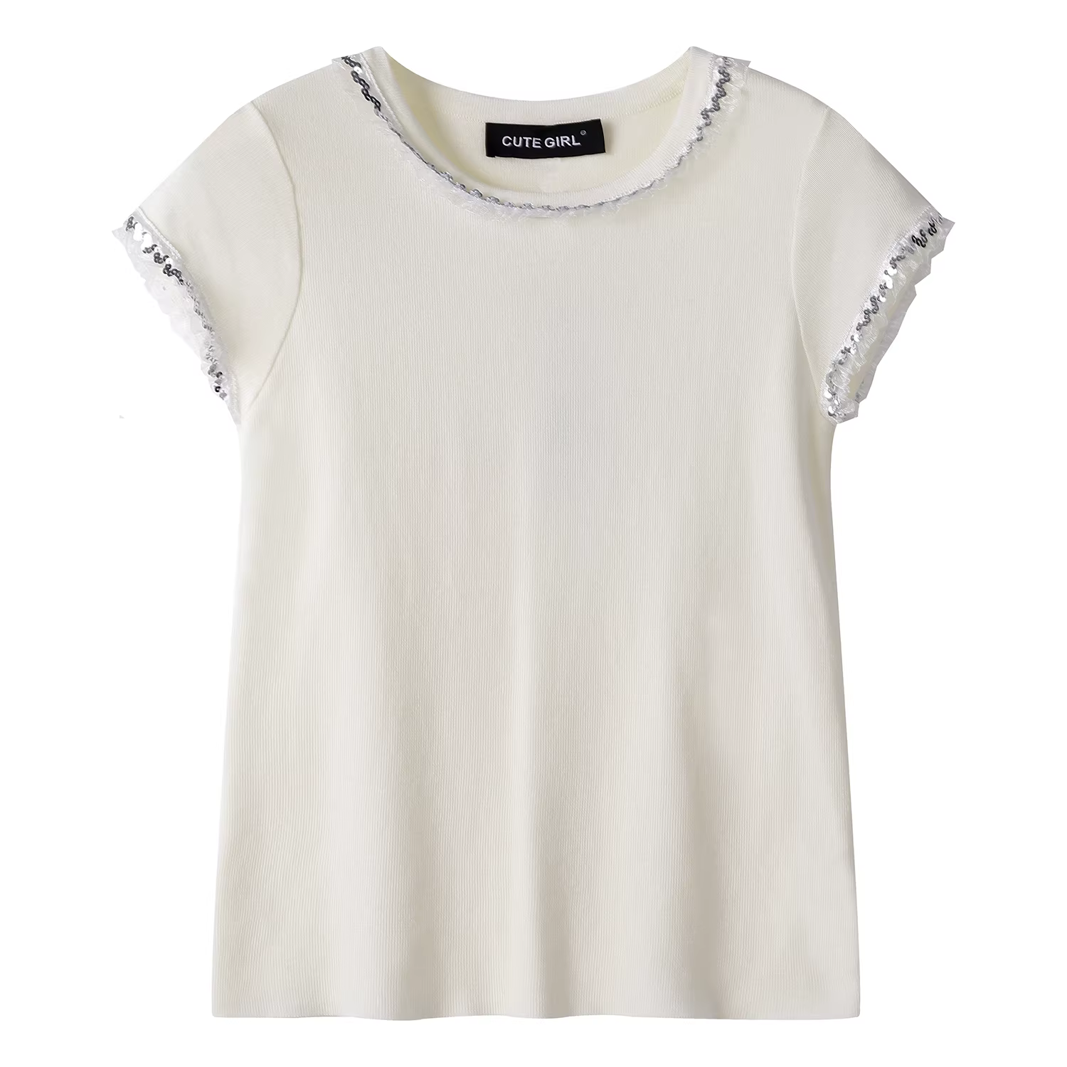 - Áo thun ngắn tay dệt kim ren sequin màu xanh lá cây cao cấp phong cách Hàn Quốc dành cho nữ mùa hè