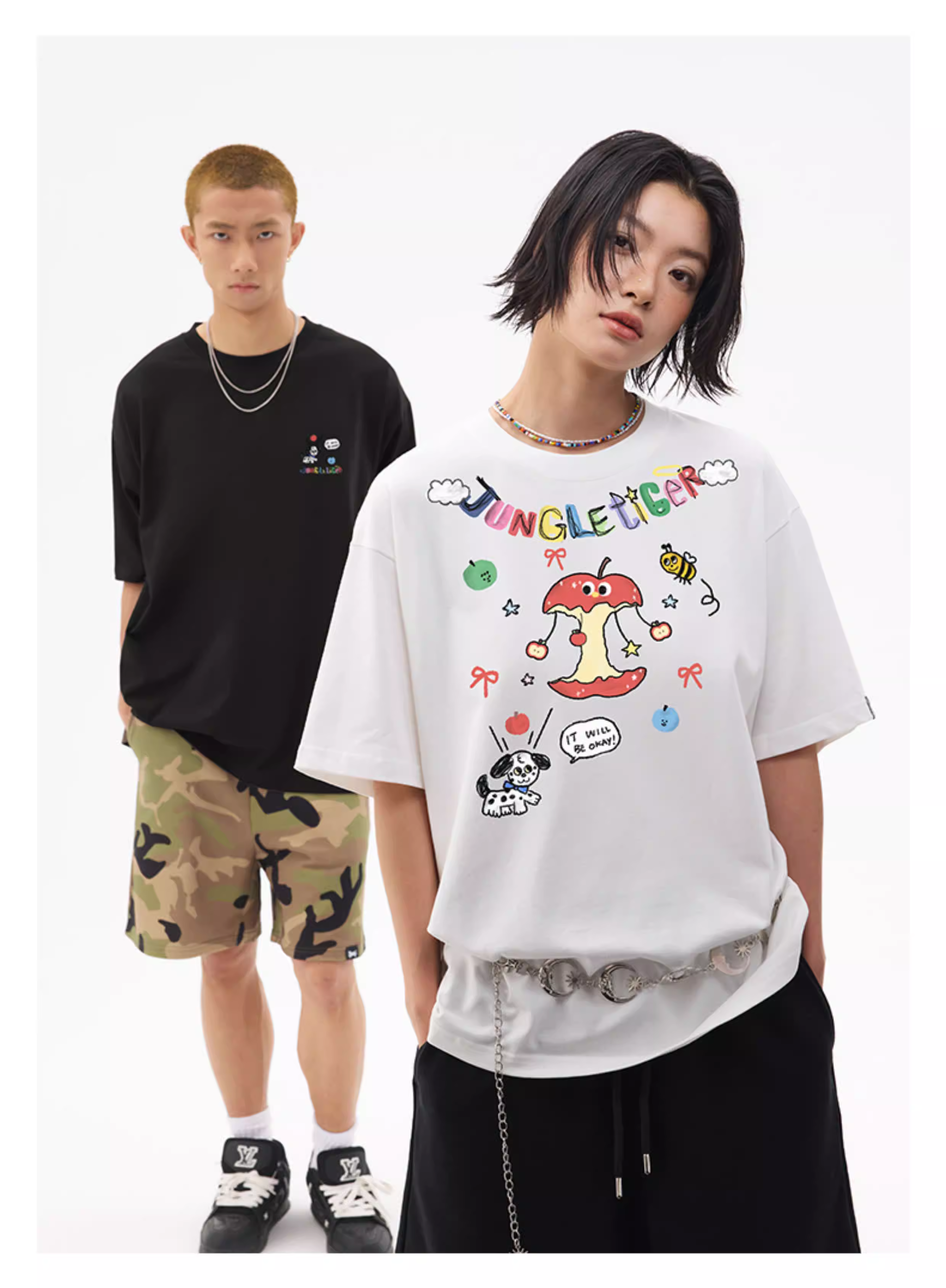 Áo thun ngắn tay họa tiết graffiti hoạt hình hổ rừng dành cho nam mùa hè 2025 phong cách Mỹ, trang phục cặp đôi, áo trắng
