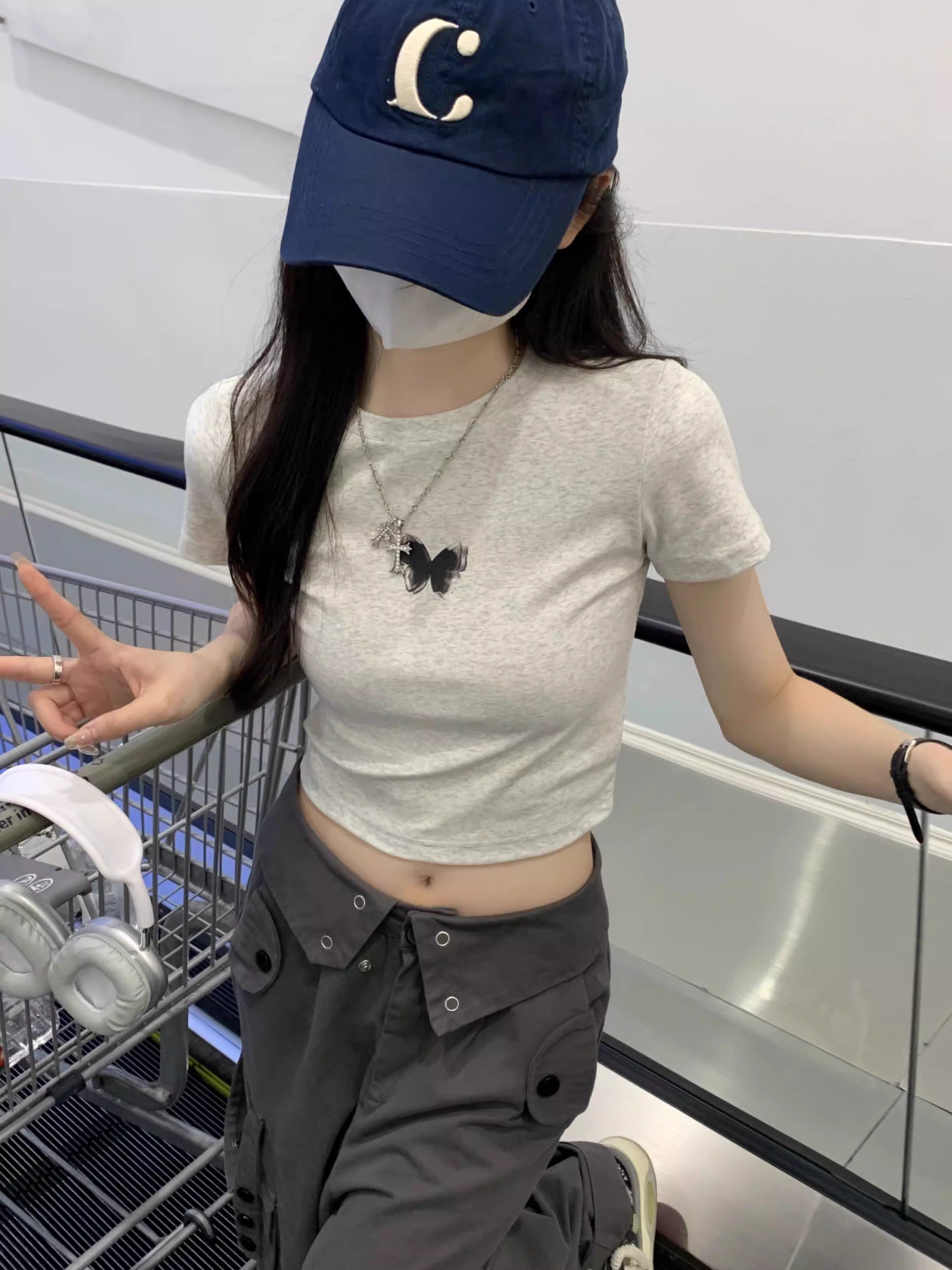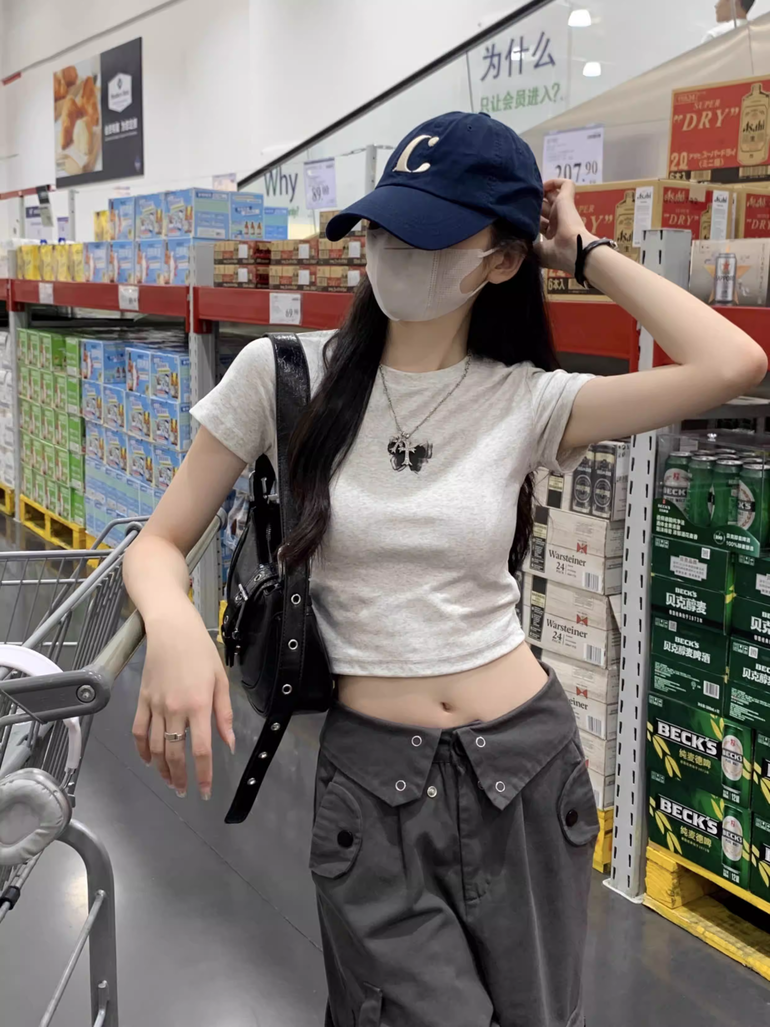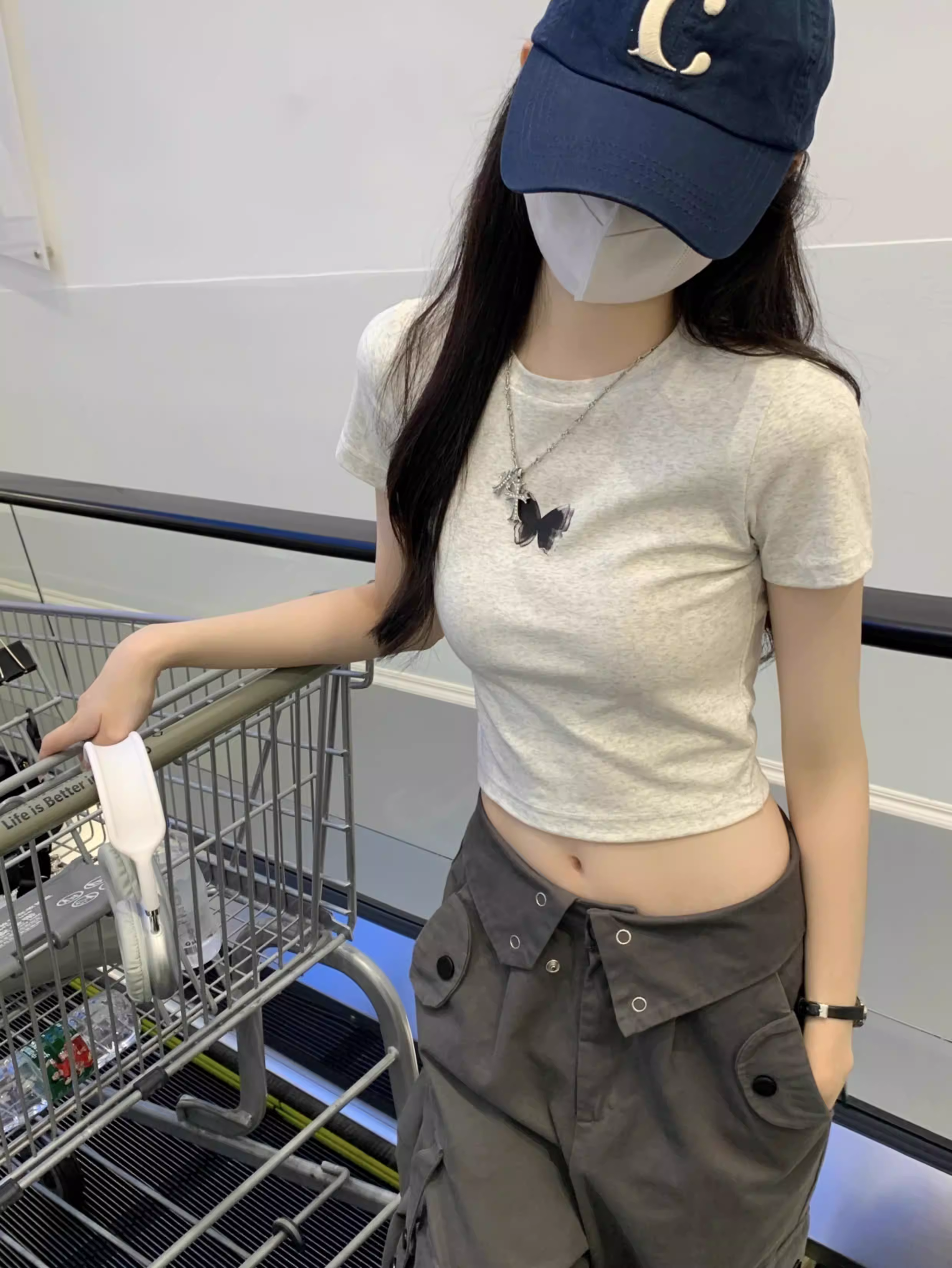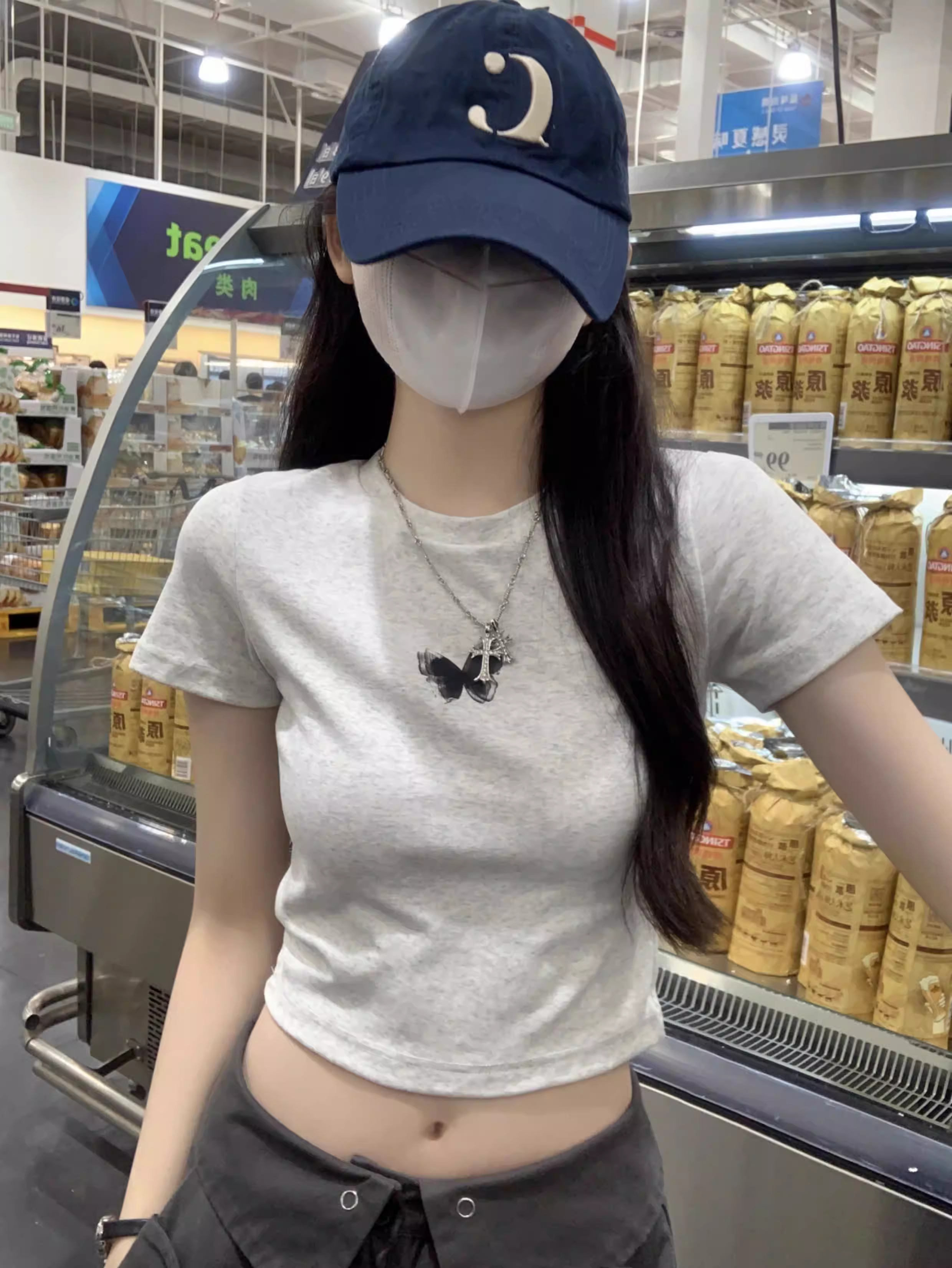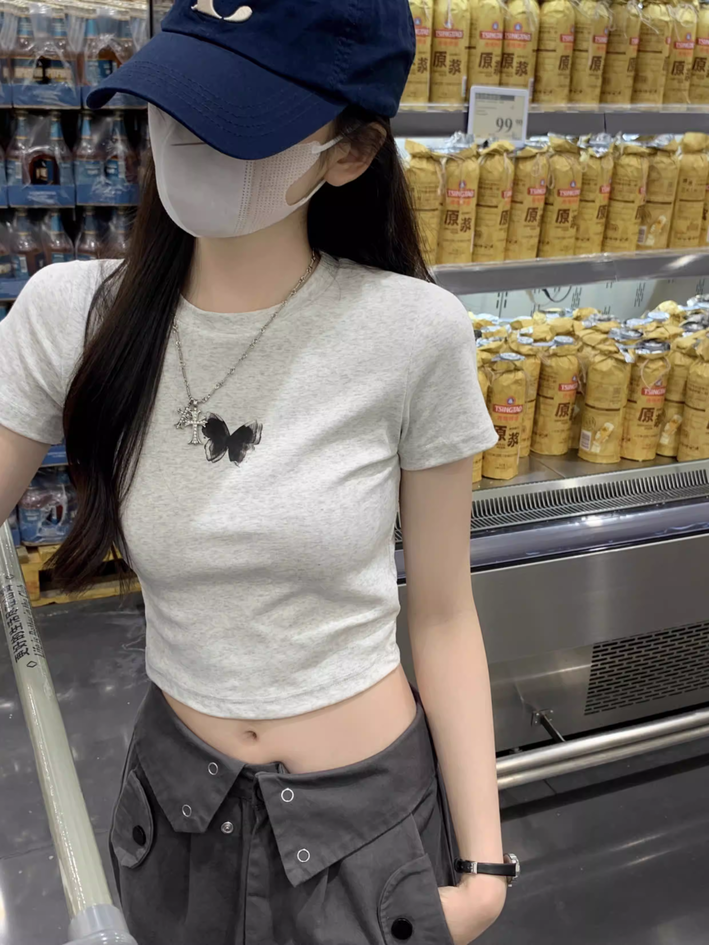 Áo thun ngắn tay in họa tiết La Chapelle màu xám dành cho nữ, áo crop top ôm sát mới mùa hè 2025 khoe rốn.