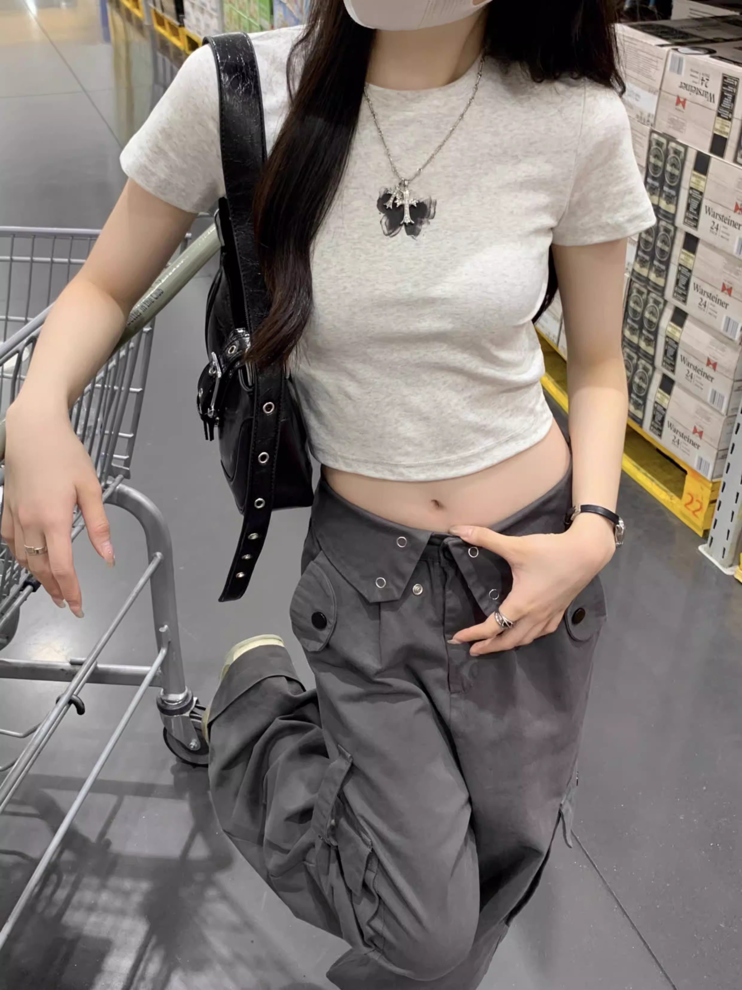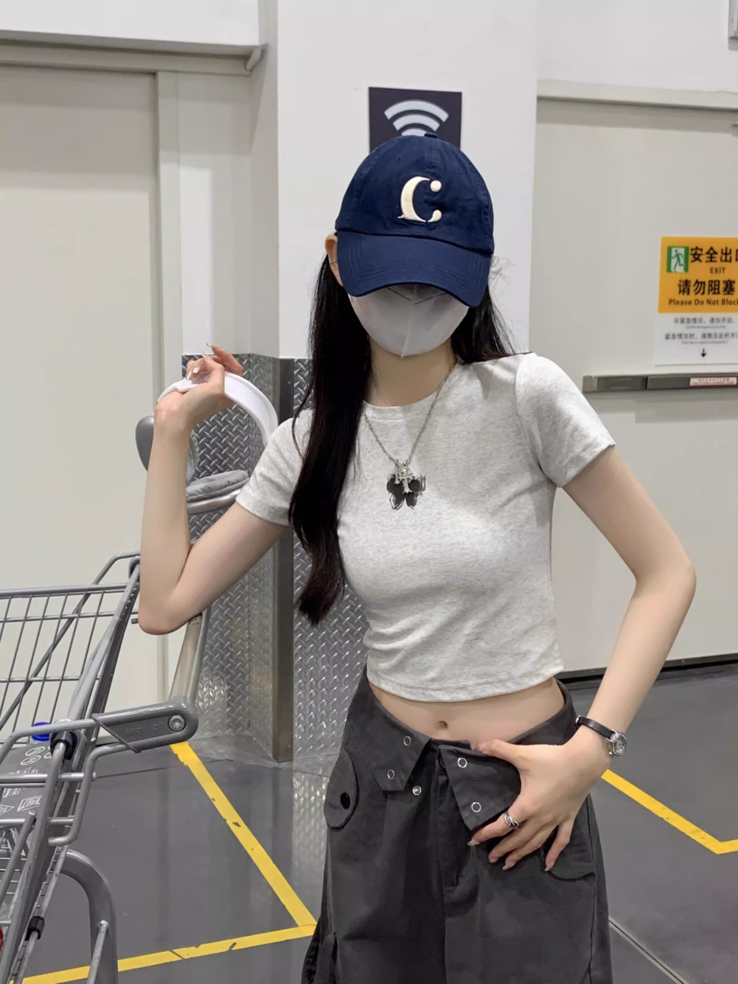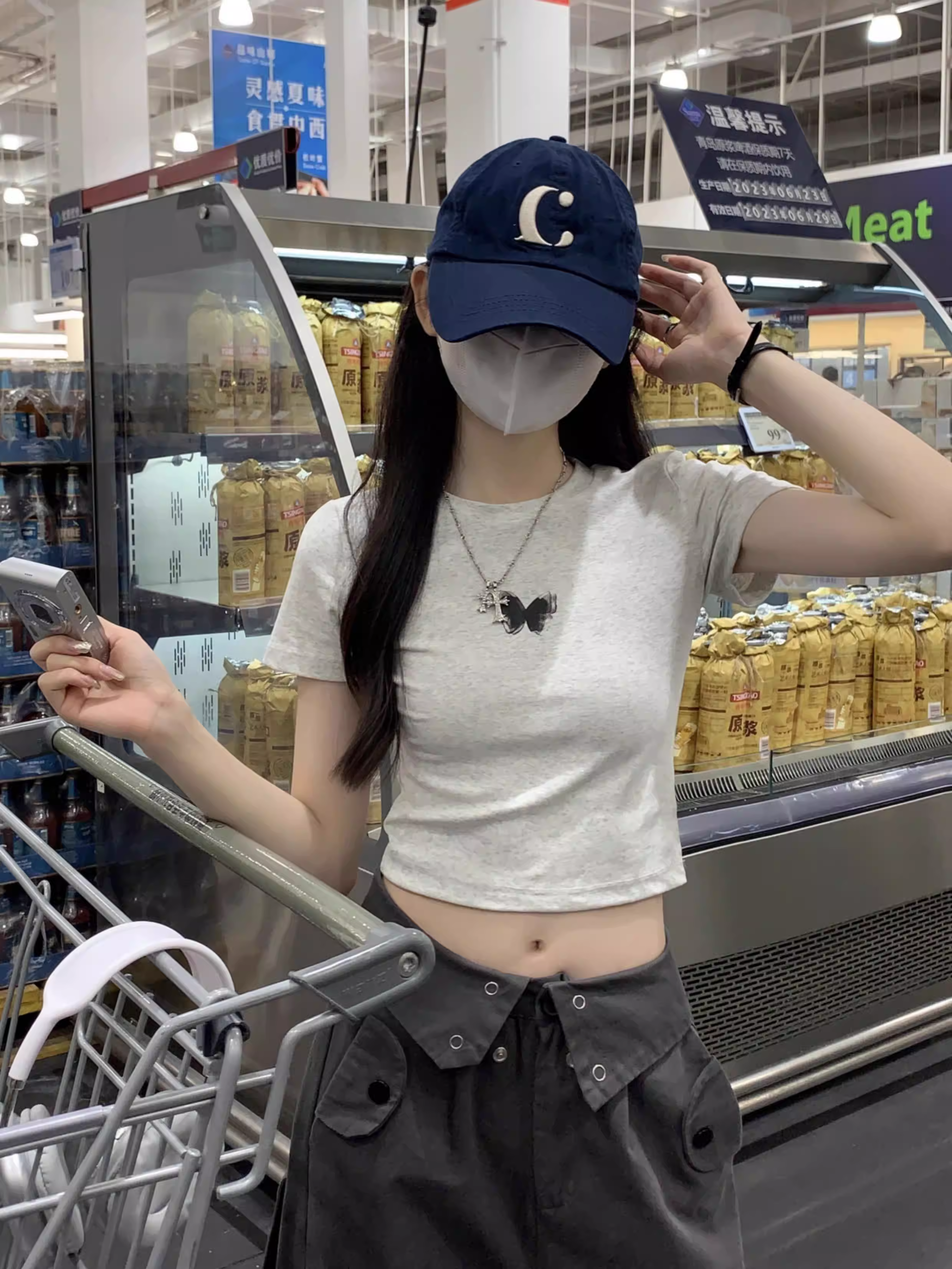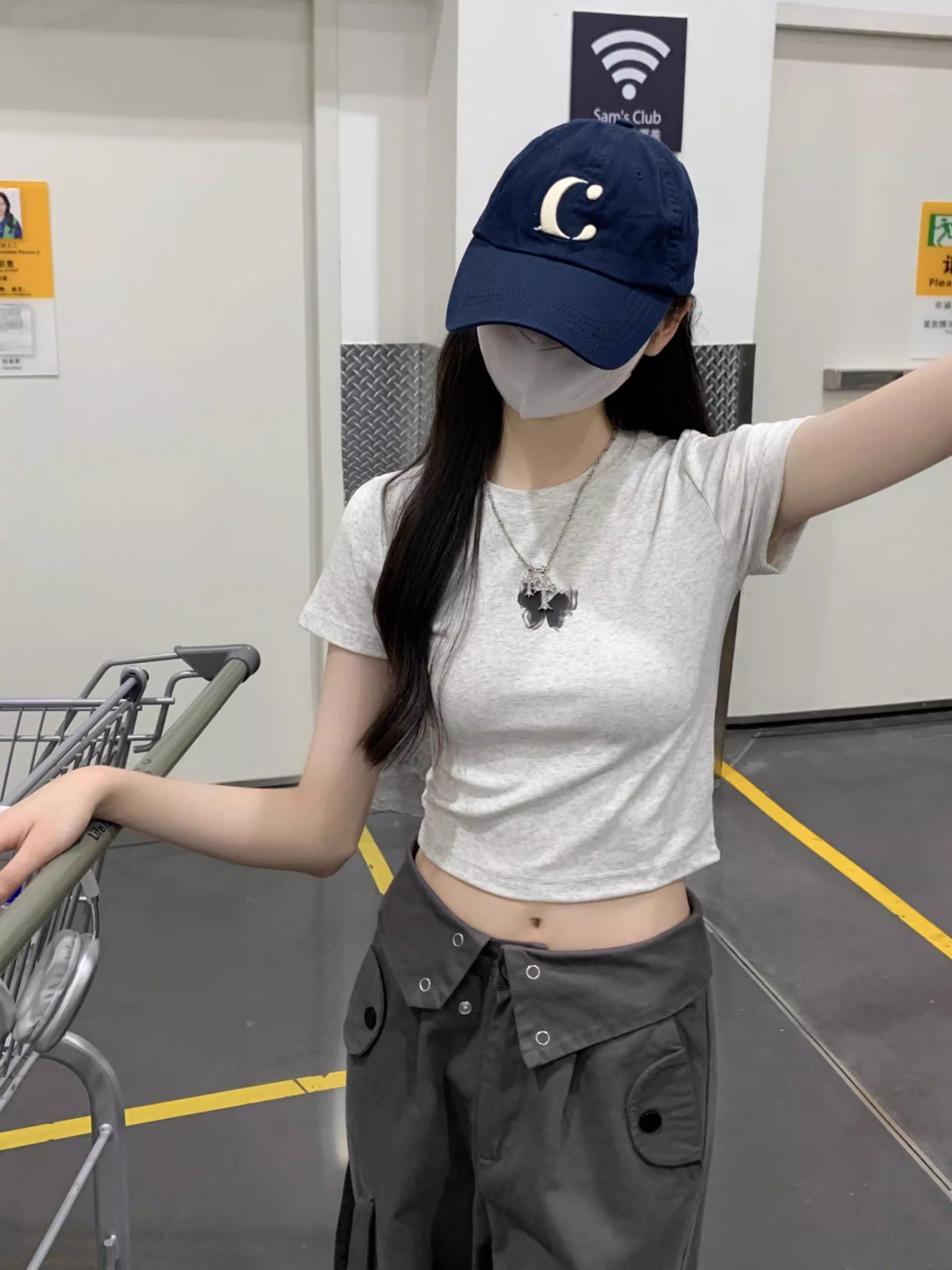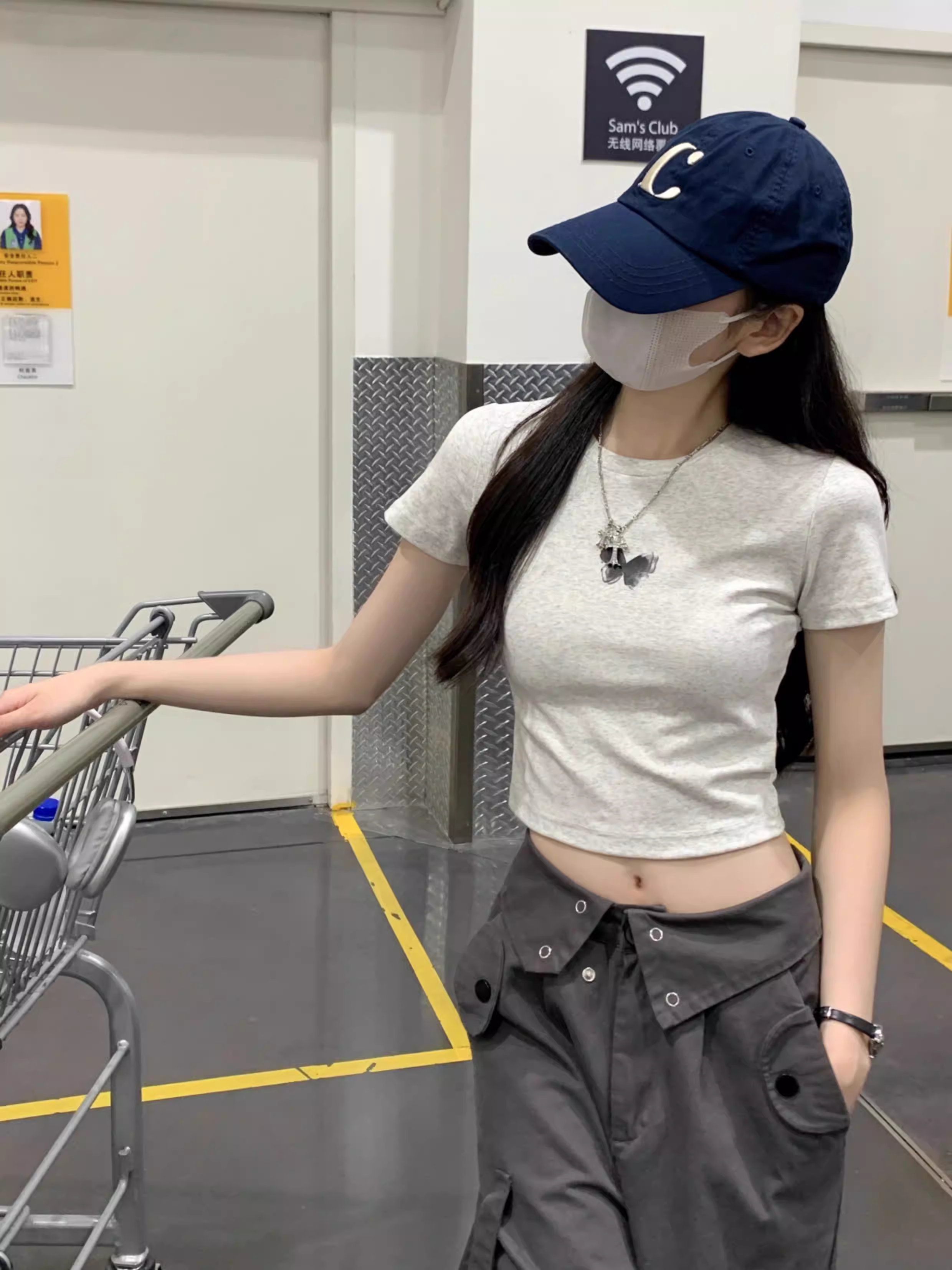 Áo thun ngắn tay in họa tiết La Chapelle màu xám dành cho nữ, áo crop top ôm sát mới mùa hè 2025 khoe rốn.
