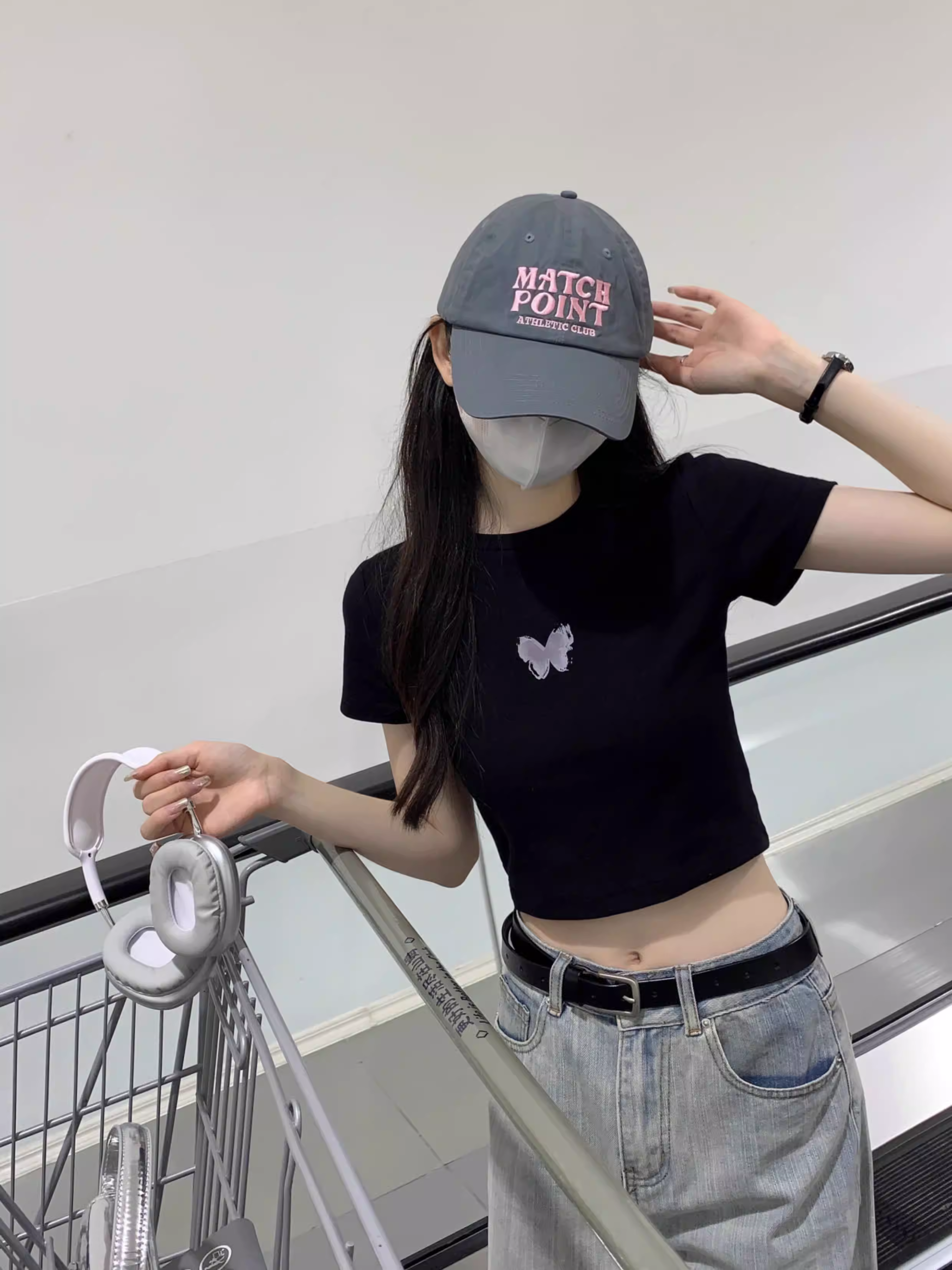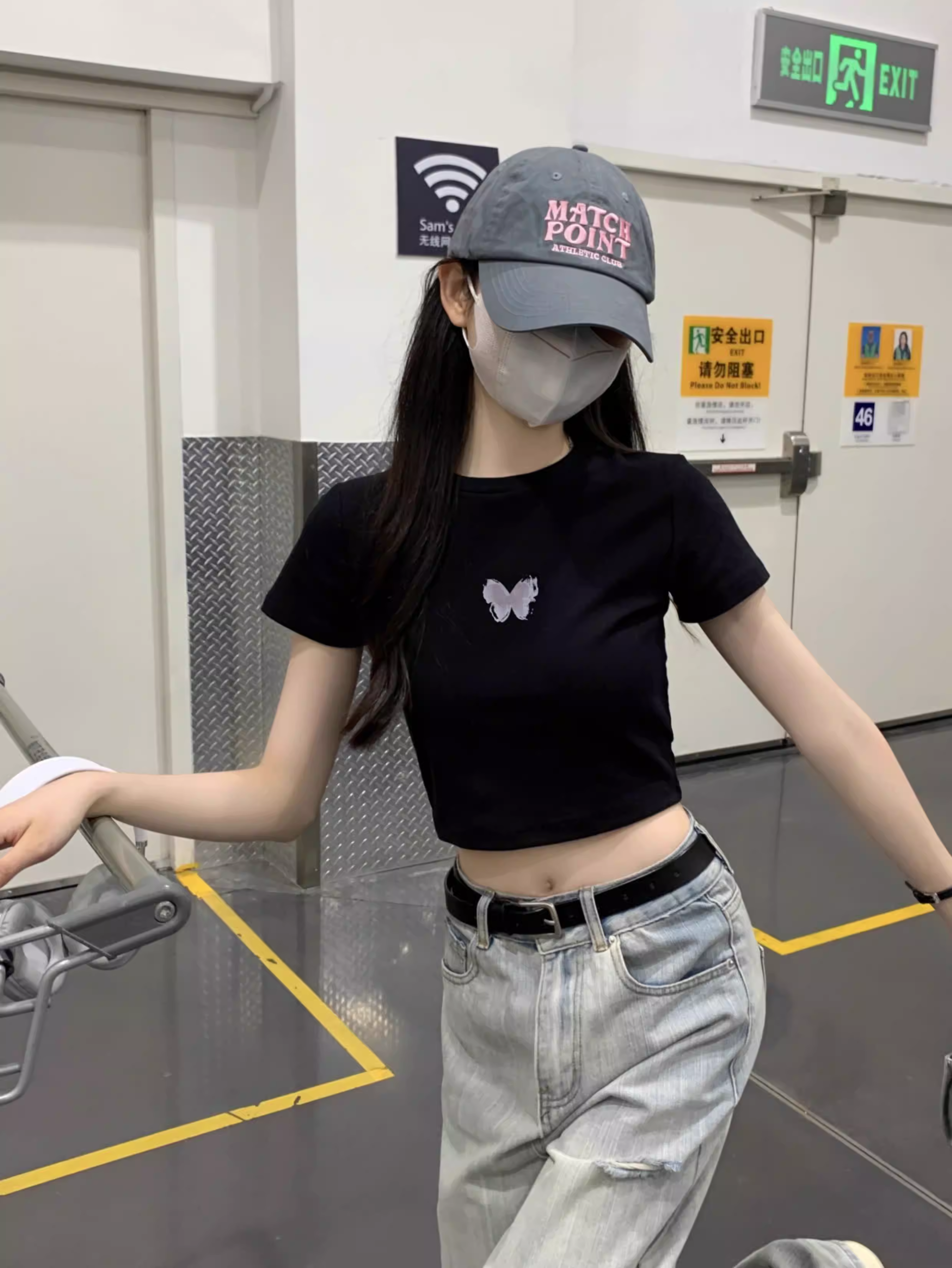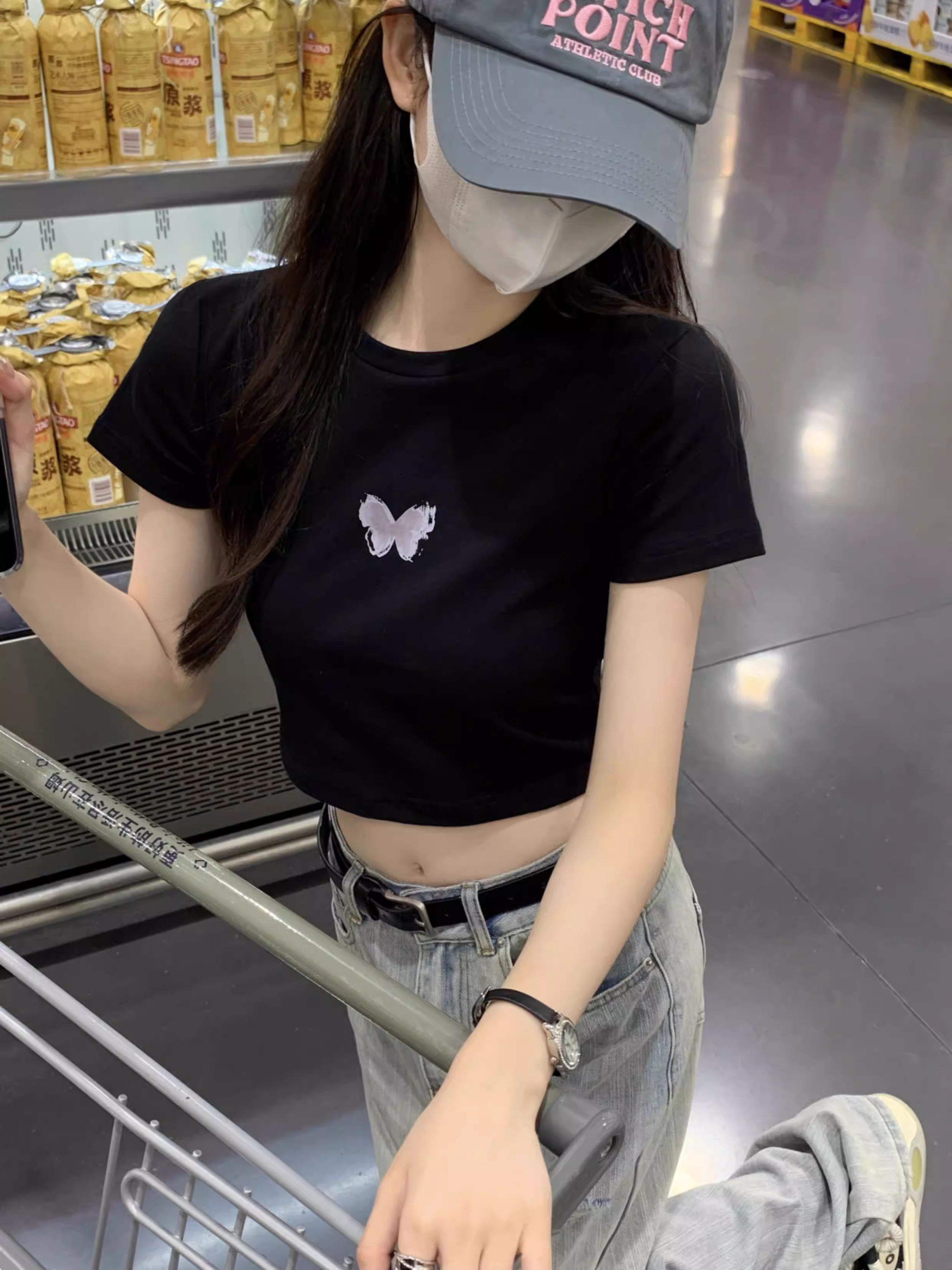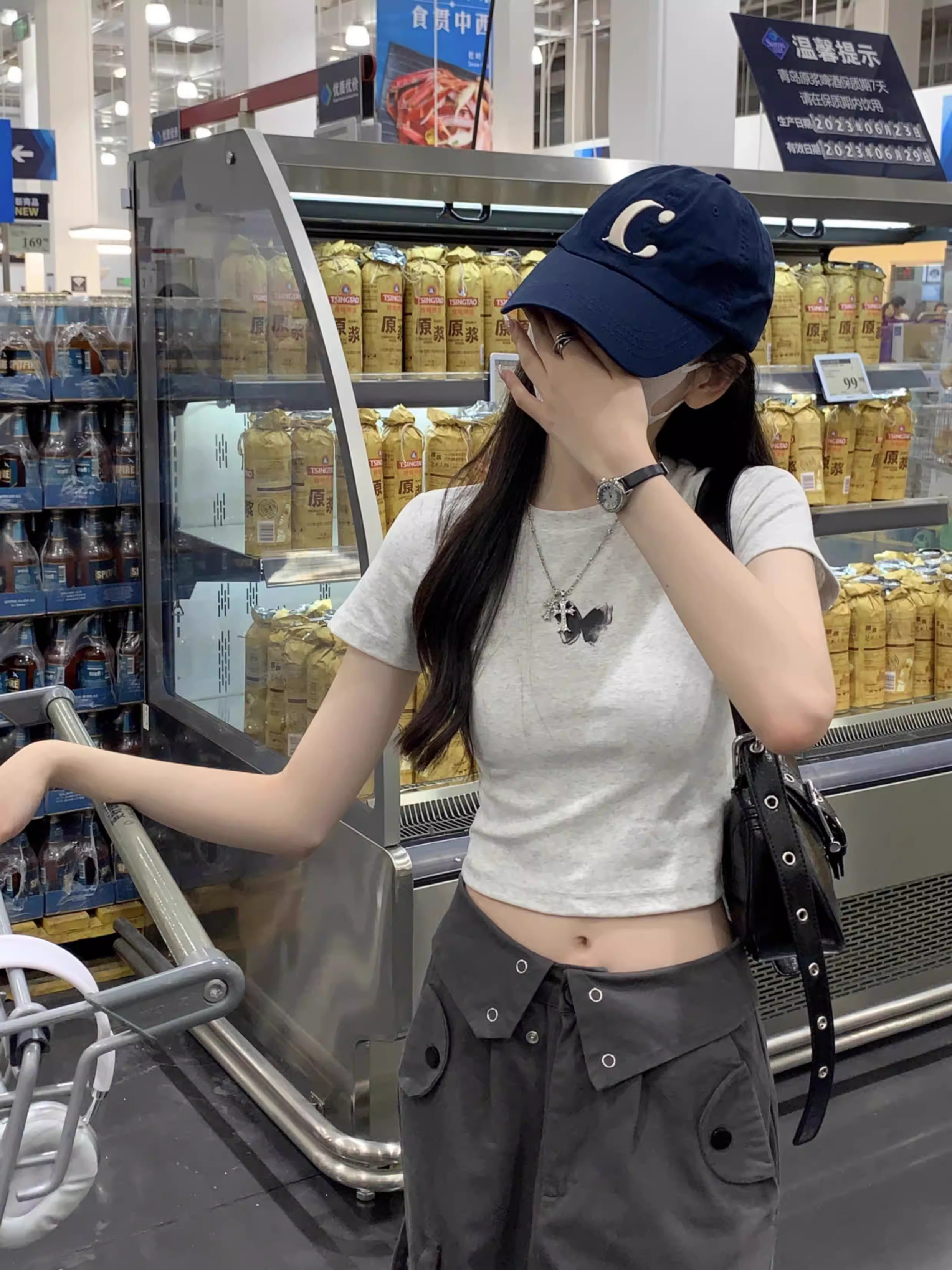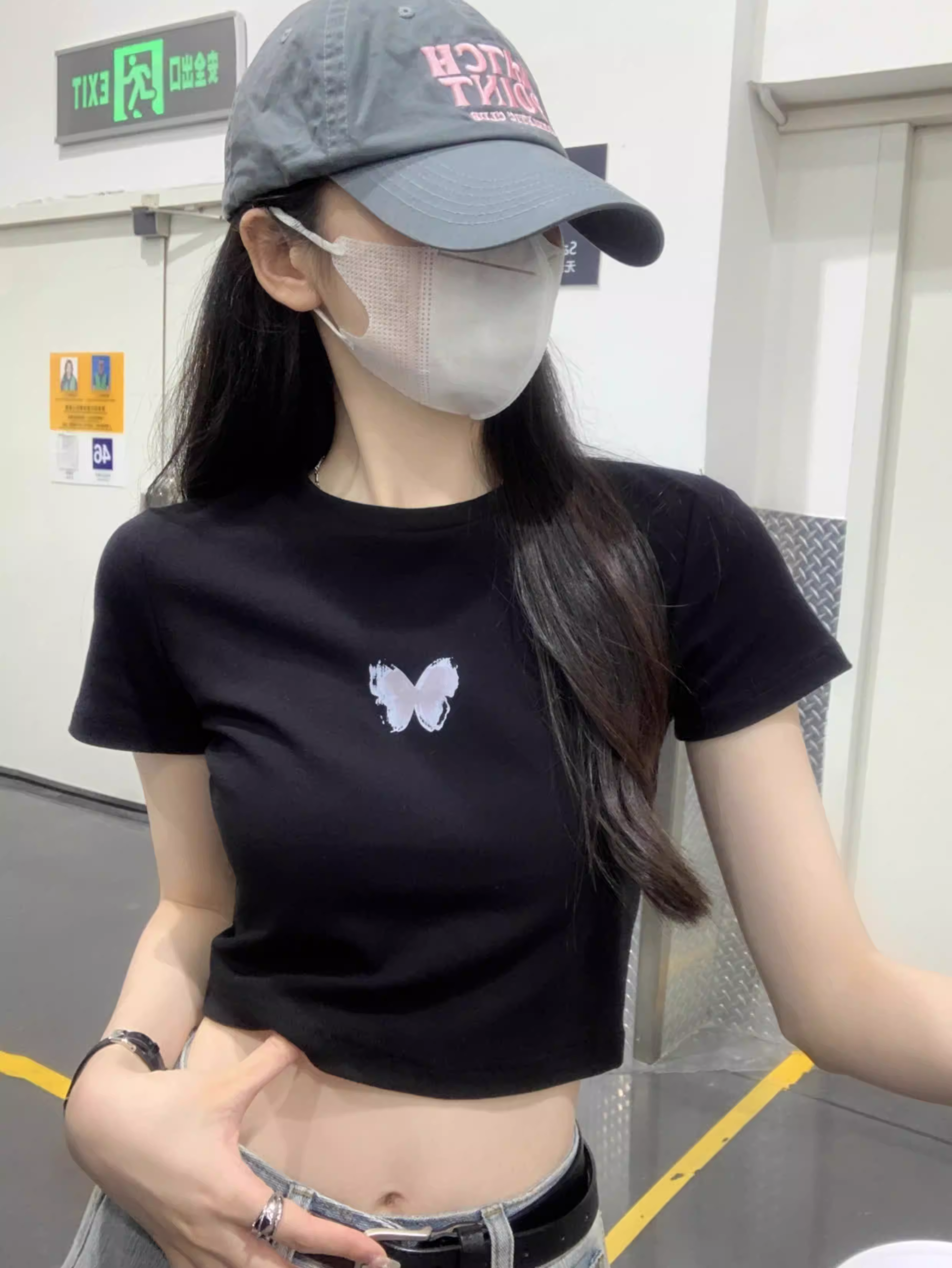 Áo thun ngắn tay in họa tiết La Chapelle màu xám dành cho nữ, áo crop top ôm sát mới mùa hè 2025 khoe rốn.