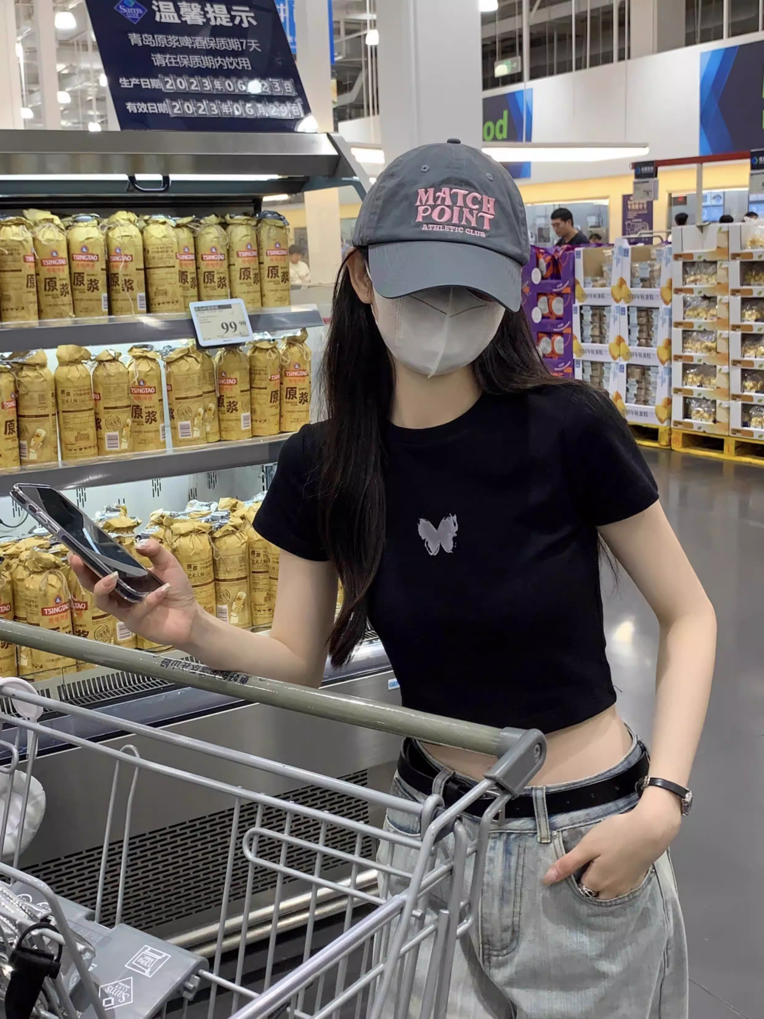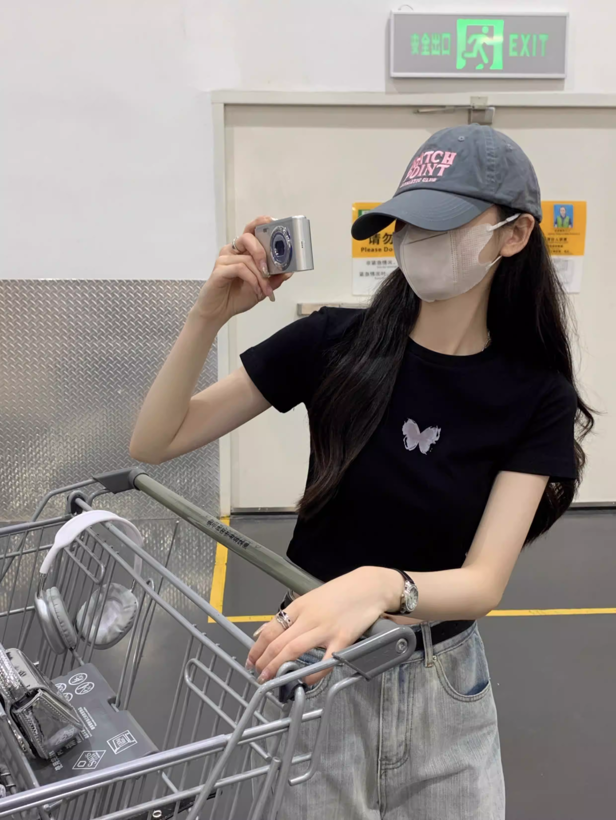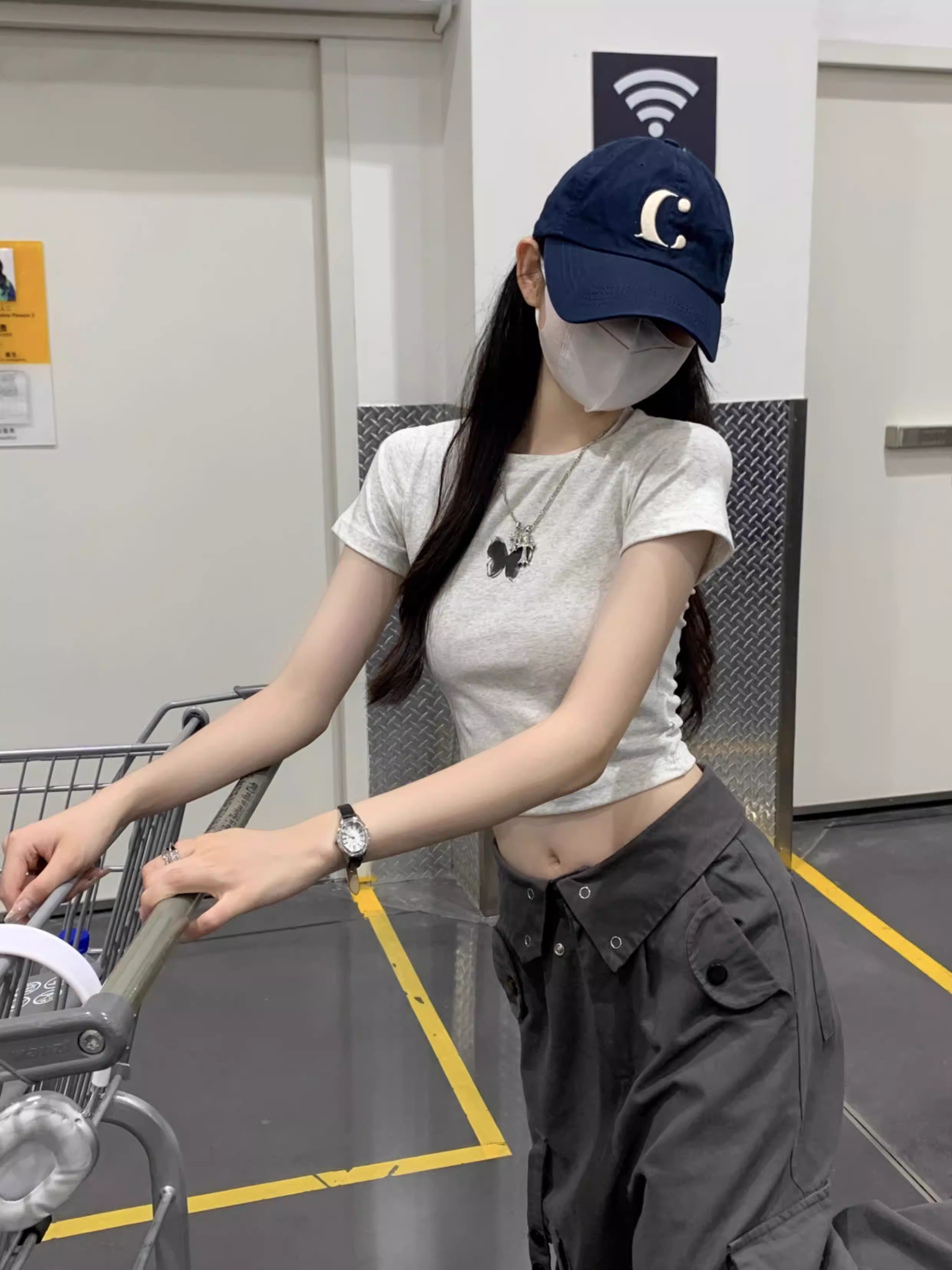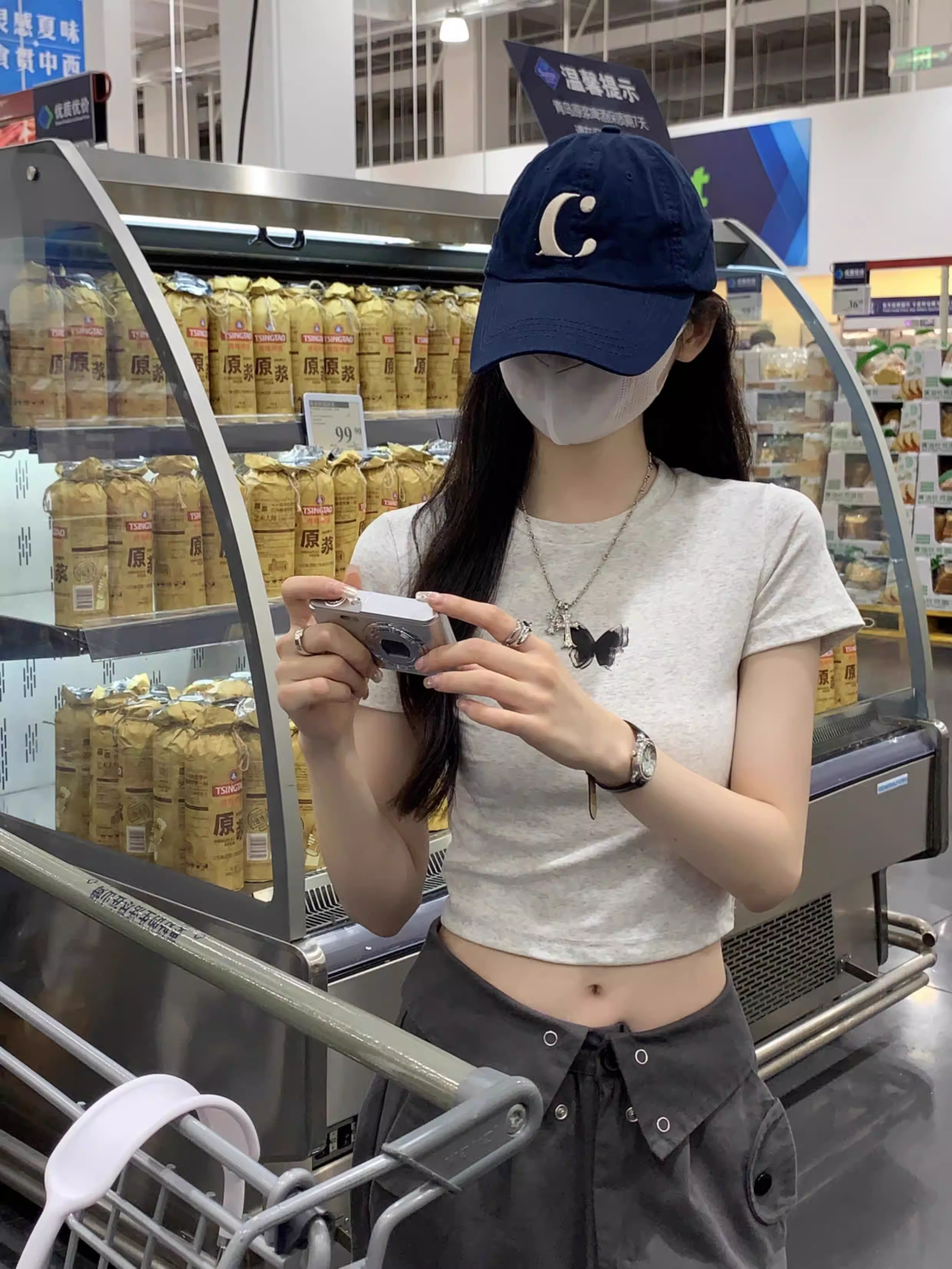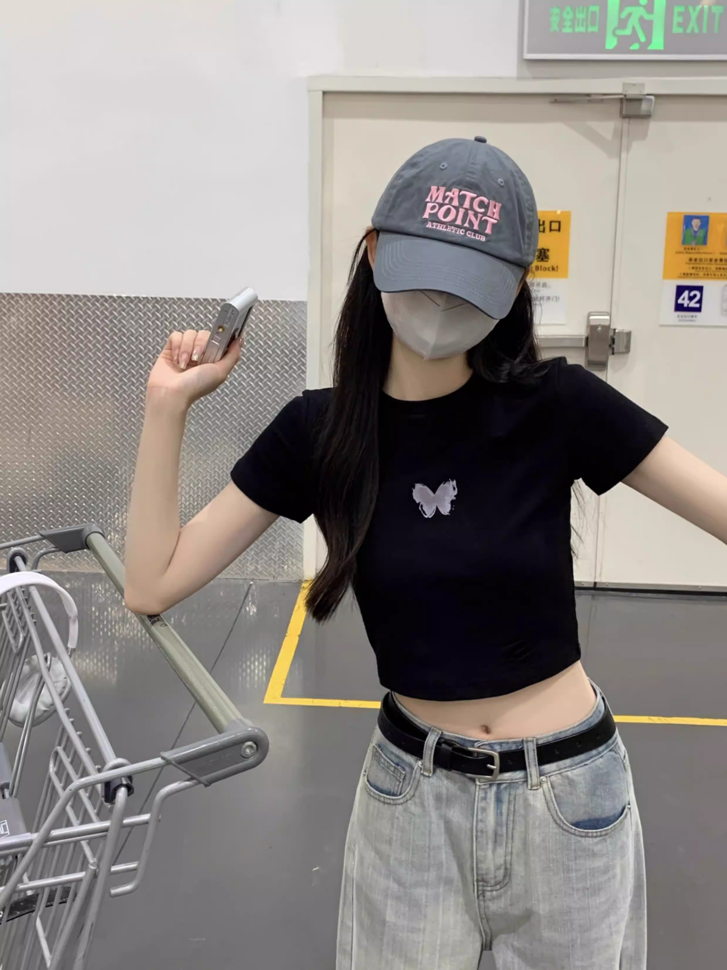 Áo thun ngắn tay in họa tiết La Chapelle màu xám dành cho nữ, áo crop top ôm sát mới mùa hè 2025 khoe rốn.