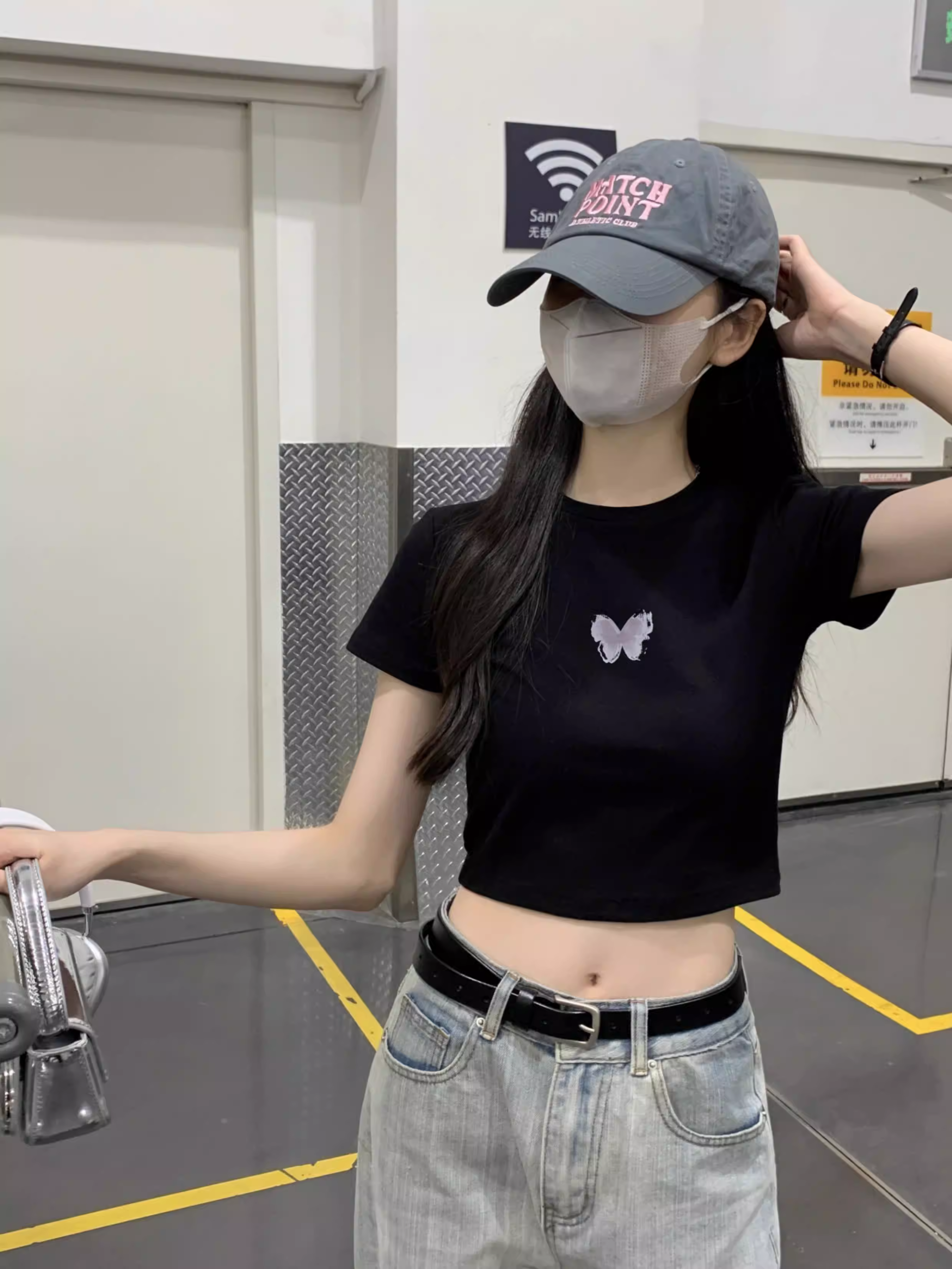 - Áo thun ngắn tay in họa tiết La Chapelle màu xám dành cho nữ, áo crop top ôm sát mới mùa hè 2025 khoe rốn.