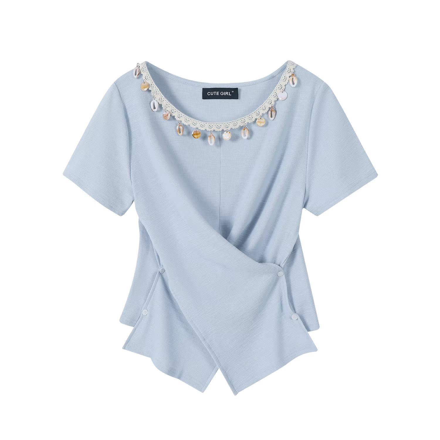 Áo thun ngắn tay kiểu bohemian bất đối xứng kiểu dáng bohemian dành cho nữ, xu hướng hàng đầu đầu mùa hè độc đáo và đẹp mắt