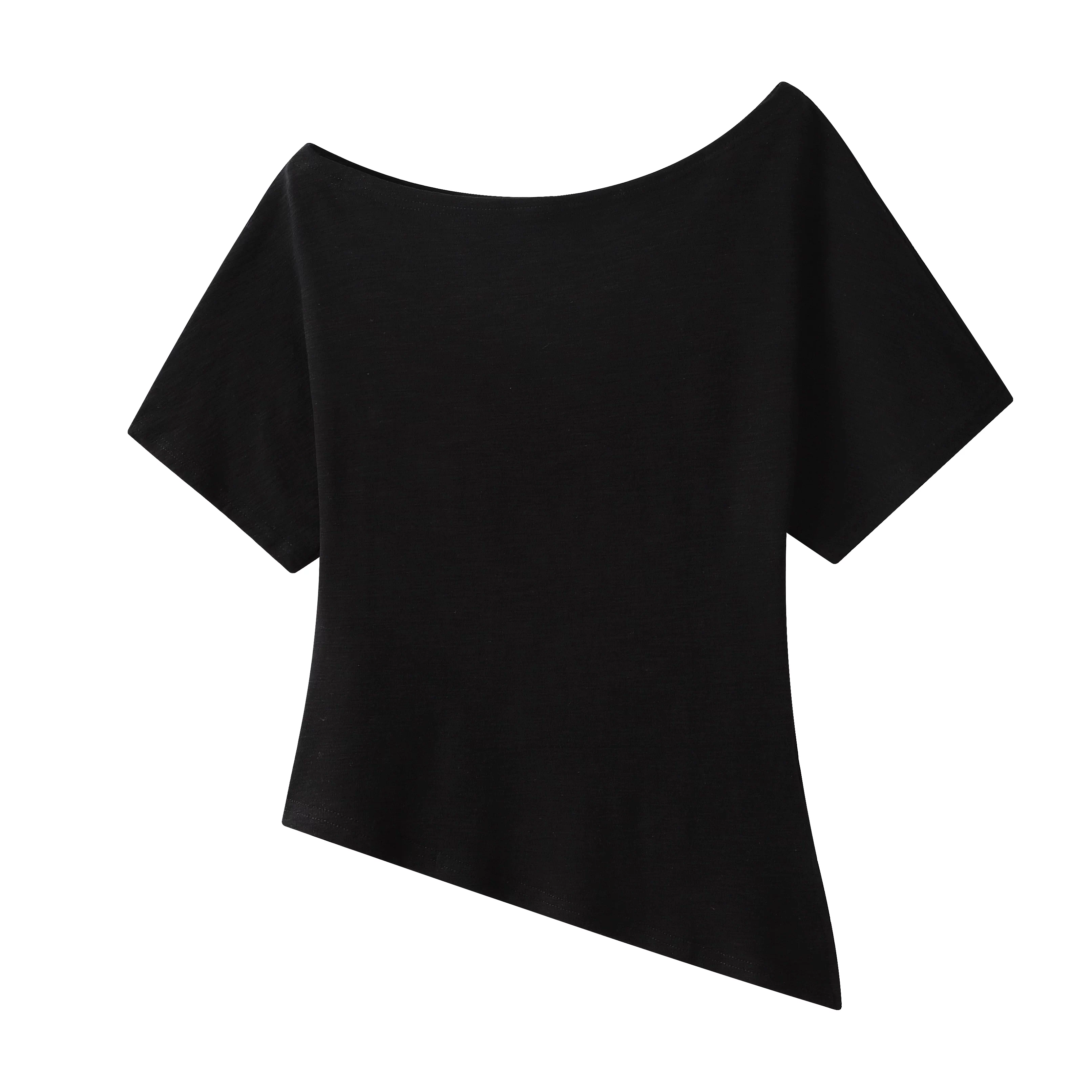 Áo thun ngắn tay lệch vai màu vàng cao cấp phong cách Hàn Quốc dành cho nữ, áo hở vai không đều mùa hè