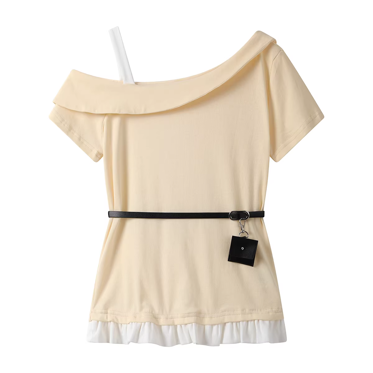 - Áo thun ngắn tay trễ vai kiểu Pháp dành cho nữ, áo kiểu dáng ôm sát phối ren mùa hè mới