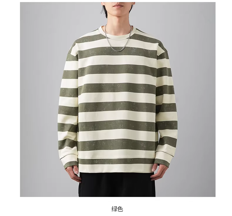 - Áo thun nỉ cổ tròn kẻ sọc dày dặn, mẫu mới thu đông 2024, thương hiệu thời thượng, áo khoác dài tay không mũ kiểu vintage, họa tiết batik cũ kỹ