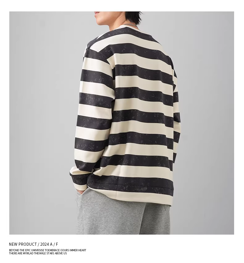 Áo thun nỉ cổ tròn kẻ sọc dày dặn, mẫu mới thu đông 2024, thương hiệu thời thượng, áo khoác dài tay không mũ kiểu vintage, họa tiết batik cũ kỹ