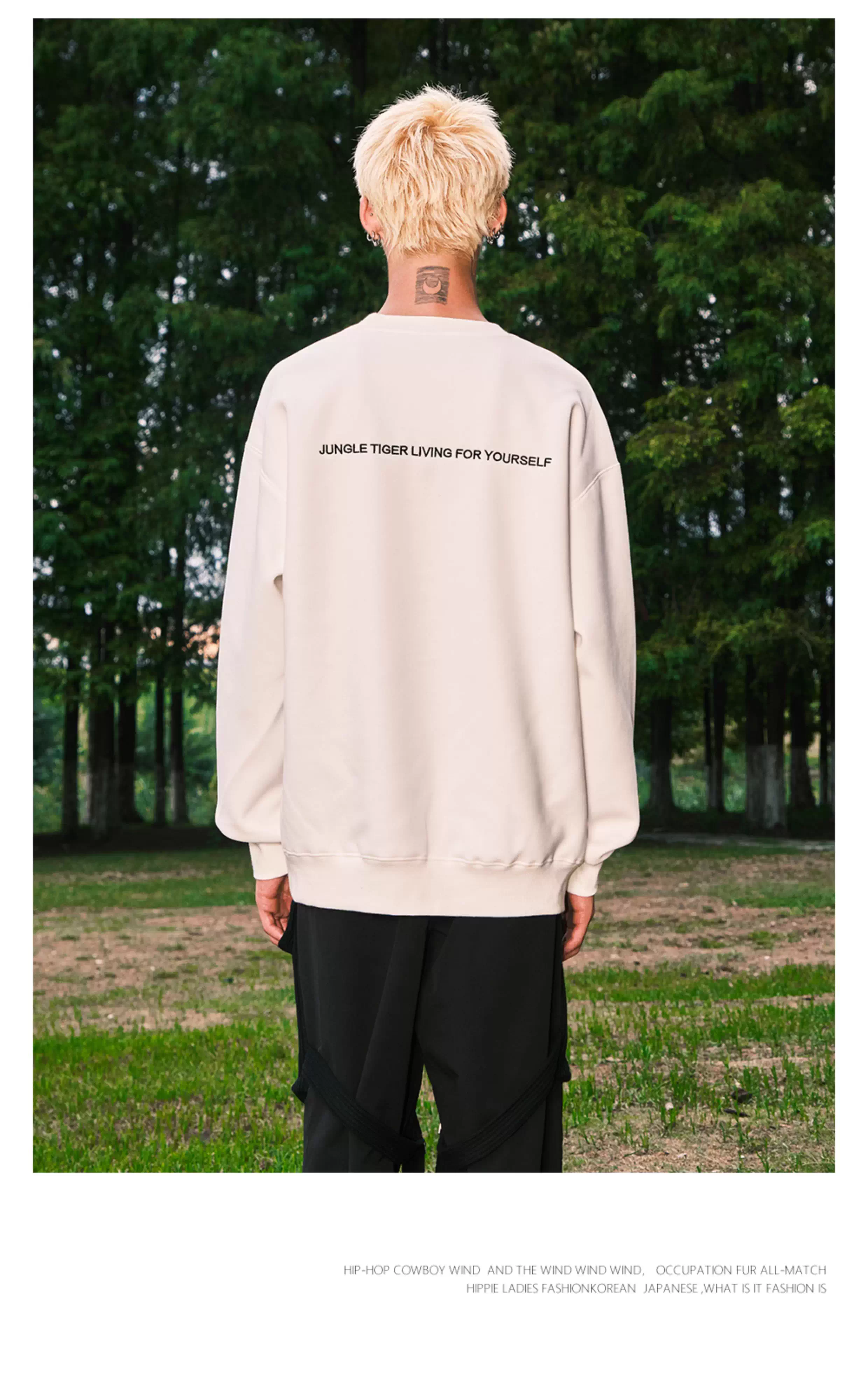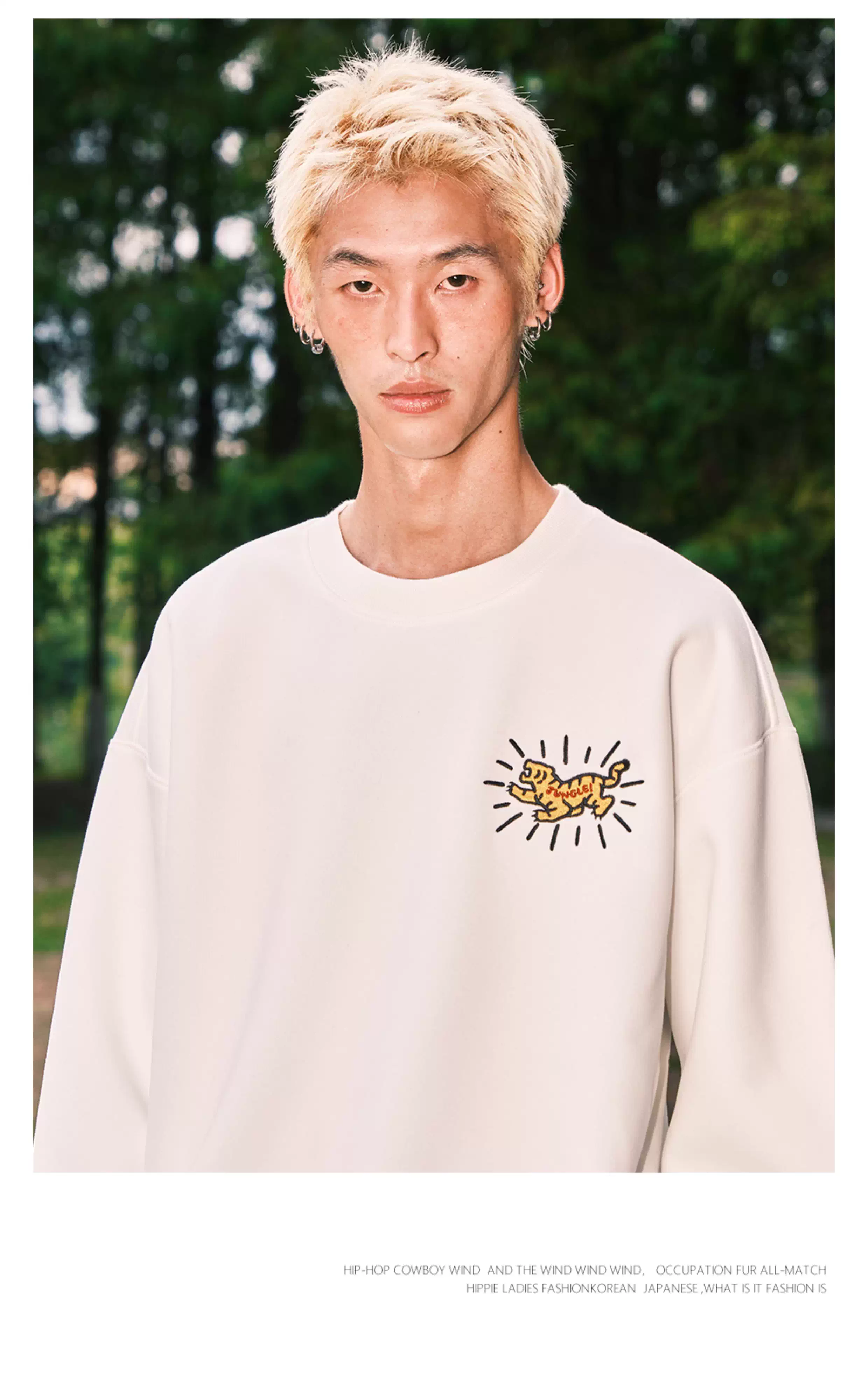 Áo thun nỉ cổ tròn thêu đơn giản họa tiết hổ rừng dành cho nam và nữ, xu hướng quốc gia thu đông 2025, dáng rộng, chất liệu dày 420g, không mũ