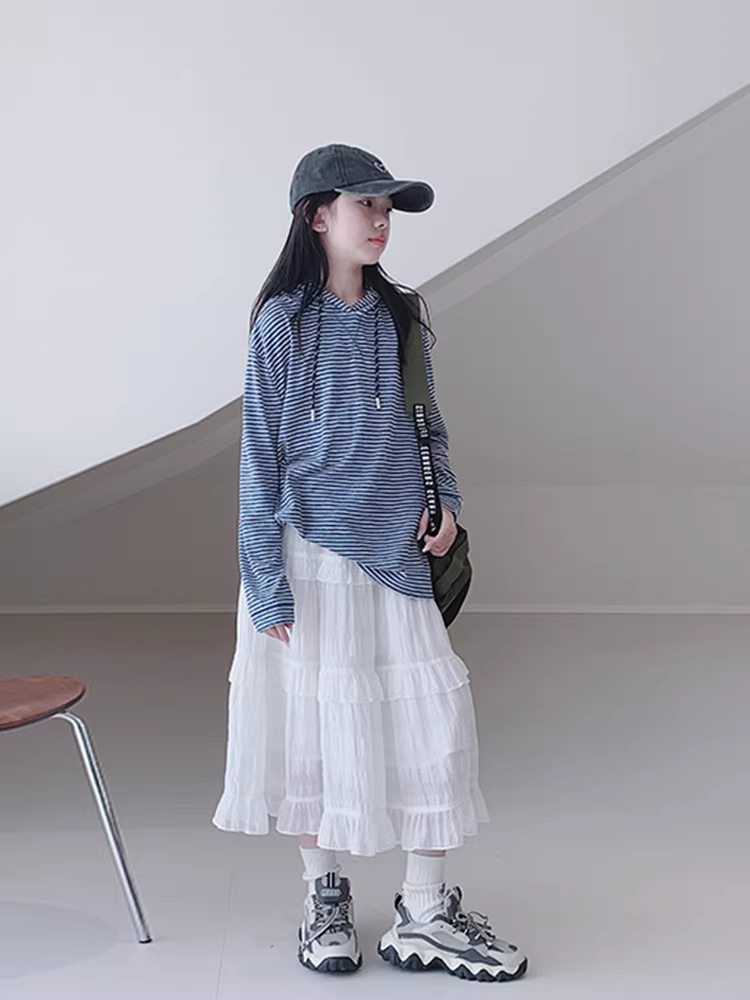 - Áo thun nỉ thời trang bé gái 2025, quần áo thu mới cho trẻ lớn, áo hoodie sọc trẻ em, áo dài tay trẻ em