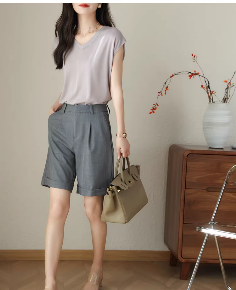 Áo thun nữ cao cấp chất liệu Tencel mát mẻ, dáng ôm, cổ chữ V, không tay, kiểu dáng ngắn, mới cho mùa hè.