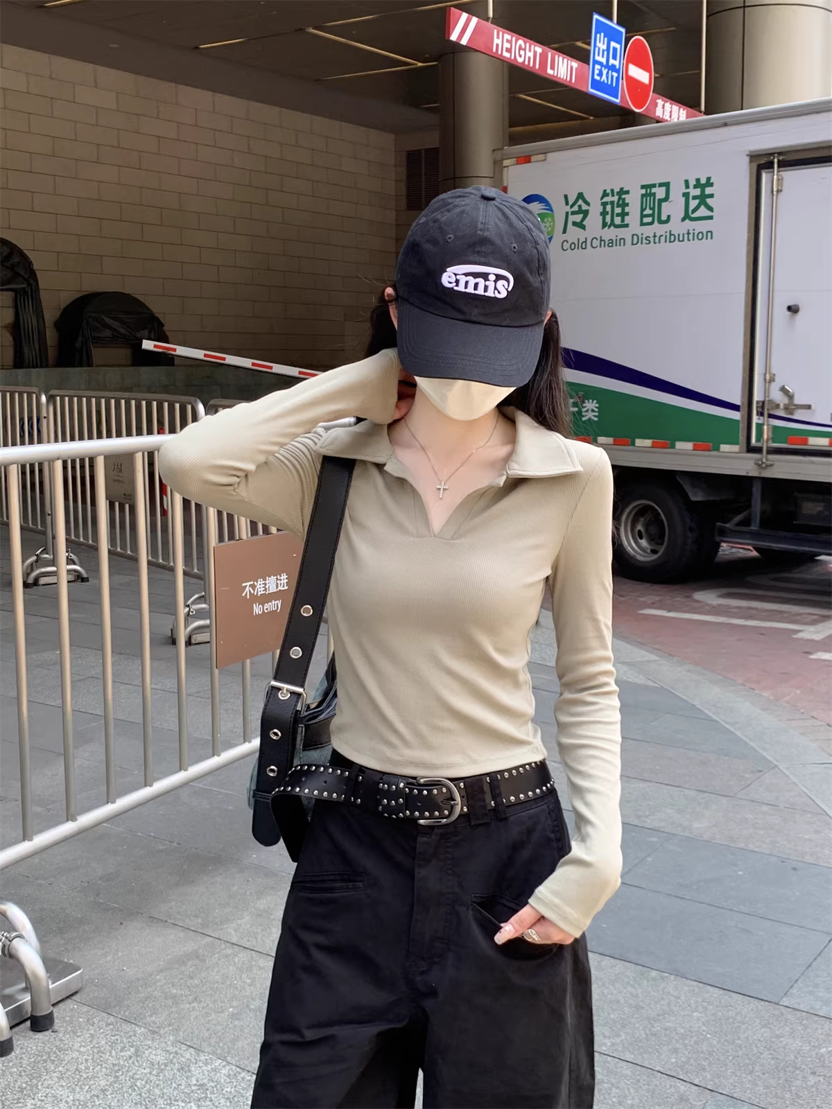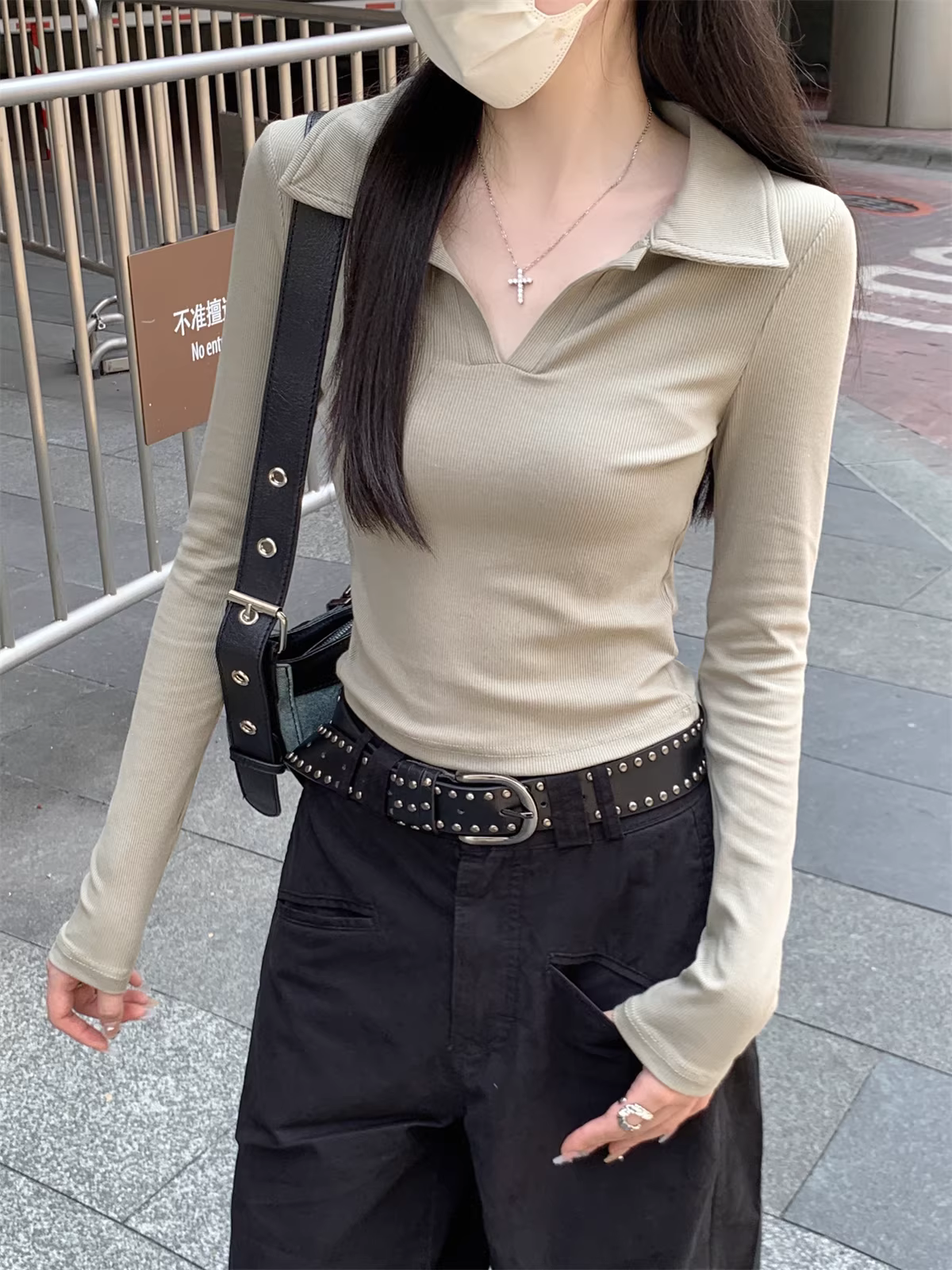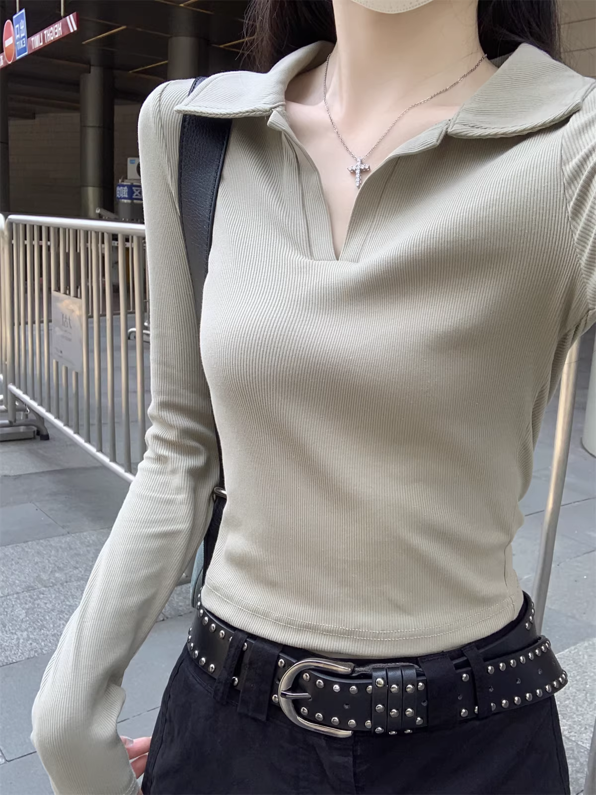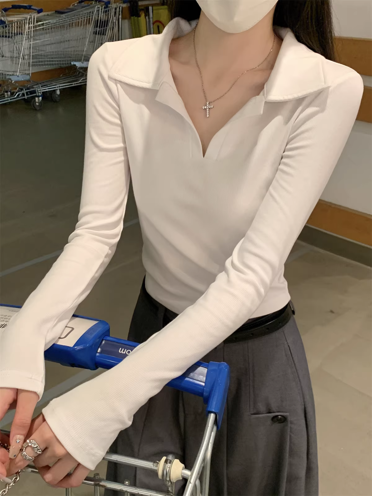 Áo thun nữ cổ trắng dài tay La Chapelle, thiết kế ôm dáng mới mùa thu đông 2025