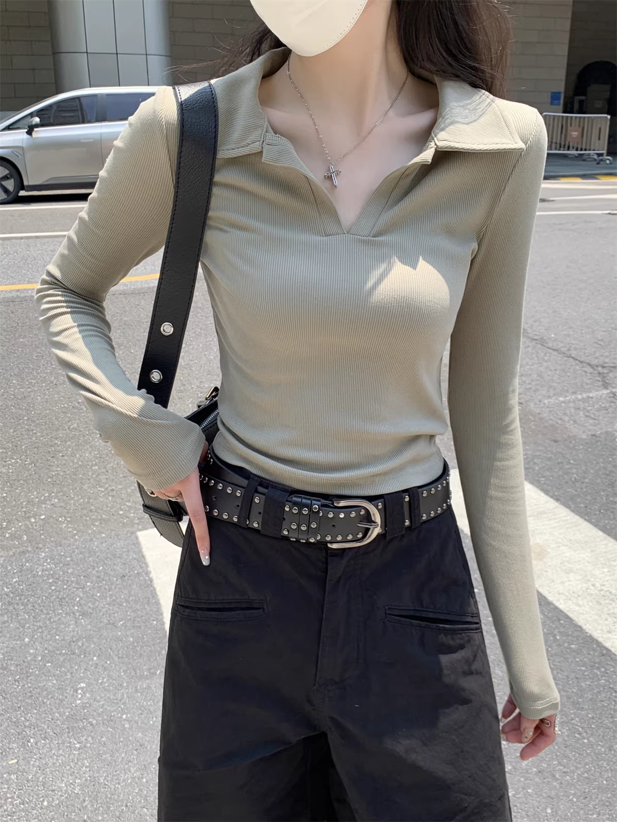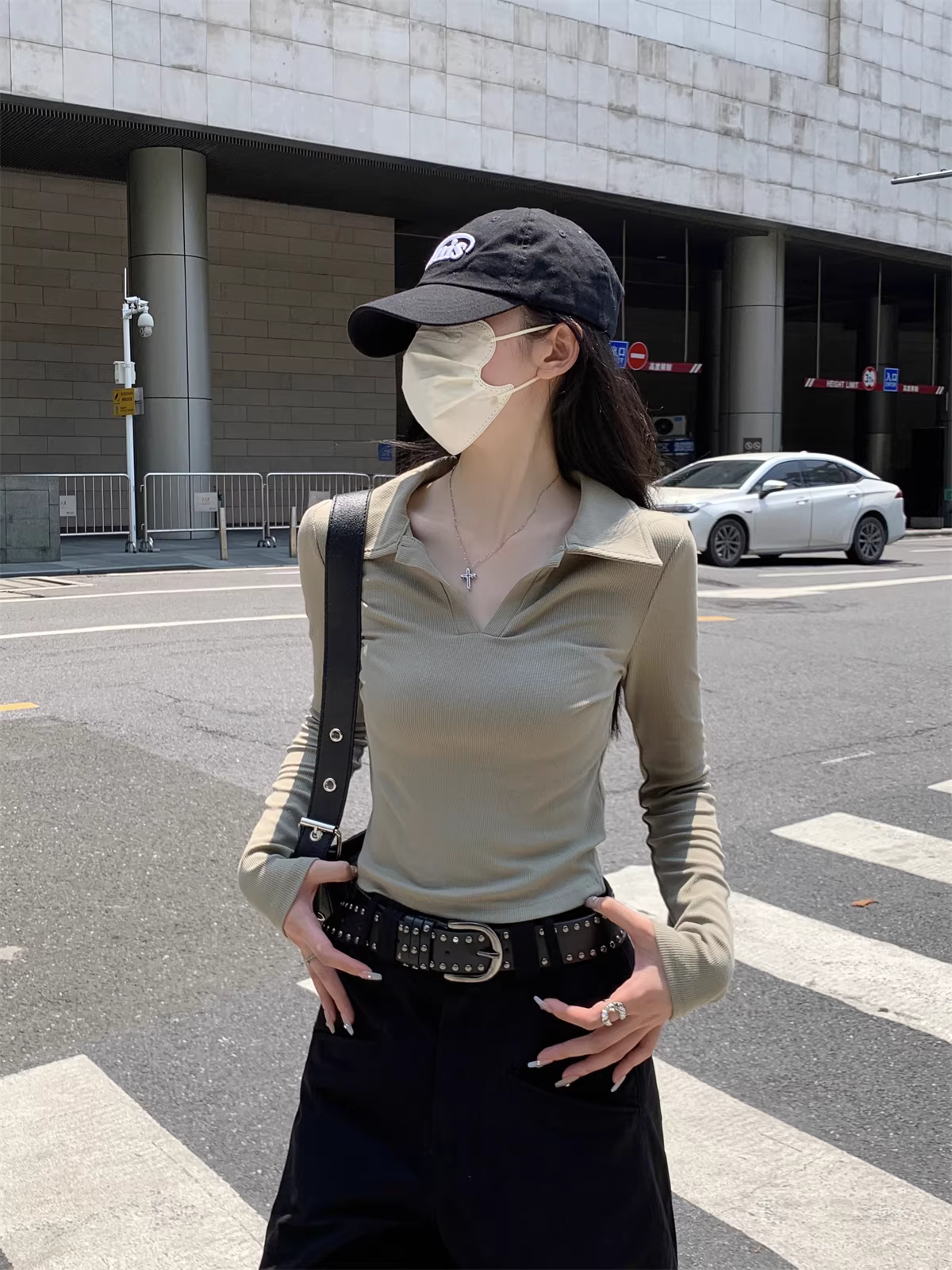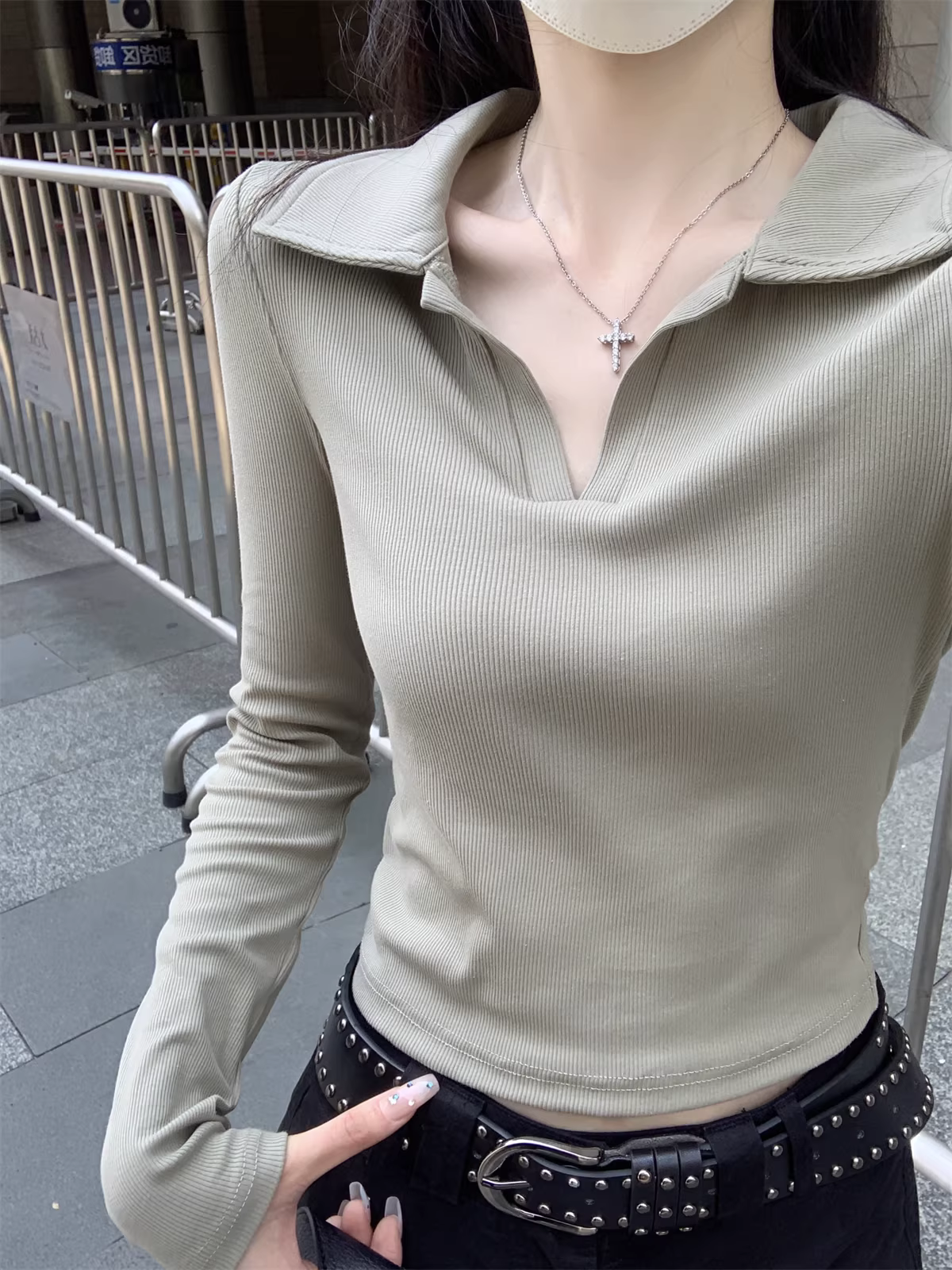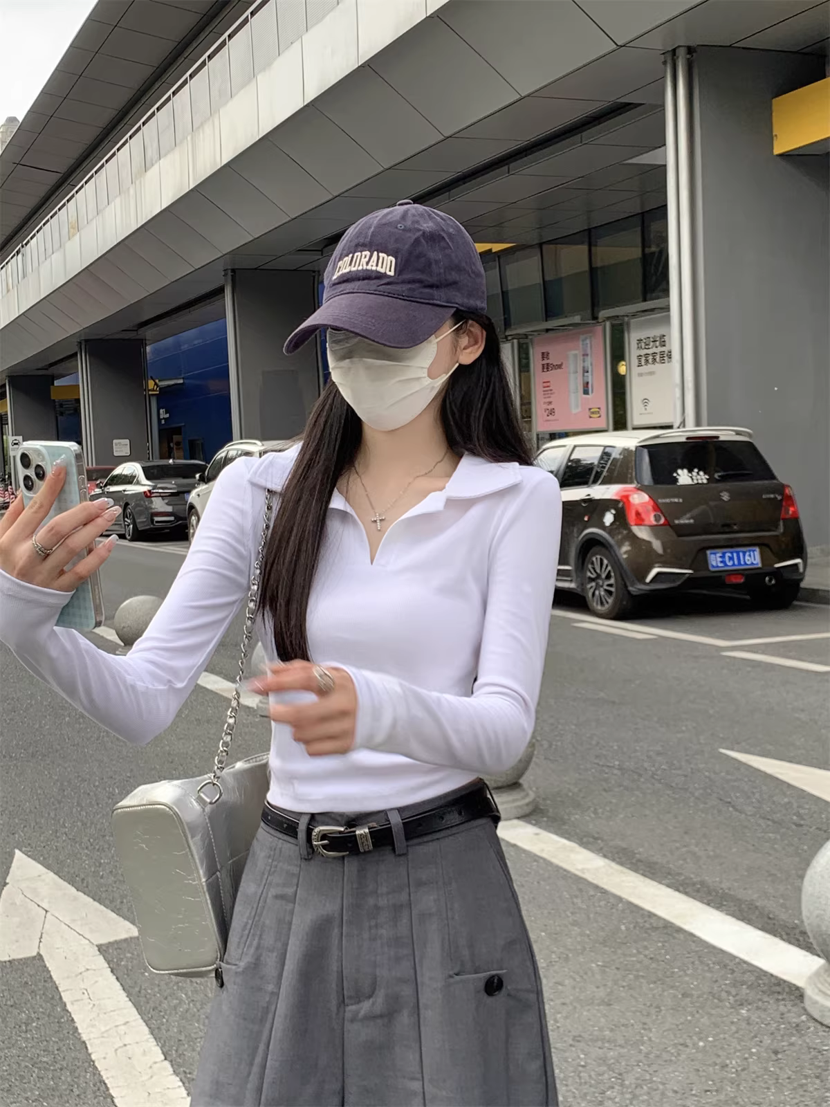 Áo thun nữ cổ trắng dài tay La Chapelle, thiết kế ôm dáng mới mùa thu đông 2025