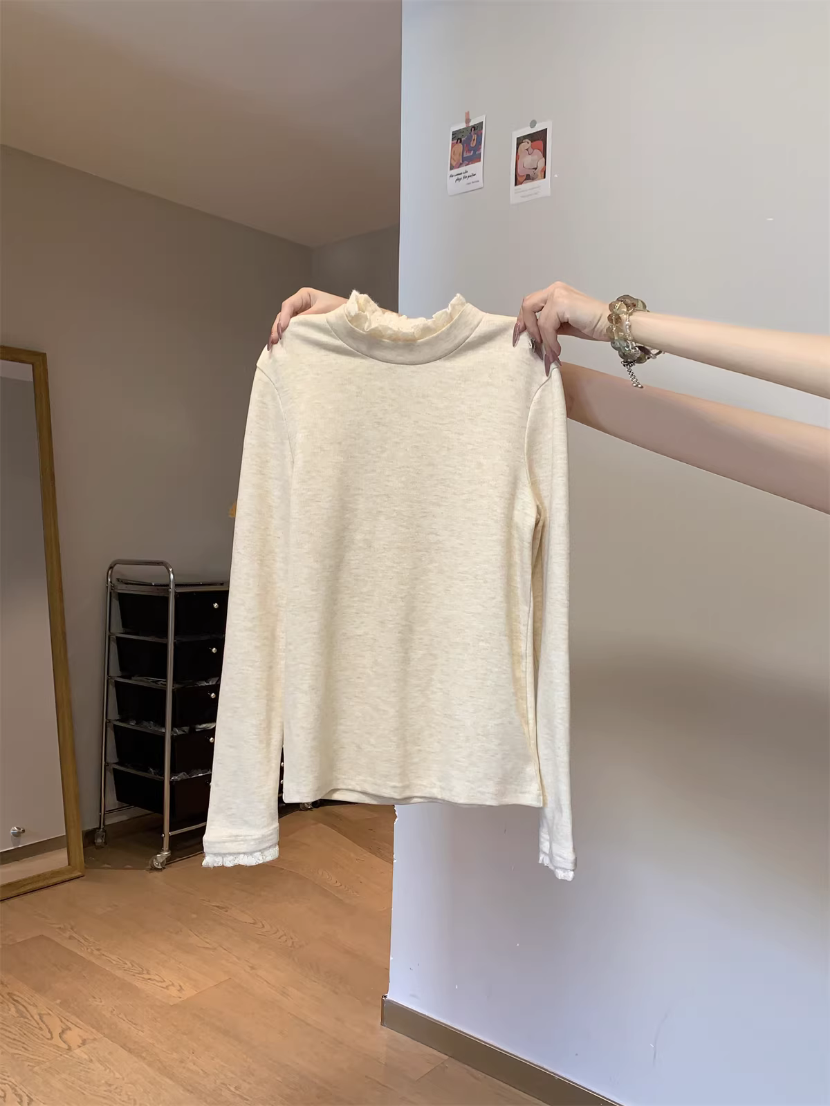 Áo thun nữ La Chapelle cổ nửa cao, tay dài, ren, kiểu dáng ôm body, size nhỏ, mùa thu đông 2025.