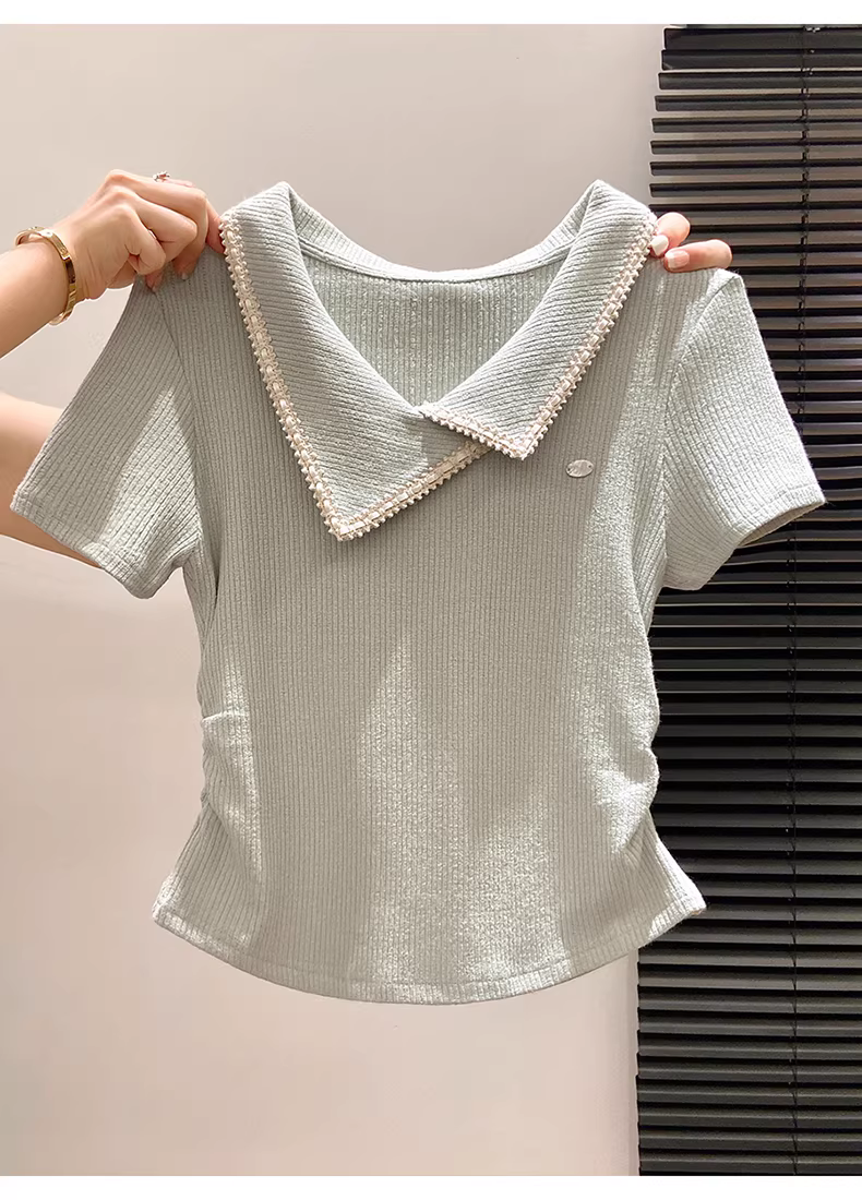 - Áo thun nữ La Chapelle cổ polo màu xanh, tay ngắn, dáng regular, mùa hè 2025, thiết kế ôm body, kiểu áo ngắn.