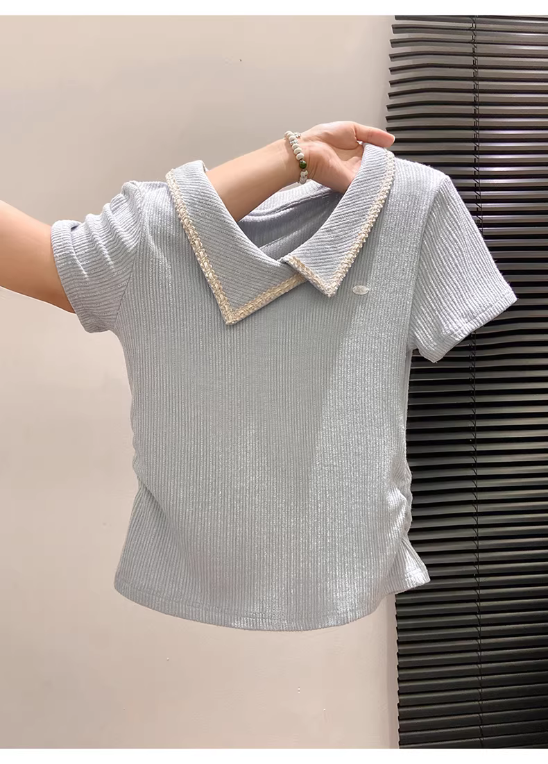 Áo thun nữ La Chapelle cổ polo màu xanh, tay ngắn, dáng regular, mùa hè 2025, thiết kế ôm body, kiểu áo ngắn.