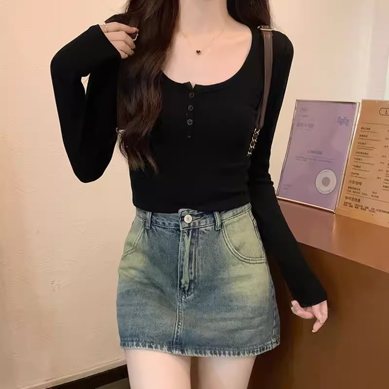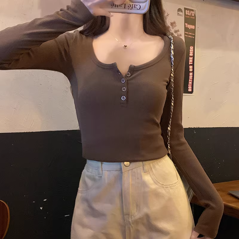 - Áo thun nữ La Chapelle màu nâu, tay dài, cổ nửa mở, kiểu mới thu đông 2025, phong cách thuần khiết, áo trễ vai.