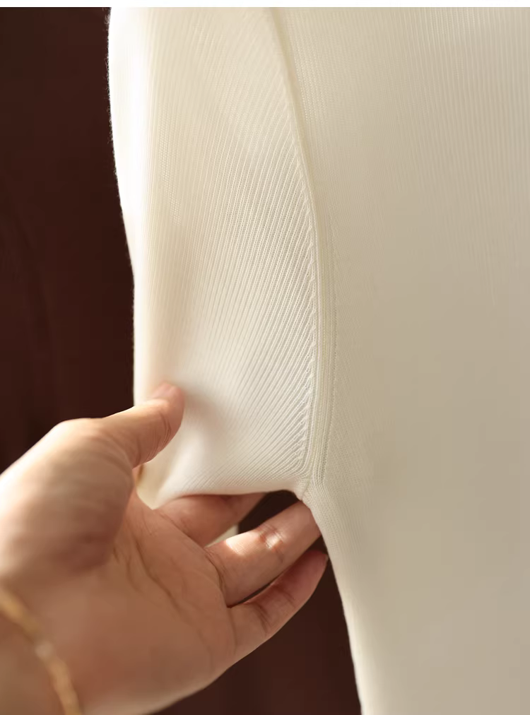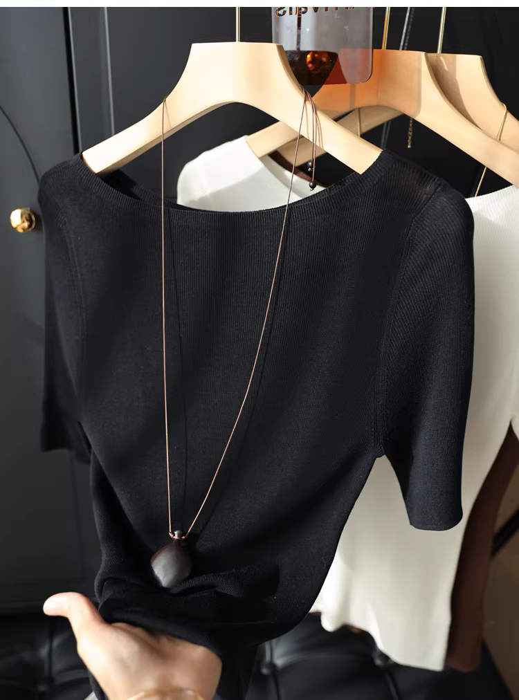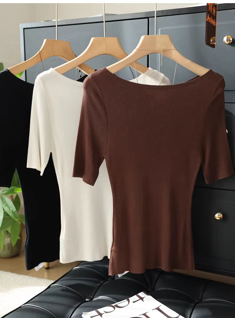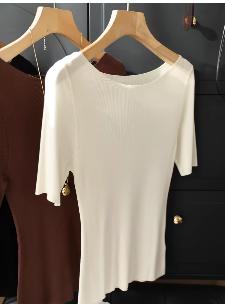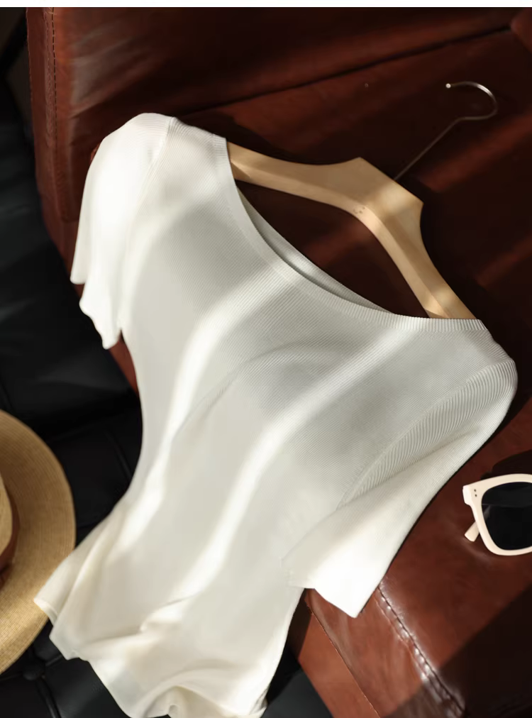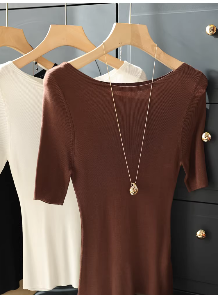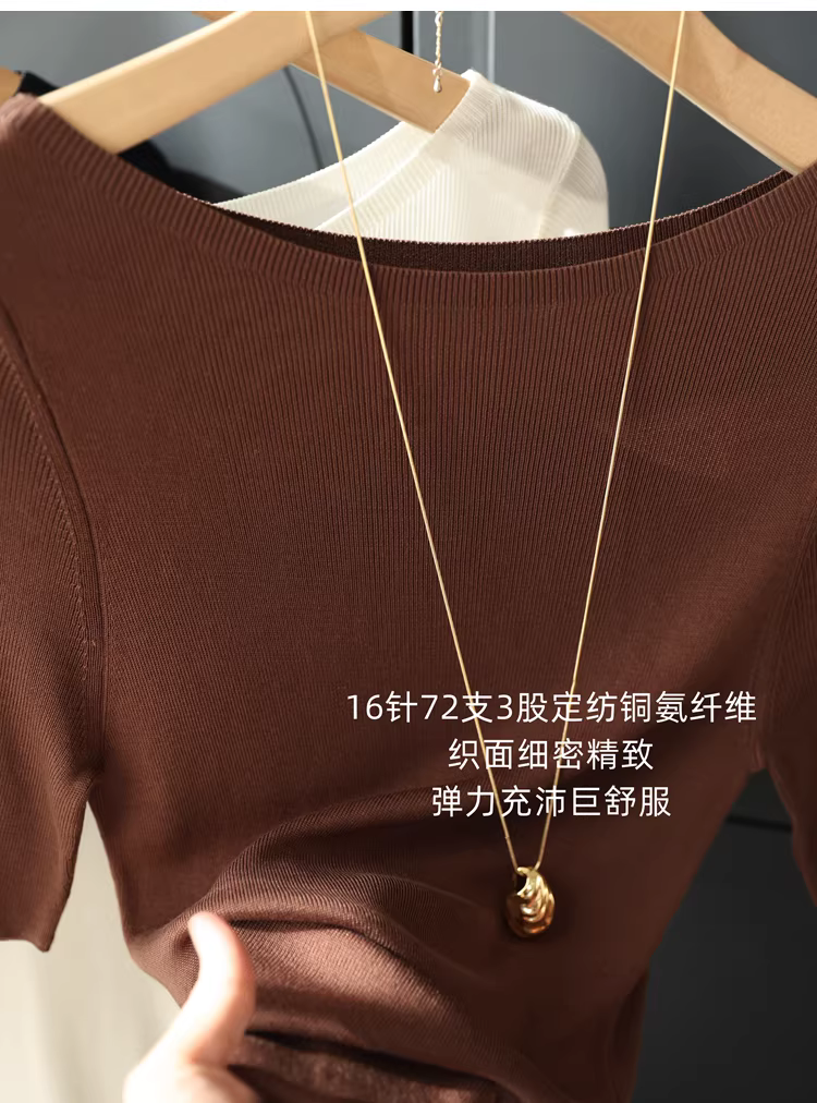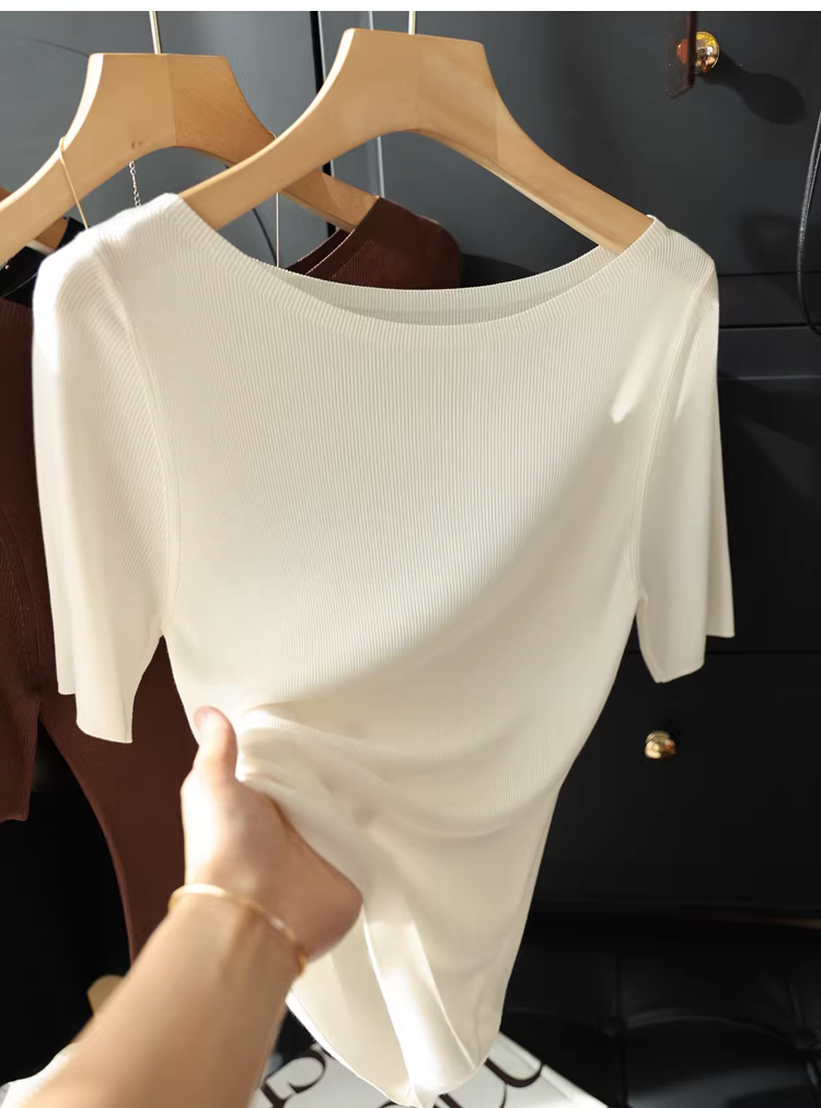 Áo thun nữ mùa hè chất liệu 100% tơ cupro, kiểu Pháp tối giản, dáng ôm, thiết kế trễ vai, chất liệu mỏng, tay ngắn