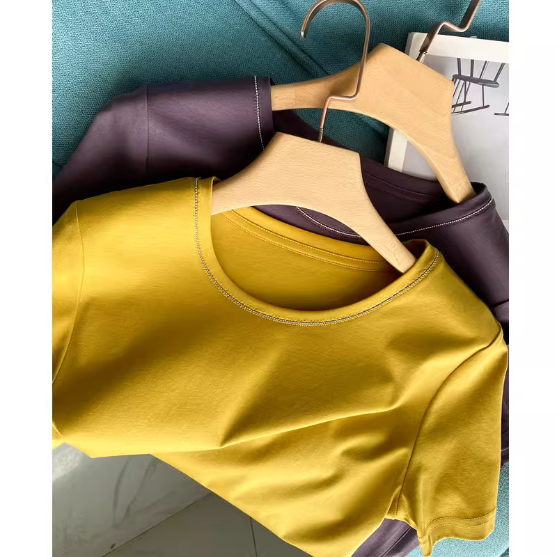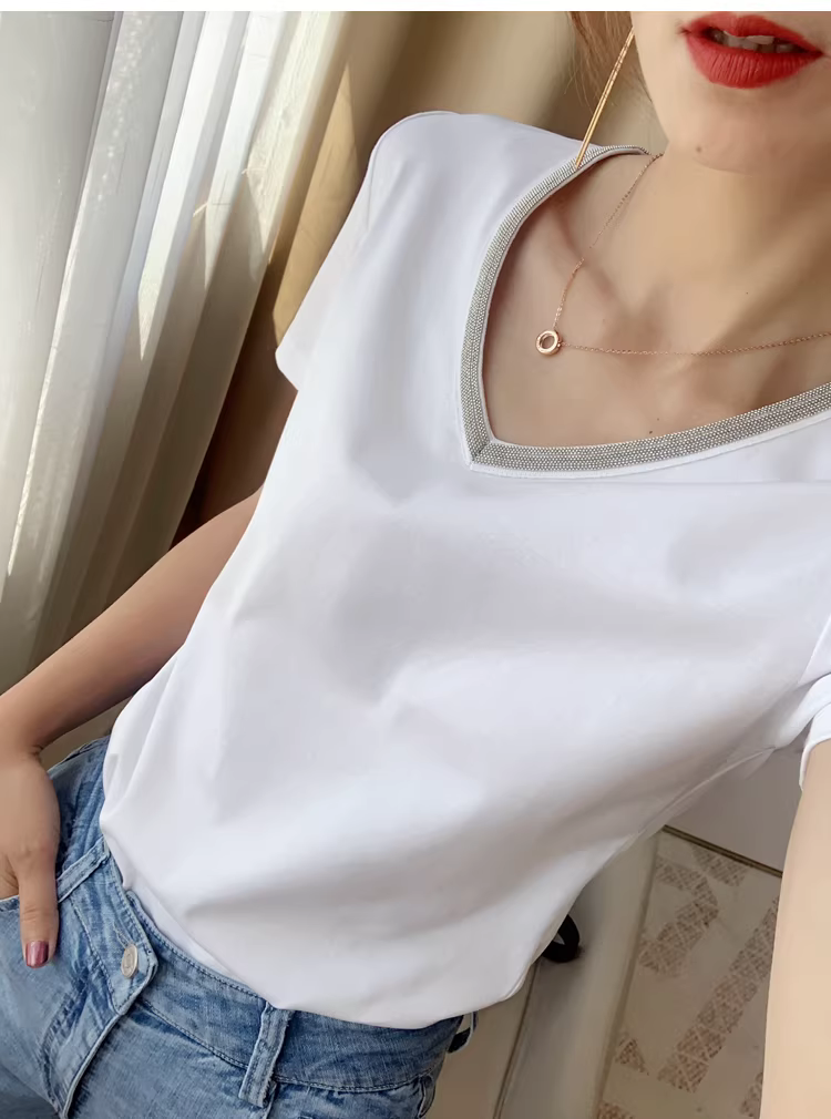 Áo thun nữ tay ngắn cổ tròn đính cườm bằng cotton 80-count, áo cổ chữ V dáng rộng màu đen mùa hè