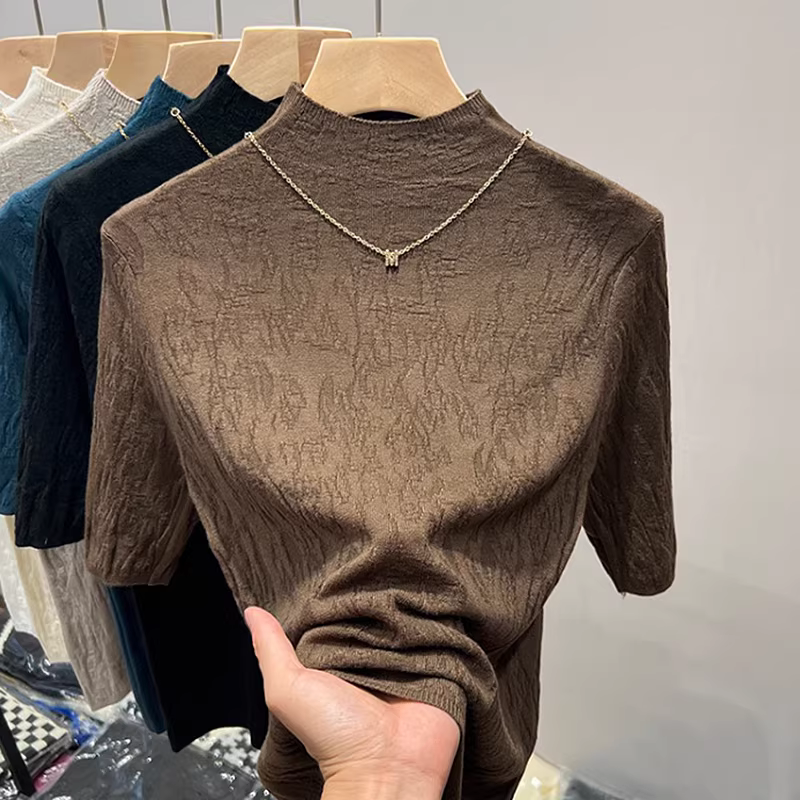 Áo thun nữ xuất khẩu Châu Âu, cổ nửa cao, tay lửng, dáng ôm, tôn dáng.
