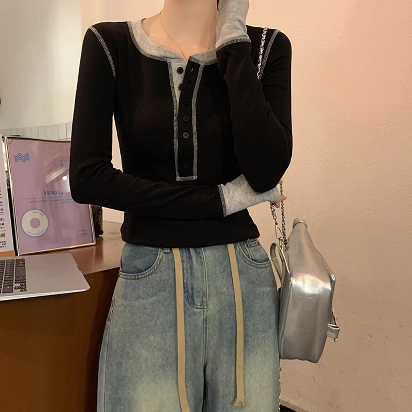 Áo thun nữ xuất khẩu giảm giá, kiểu dáng đa năng, cổ tròn, phối màu, thiết kế bo gấu độc đáo và hợp thời trang