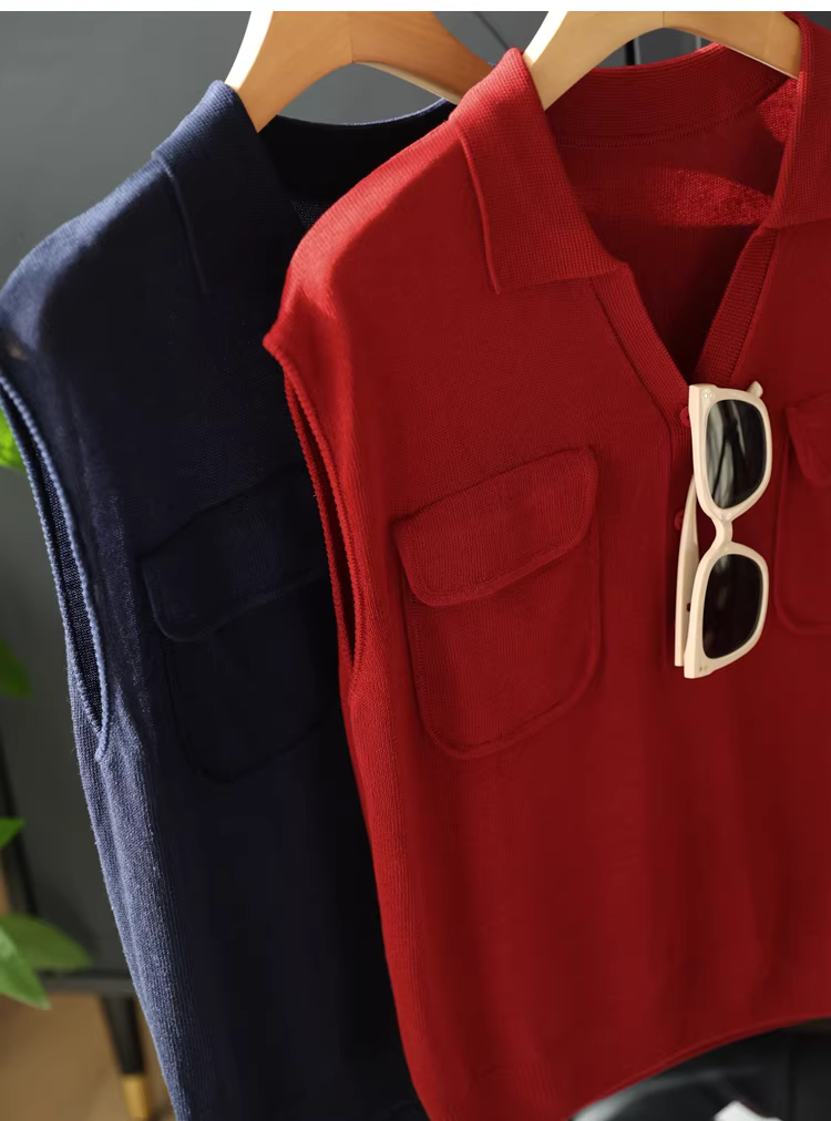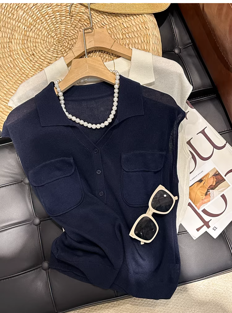 Áo thun polo cổ rộng chất liệu linen lyocell thoáng mát, mỏng, cổ V, tay sát nách, có túi dành cho nữ mùa hè