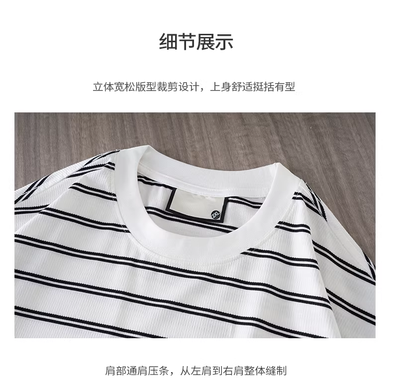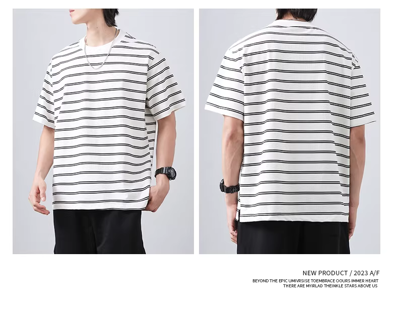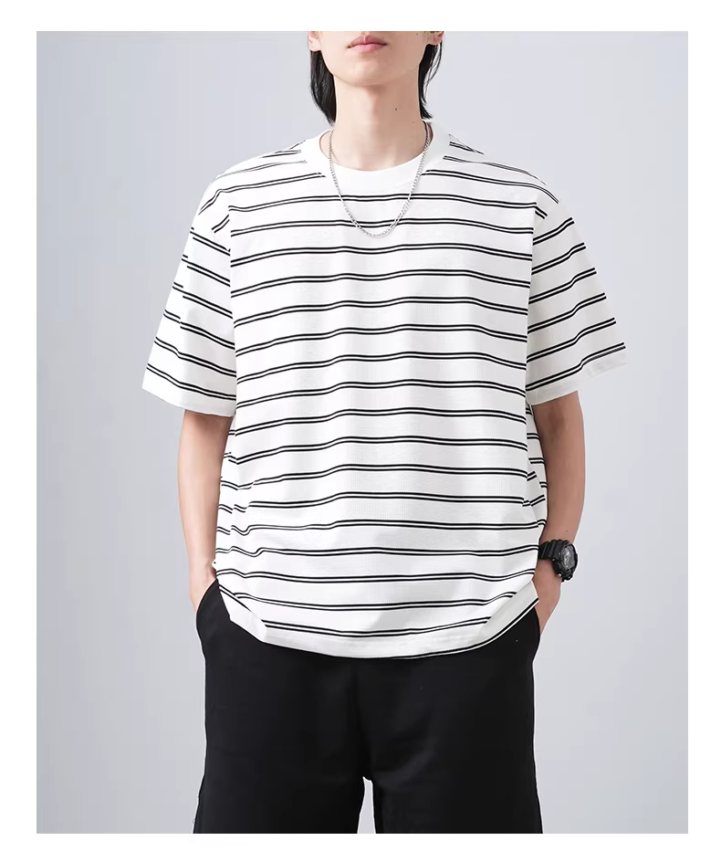 - Áo thun sọc nam chất dày, tay ngắn, kiểu mới hè 2024, phong cách Mỹ cổ điển retro, cổ tròn, dáng rộng.