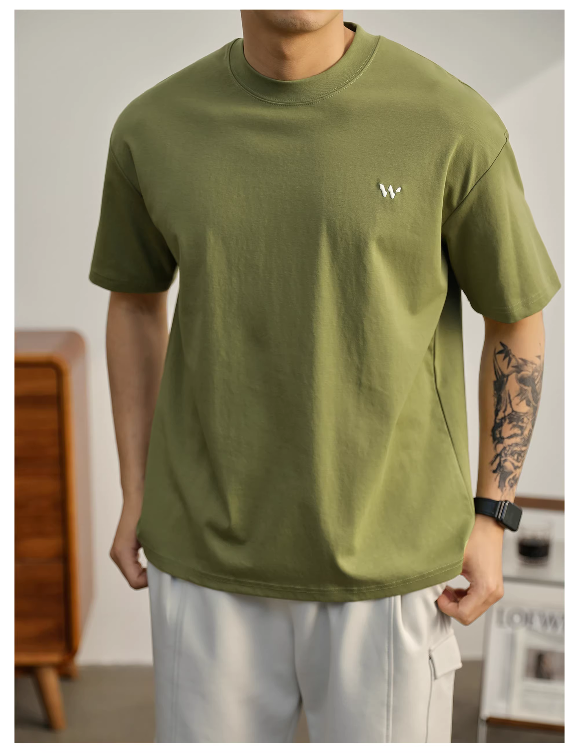 - Áo thun thêu nhỏ màu xanh mù tạt LUUD trẻ trung hợp thời trang dành cho nam, áo trễ vai thường ngày mùa hè, áo sơ mi ngắn tay bằng vải cotton đã qua xử lý