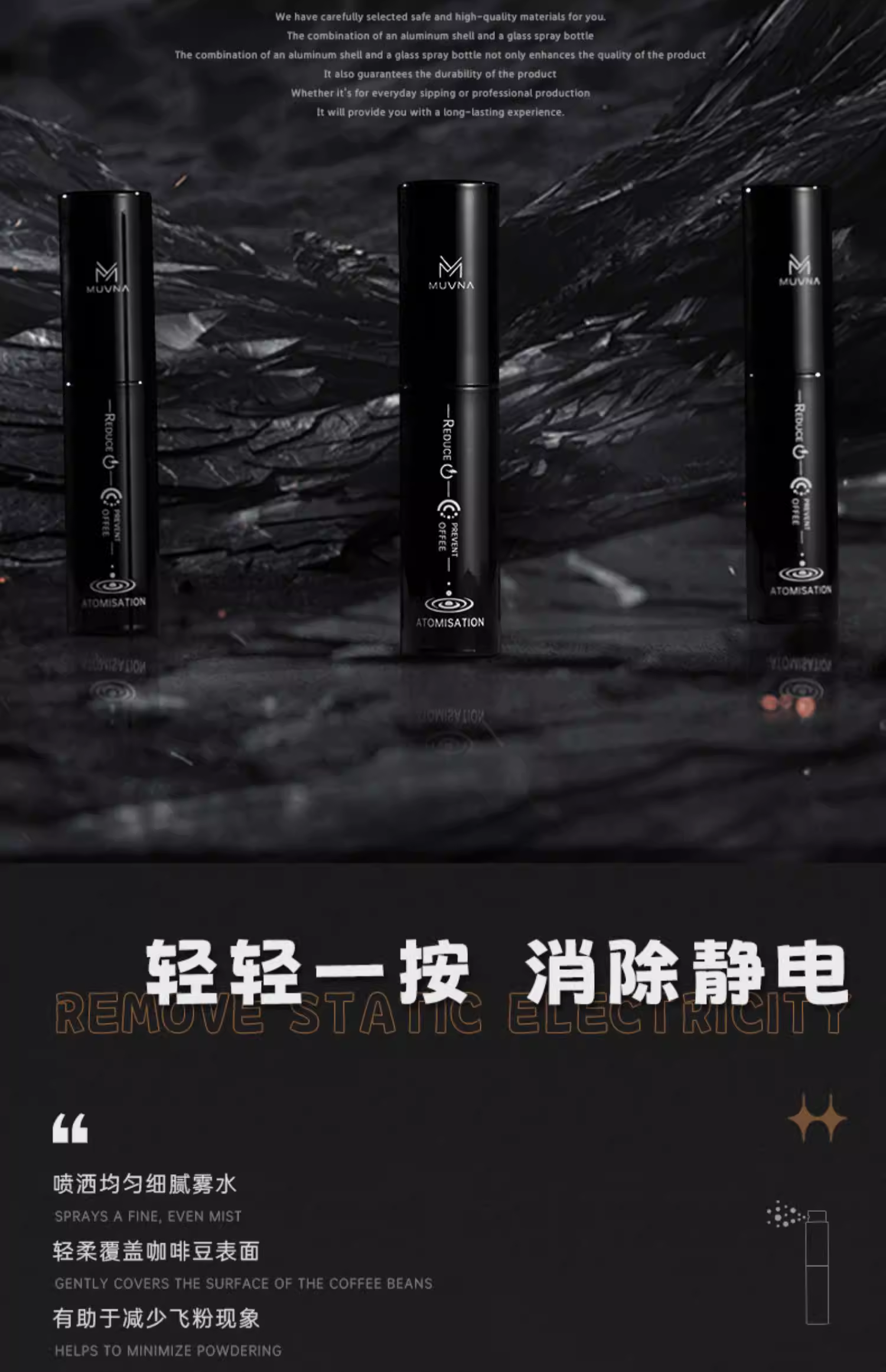 Bình xịt tĩnh điện MUVNA, máy xay cà phê, bộ thu bụi, chống bay bột, bình xịt hấp phụ bột, chai thủy tinh
