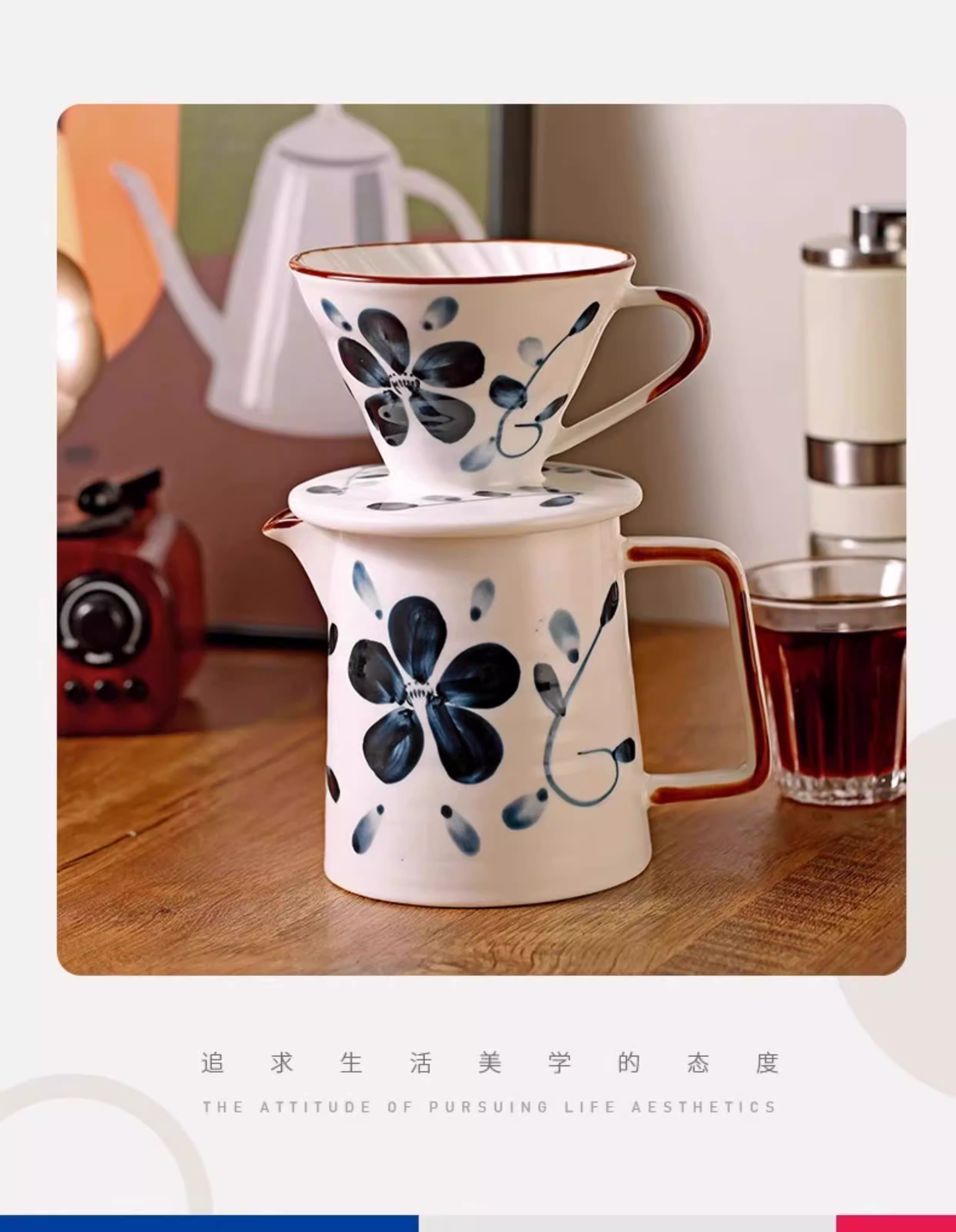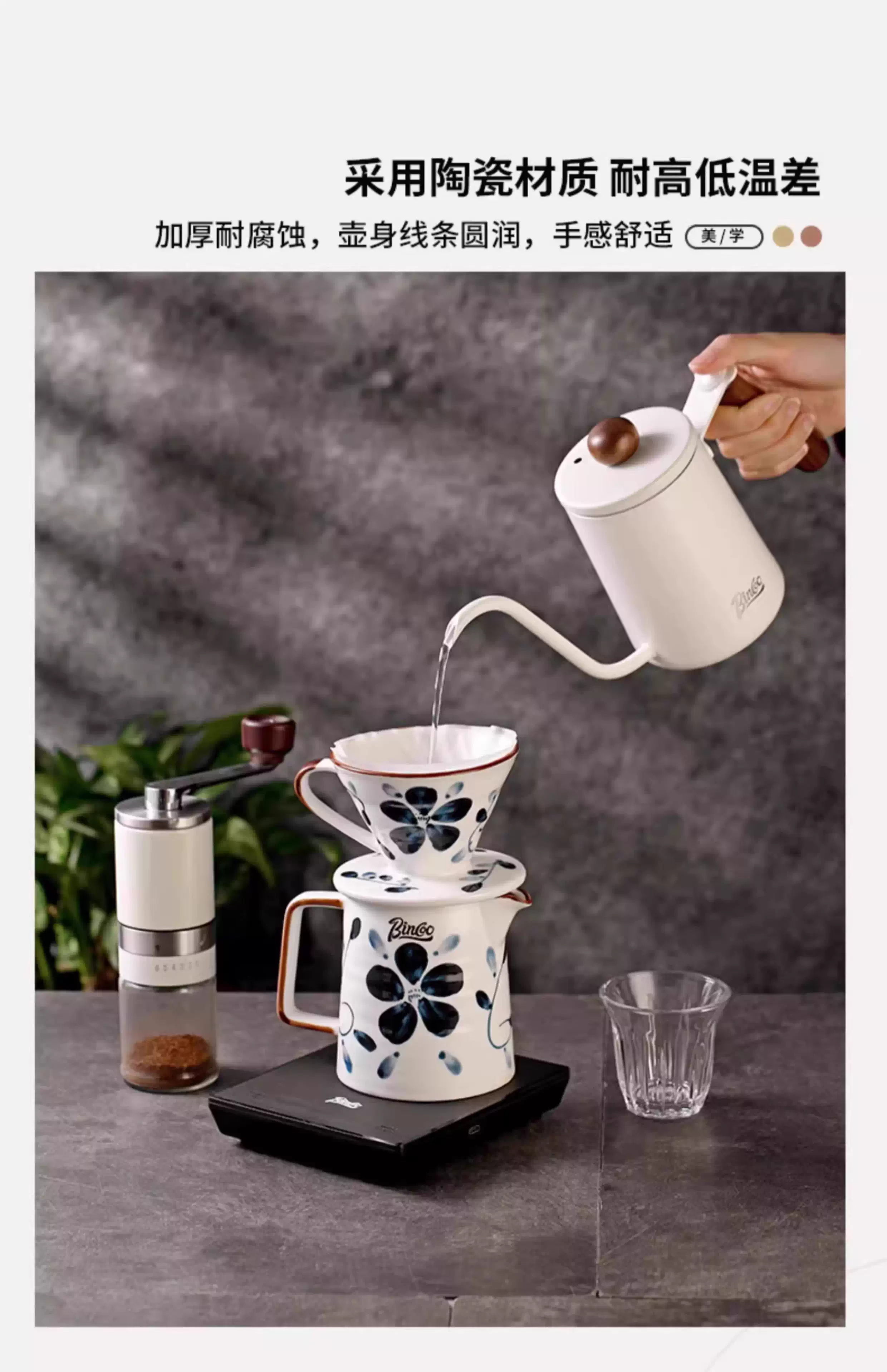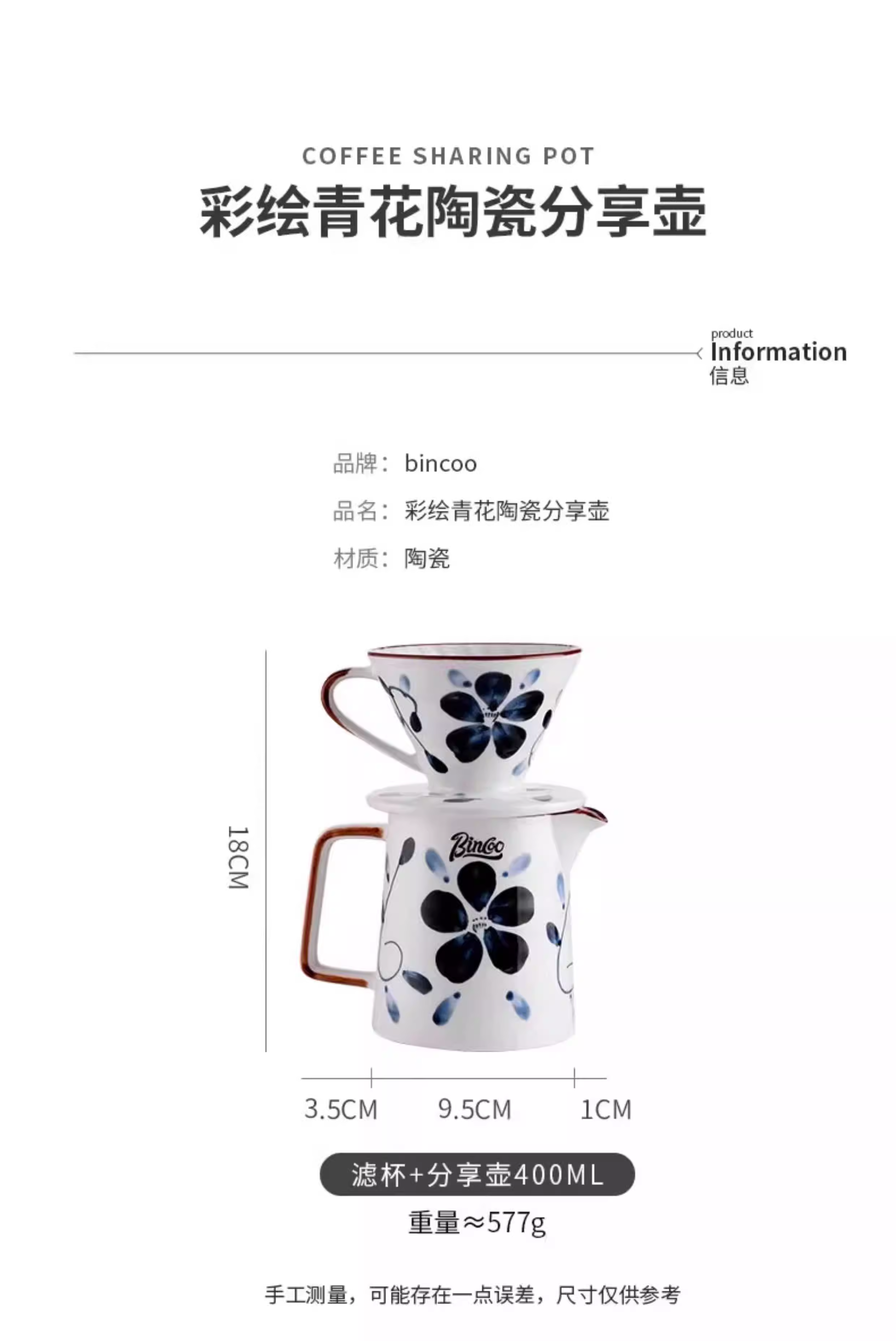 Bộ ấm pha cà phê sứ xanh trắng Bincoo vẽ tay v60, bộ lọc cà phê gốm sứ sáng tạo kiểu Nhật dùng trong nhà