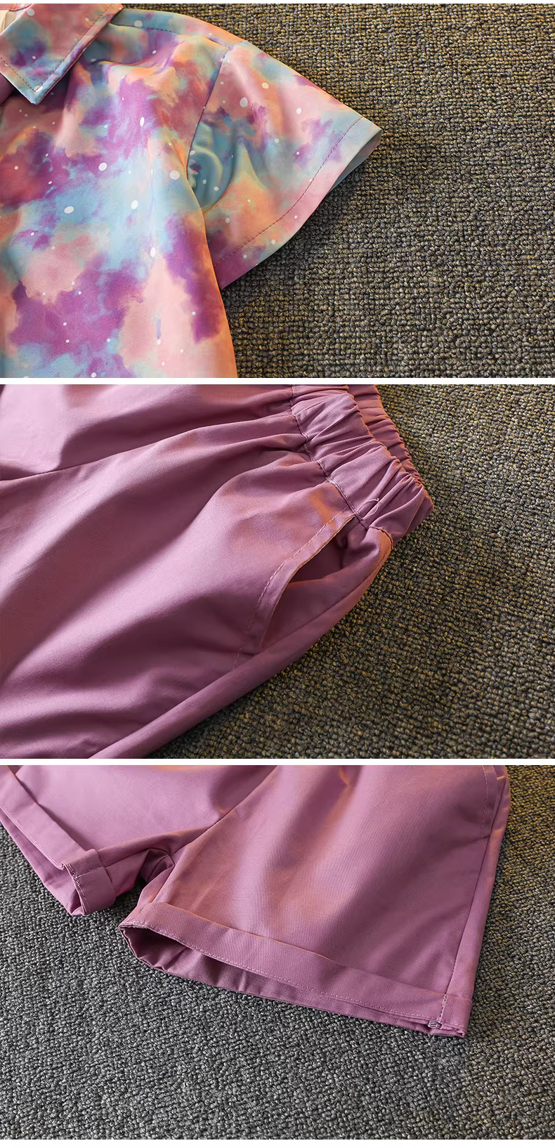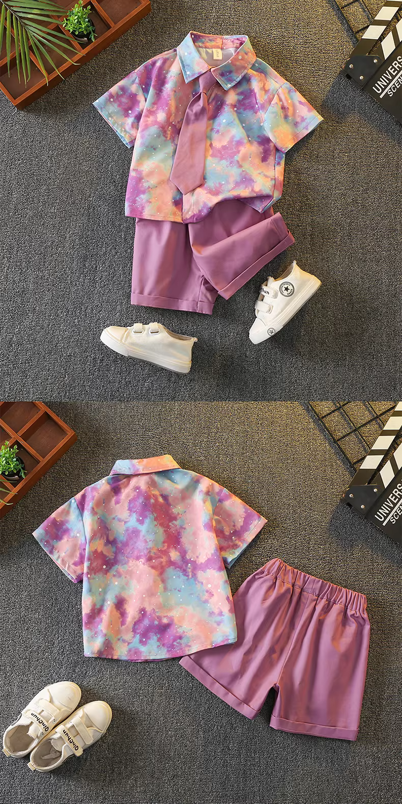 Bộ áo sơ mi hè bé trai 2025 kiểu dáng mới thời trang, áo sơ mi cà vạt màu tím mát mẻ cho bé, quần áo hè cho bé