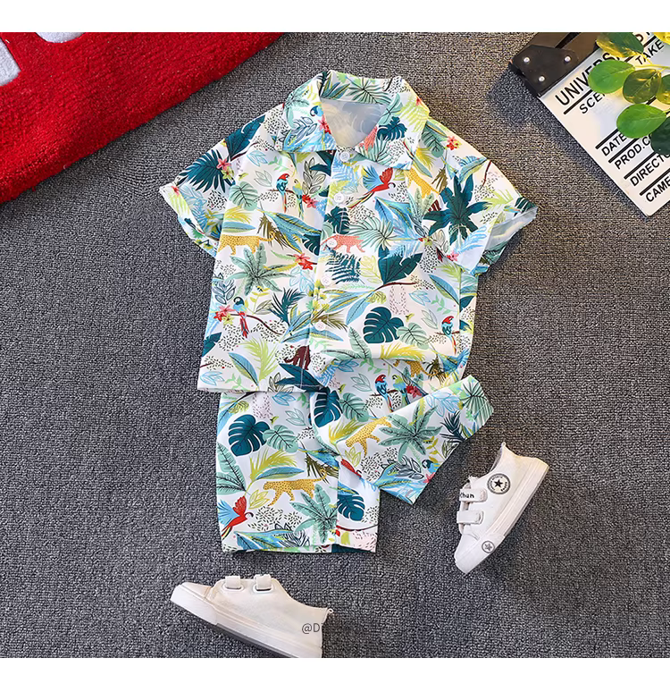 - Bộ áo sơ mi hè bé trai 2025 kiểu mới thời trang trẻ em phong cách Hồng Kông áo hoa đi biển bộ đồ hè hai mảnh