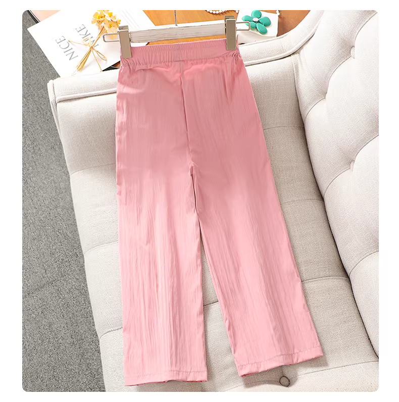 Bộ áo thun hè bé gái 2025 mới, chất liệu lụa đá mỏng, quần ống rộng, bộ hai mảnh trẻ em mặc thường ngày