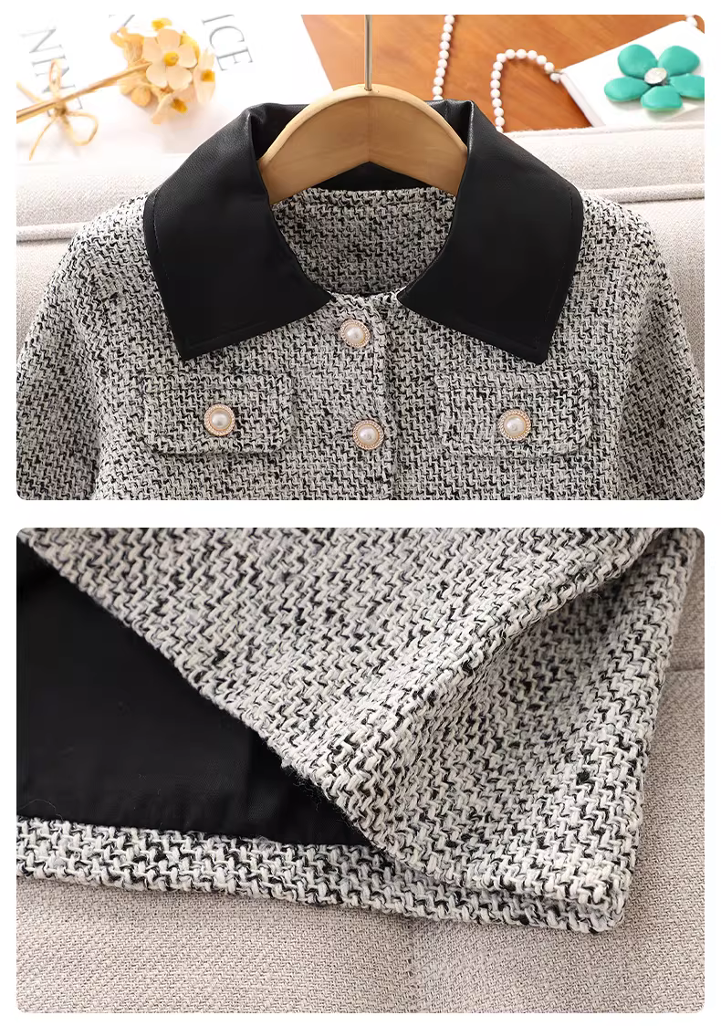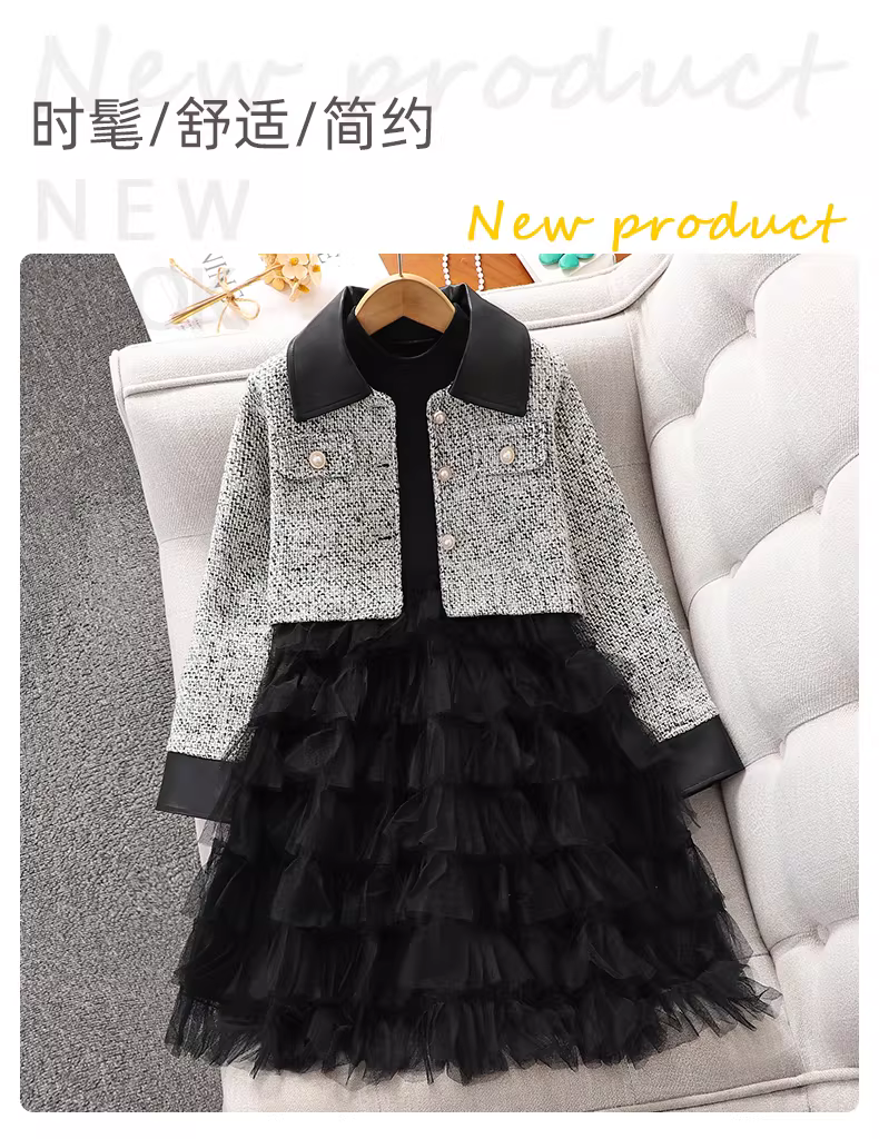 - Bộ đầm bé gái, kiểu mới thu 2025, áo khoác tweed, trang phục xuân thu trẻ em, chân váy xếp tầng.