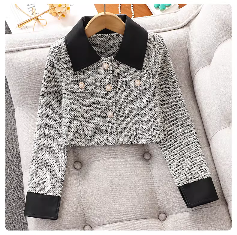 Bộ đầm bé gái, kiểu mới thu 2025, áo khoác tweed, trang phục xuân thu trẻ em, chân váy xếp tầng.