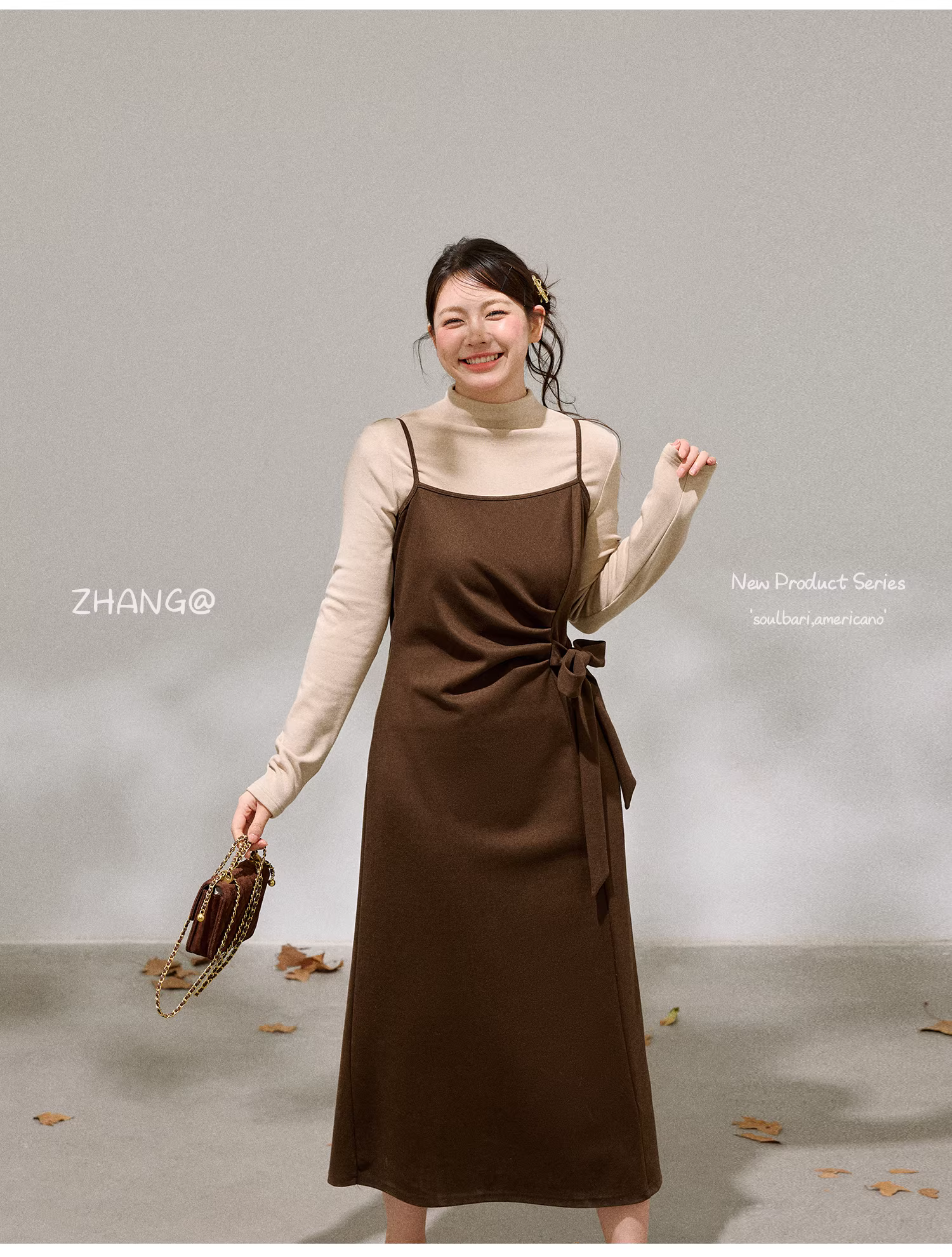 - Bộ đầm dây cà phê đậm kiểu Hàn Quốc, thiết kế thắt eo tôn dáng, dành cho phụ nữ cỡ lớn.