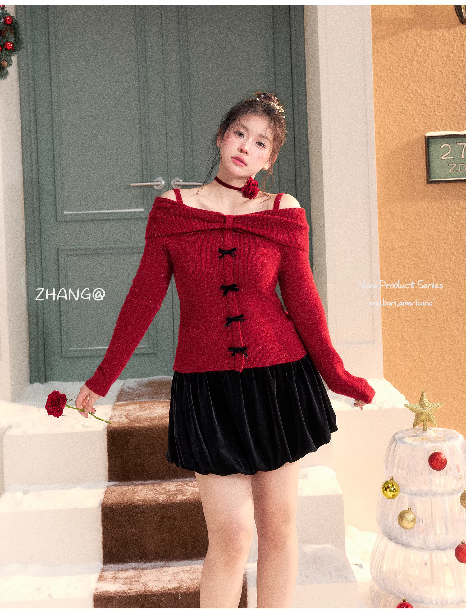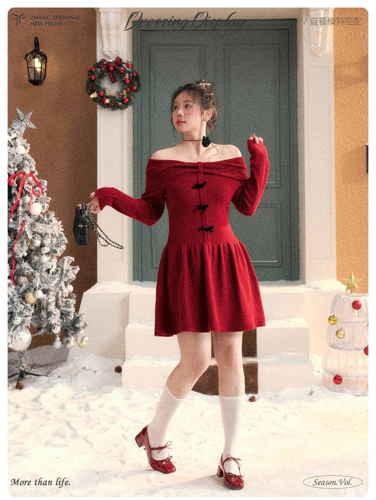 Bộ đầm len đỏ dáng xòe, kiểu Hàn Quốc, tôn dáng và làm đẹp da, dành cho người lớn, size lớn.