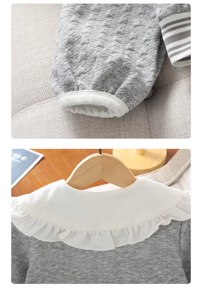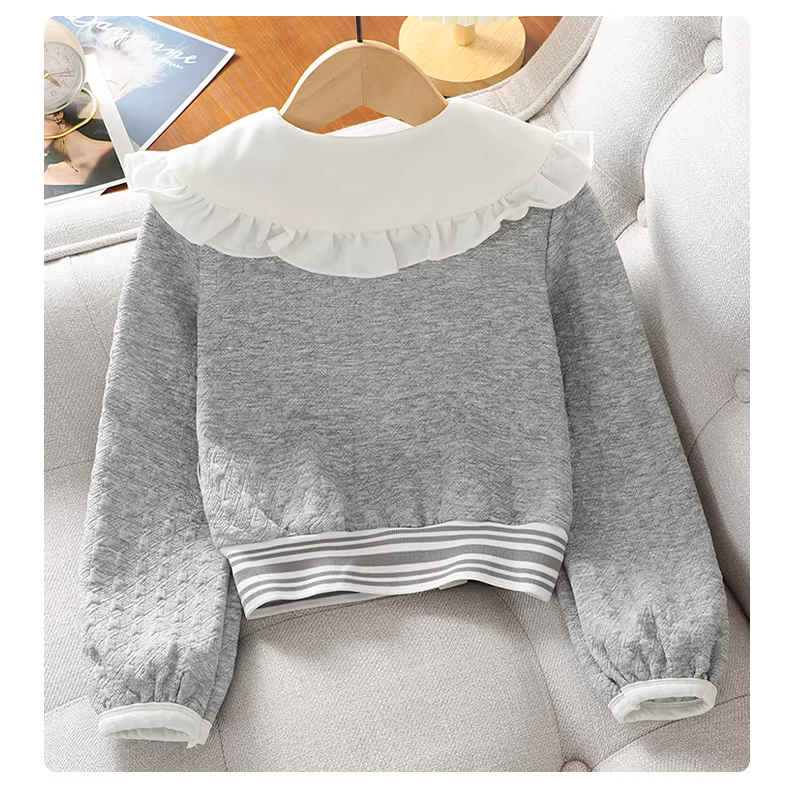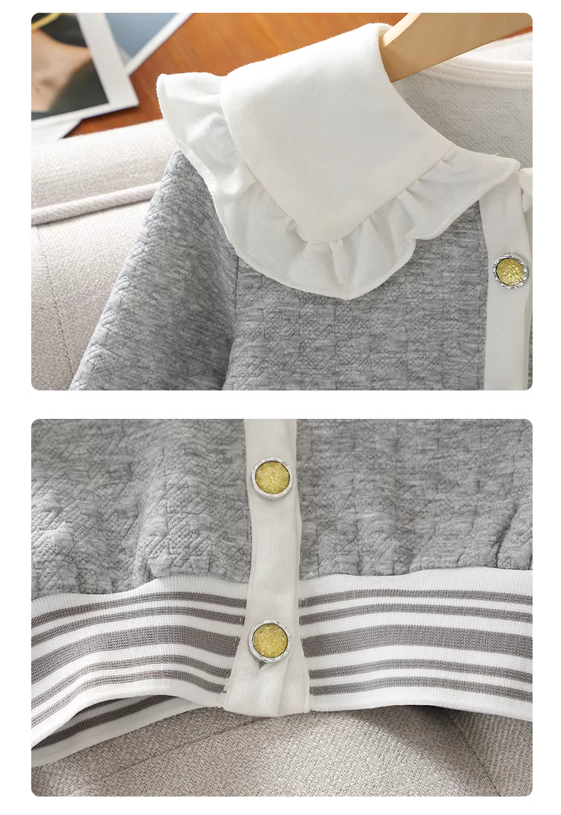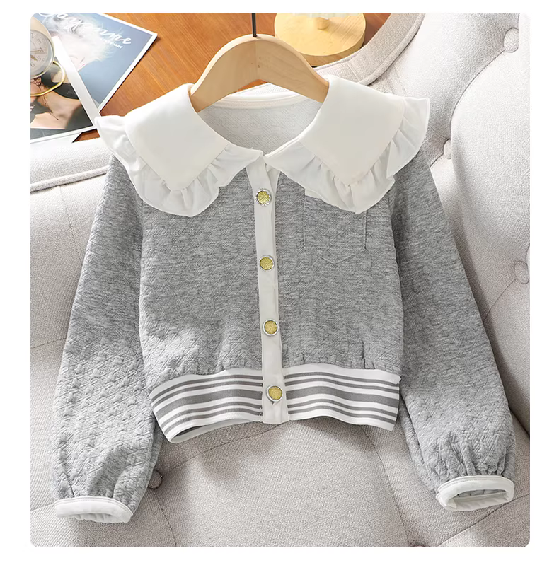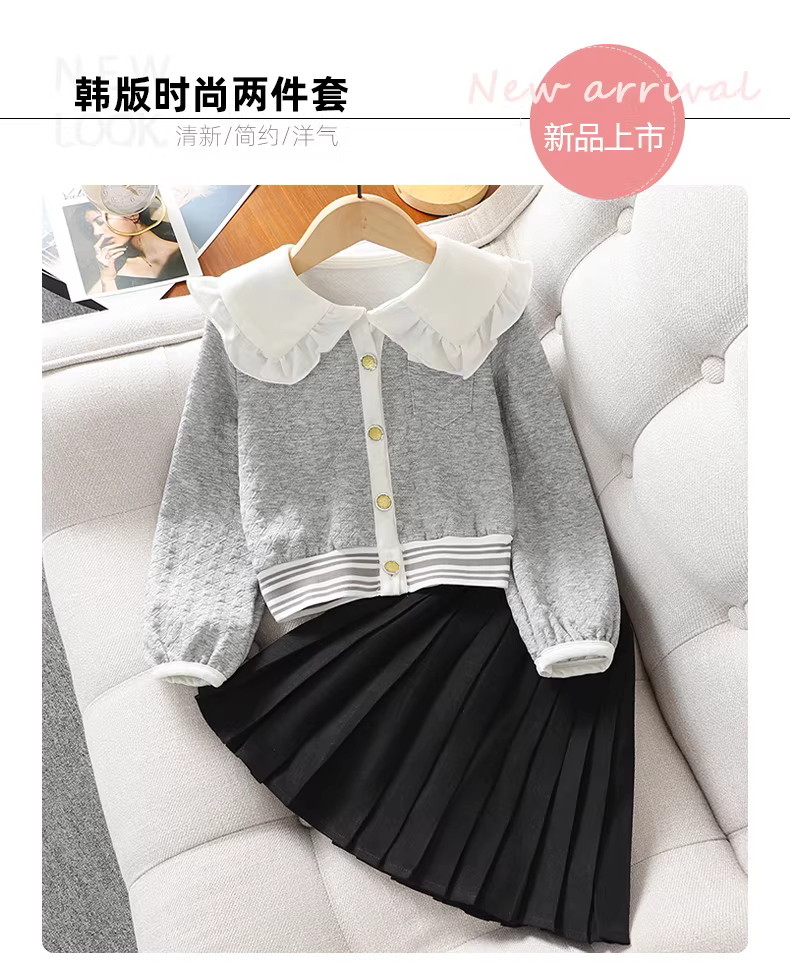 - Bộ đồ bé gái xuân thu 2025 kiểu mới, thời trang cho bé lớn, trang phục mùa xuân, áo khoác cổ búp bê, chân váy xếp ly, bộ hai mảnh