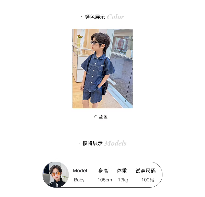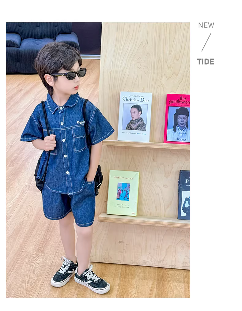 - Bộ đồ denim hè cho bé trai 2025, thời trang trẻ em mới, áo sơ mi ngắn tay cá tính, bộ hai mảnh mỏng đẹp cho bé