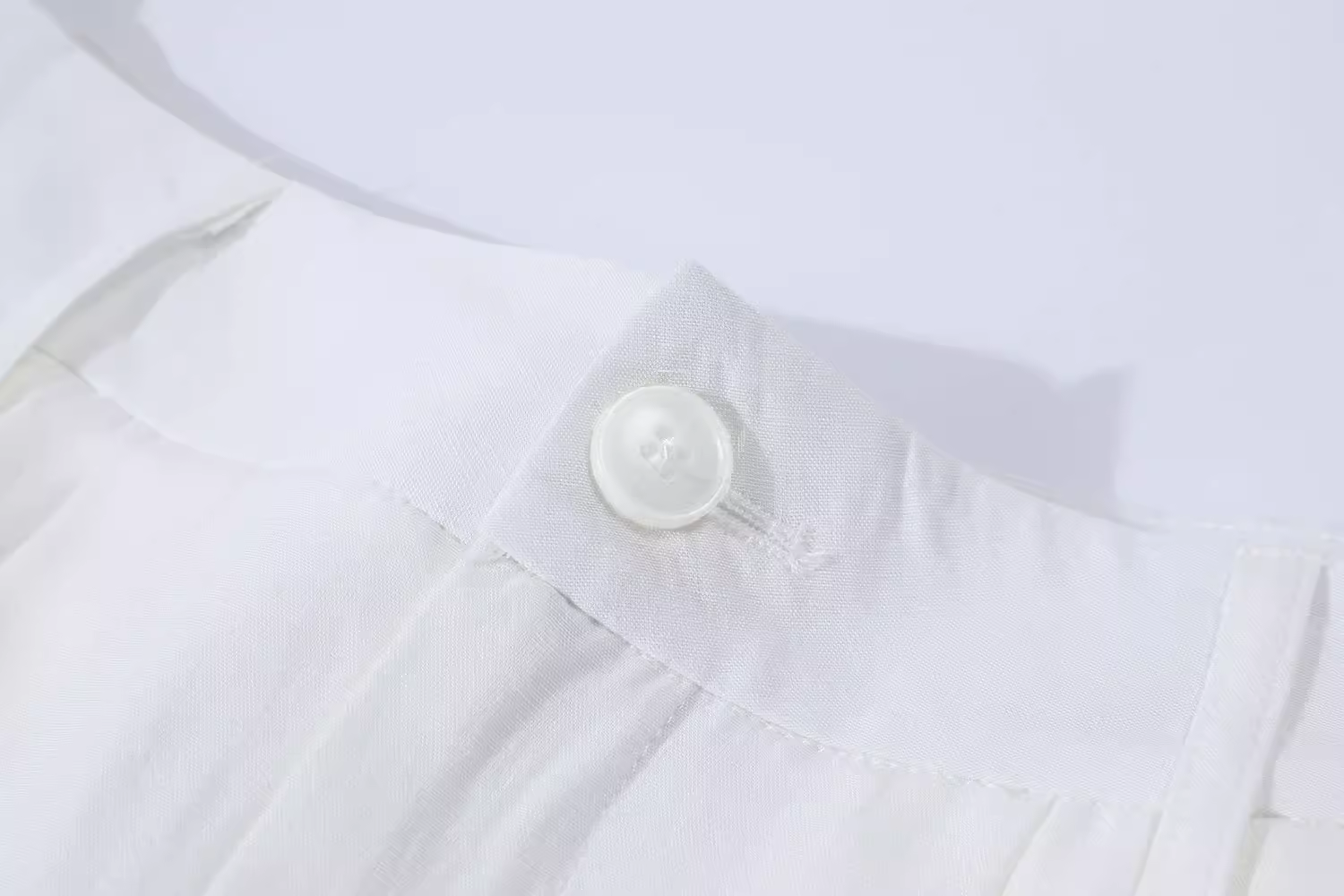 - Bộ đồ hai mảnh hè nữ phong cách Hàn Quốc: áo thun ngắn tay cổ halter, eo thắt dây, tay áo trễ vai, quần ống rộng màu trắng