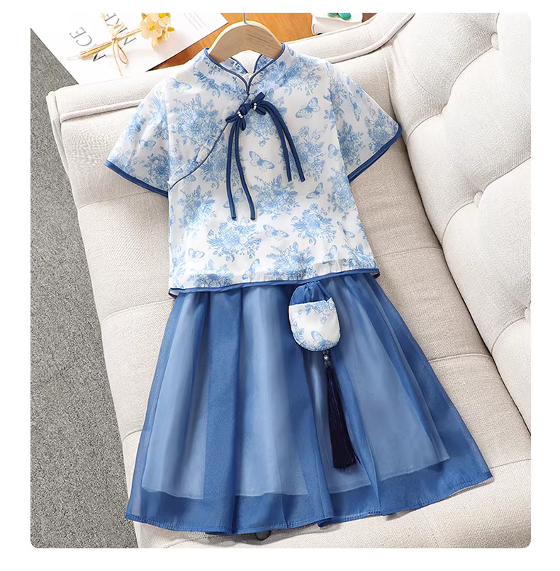Bộ đồ kiểu Trung Hoa dành cho bé gái mẫu mới 2025 dành cho trẻ lớn, quần áo mùa hè, kiểu áo Tang cổ điển, họa tiết men xanh trắng, phong cách Trung Hoa Dân Quốc, bộ hai mảnh
