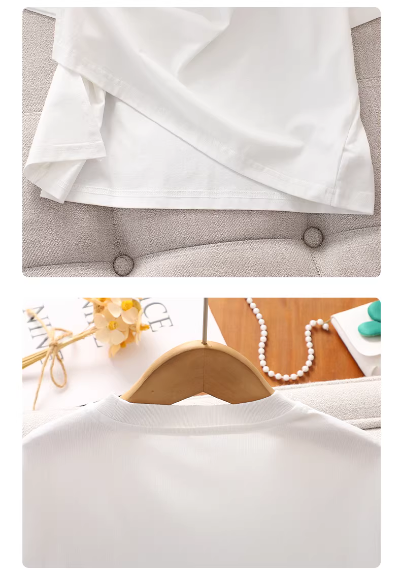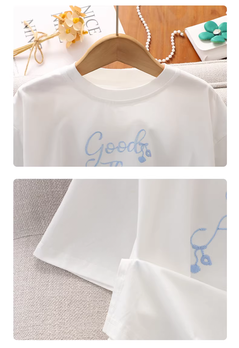 - Bộ đồ nữ bé gái hè 2025 kiểu mới áo thun ngắn tay xẻ tà mùa hè chất liệu mỏng quần short denim ren trẻ em