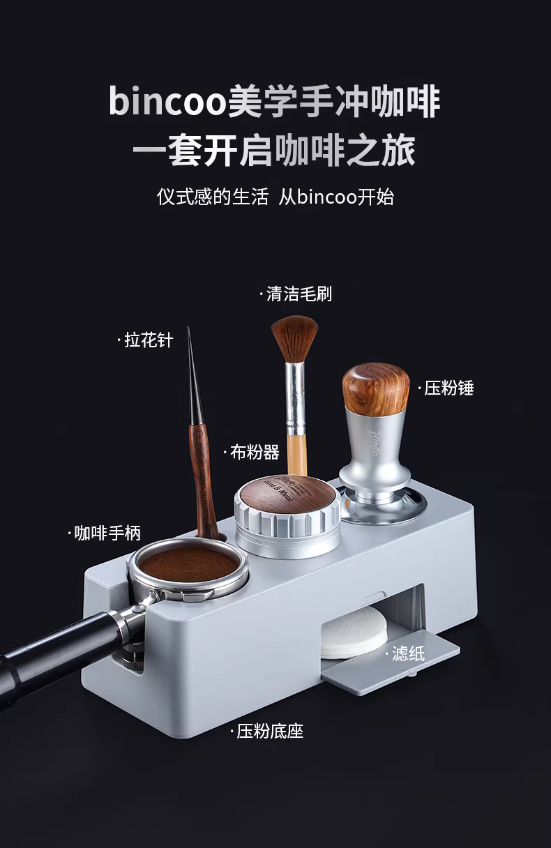 - Bộ dụng cụ nén cà phê Bincoo ba món gồm đế, búa nén, tay cầm đa năng, khăn lau và dụng cụ phân phối bột 51/58mm