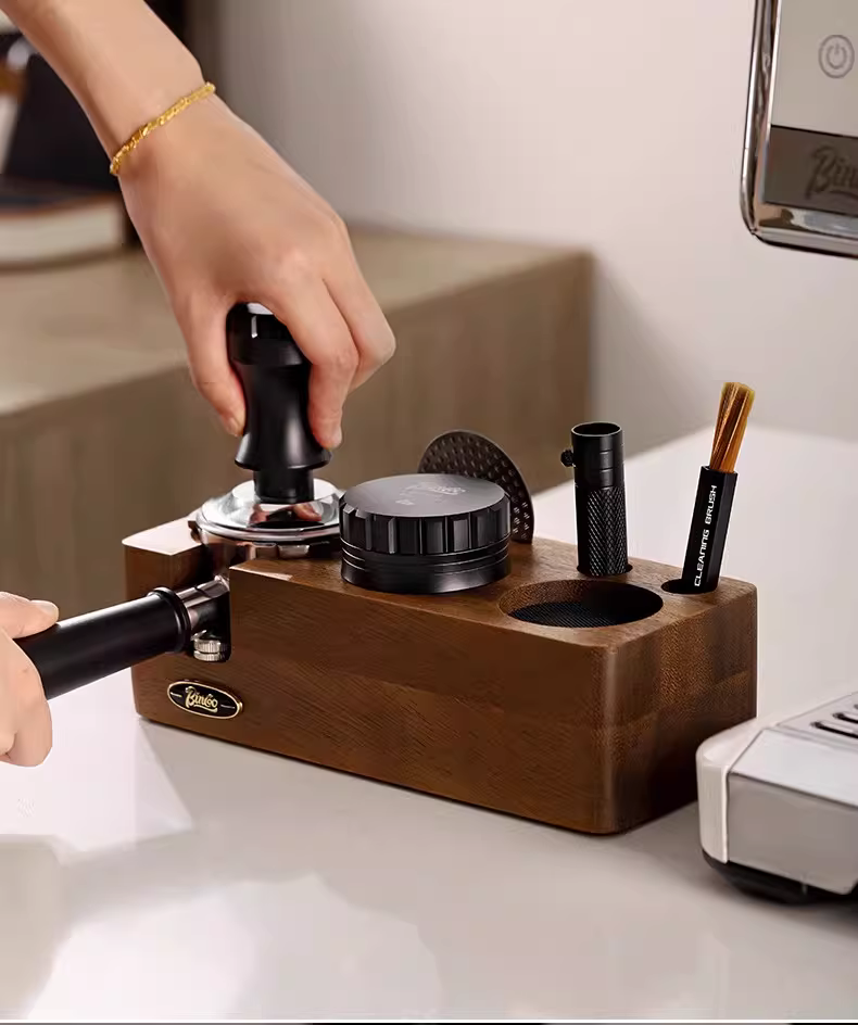 - Bộ dụng cụ pha cà phê Bincoo bằng gỗ óc chó, gồm đế ép cà phê, búa ép cà phê, dụng cụ phân phối bột cà phê, bộ ba món kiểu Ý 51/58mm