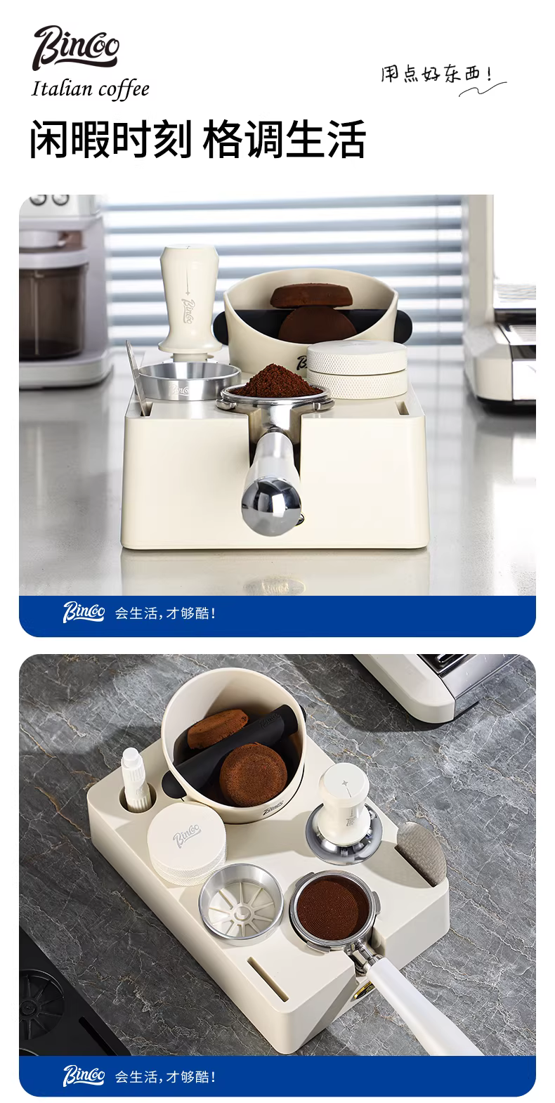 Bộ dụng cụ pha cà phê Bincoo: đế ép cà phê đa năng, hộp đựng bã cà phê, dụng cụ phân phối cà phê, tay cầm ép cà phê
