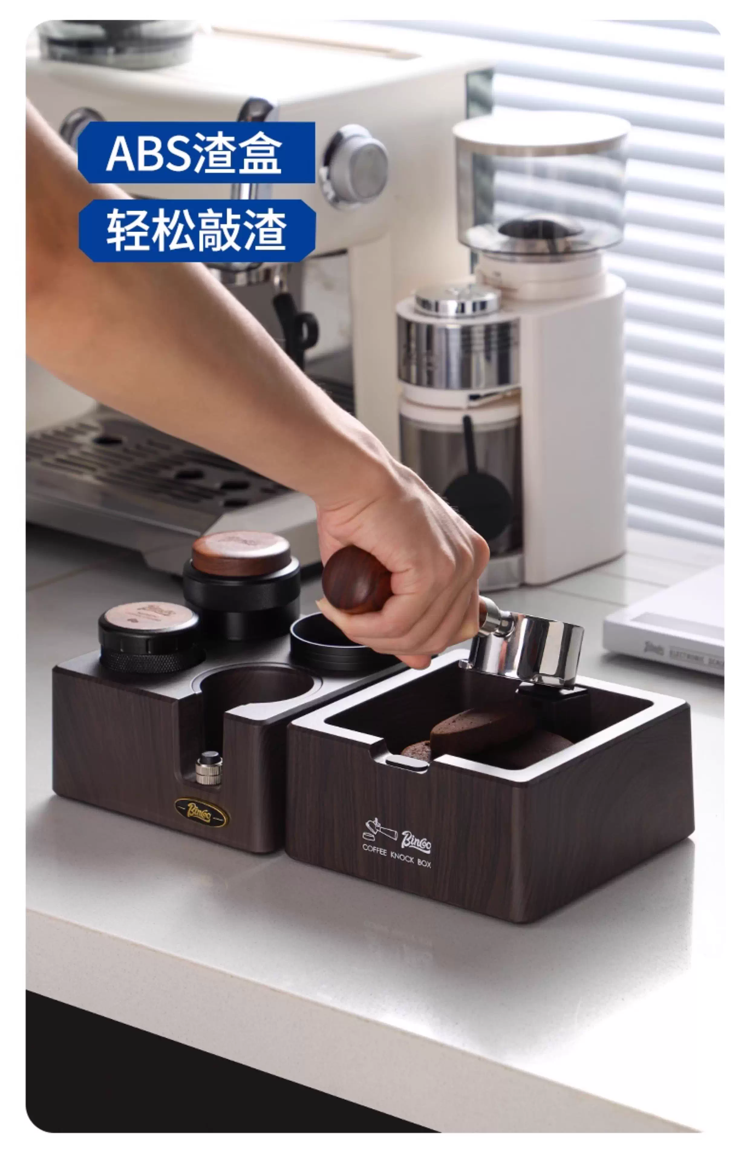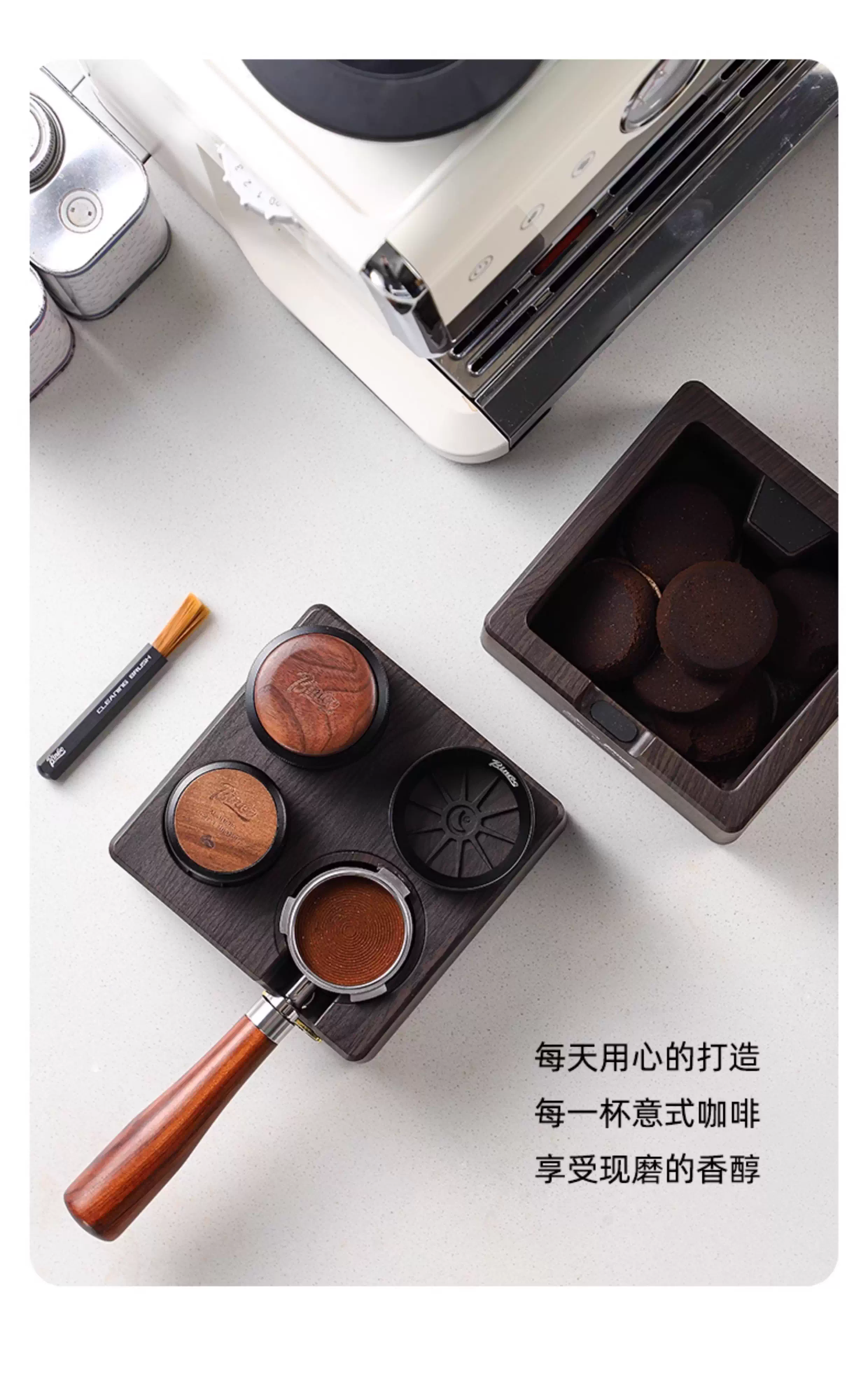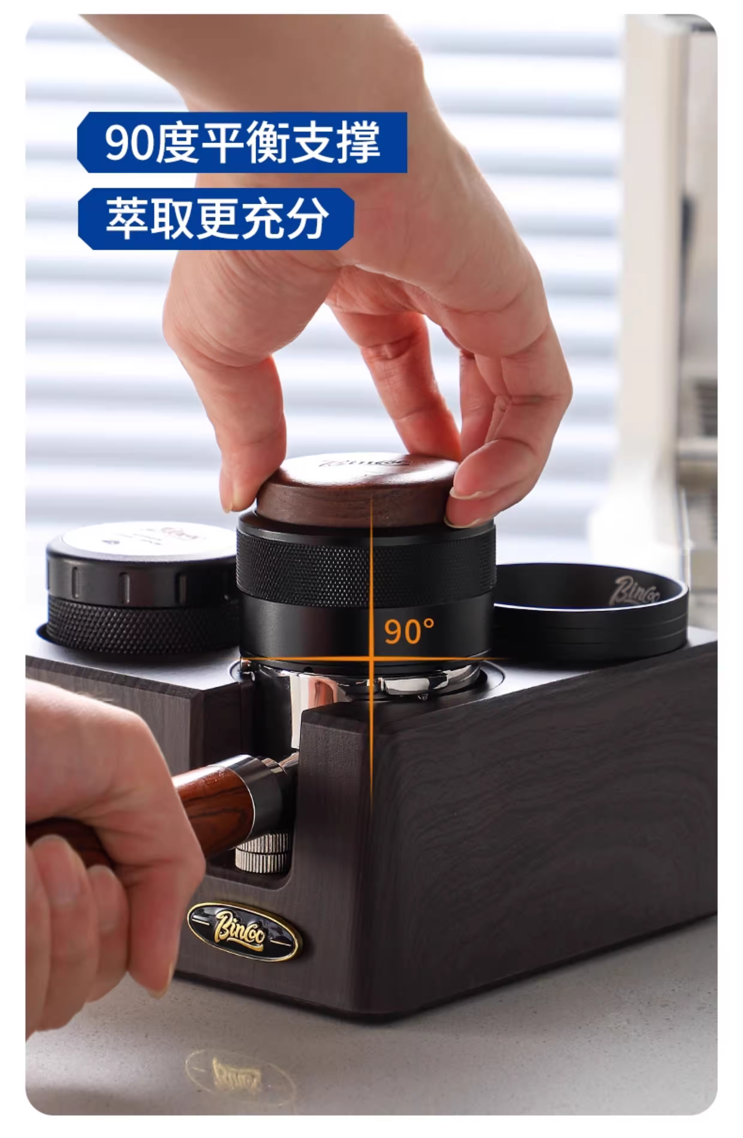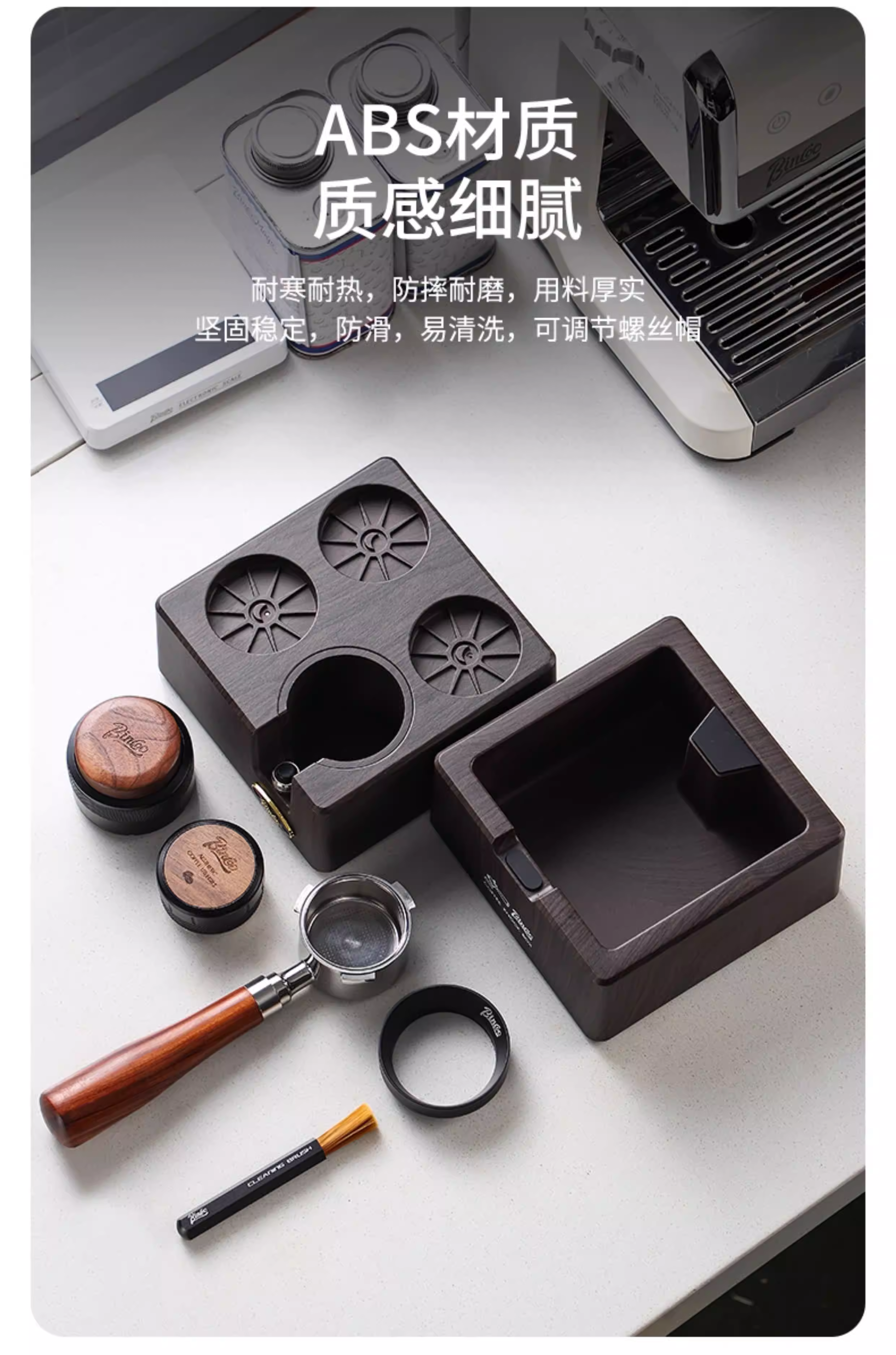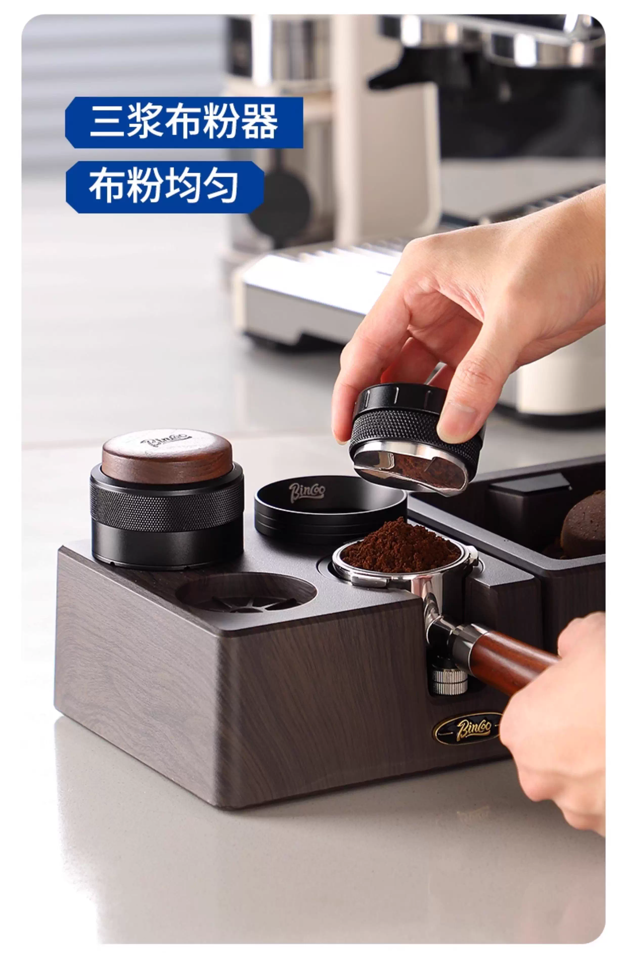 - Bộ dụng cụ pha cà phê Bincoo gồm ba món: đế, dụng cụ nén cà phê và khăn phân phối cà phê hai trong một, máy pha cà phê lực không đổi 51/58mm